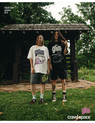 The collection features two tees: the Glabbit Tee, is the first ever black piece from Glim, and features 4 prints like all Glim t shirts. The outside front shows the glabbit, the collection name and the glim logo; the outside back shows the rabbit leaving its “crawl space”; the inside front is a huge rabbit mask that looks sick when worn reversed or when lifted up as a mask when worn right side out and the inside back is the classic glim butter care instructions( pay attention to what’s on the plate this is always an easter egg hinting at the next collection). The Glail Tee is a white tee with the same set up as the glabbit tee but, ya know, with a glail instead. The inside mask is a collection of sea shells formed into a face that Glim has named “shelly”, and the outside back is a diagram of a crawl space drawn by one of glim’s favorite artists, @alexswisher.