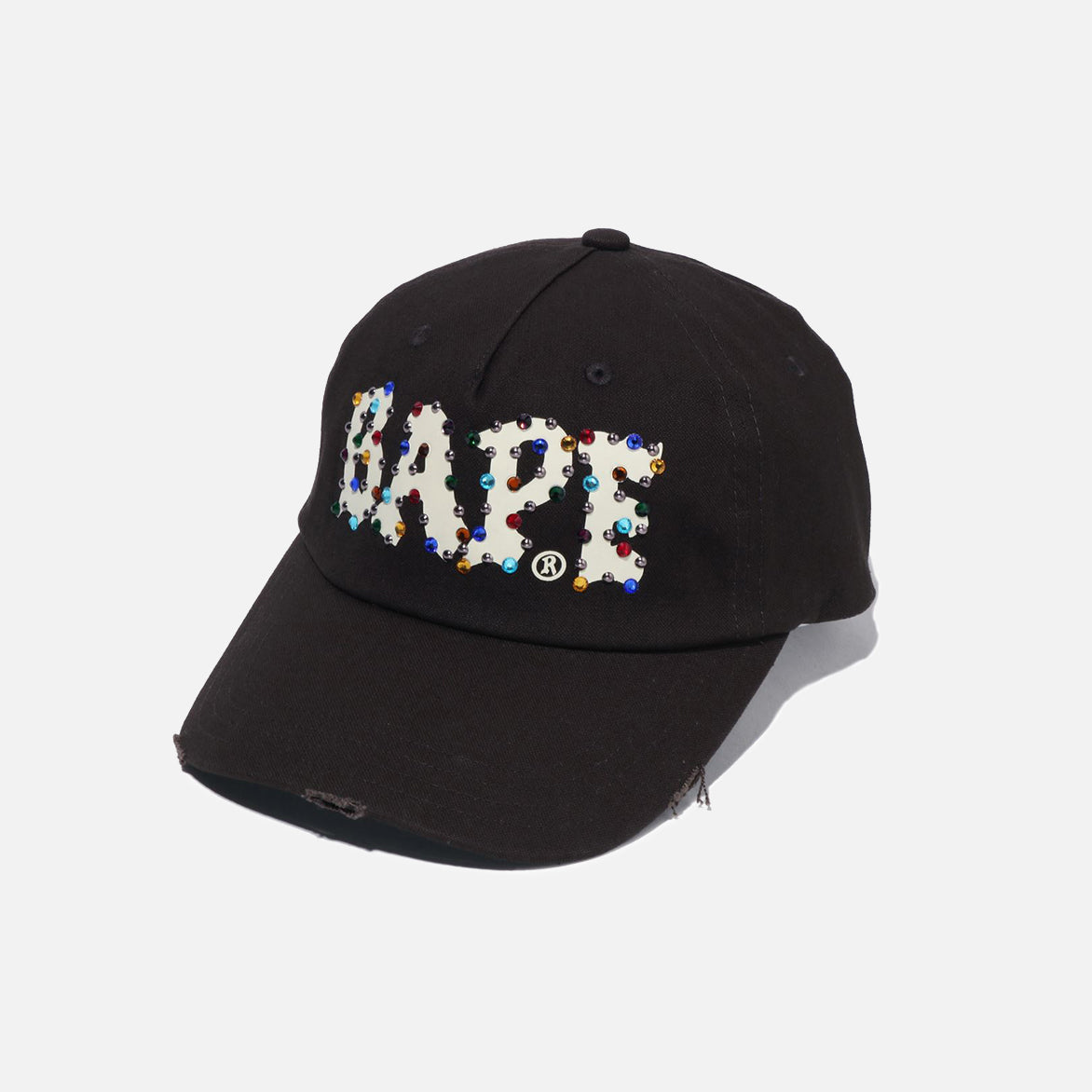 The Bape Color Stone Panel cap is decorated with rhinestones on the BAPE logo and includes an adjustable strap for a personalized fit. 100% polyester.