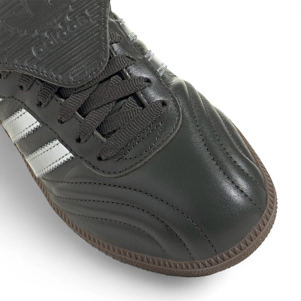 This indoor soccer shoe-turned-streetwear-staple busts out in a big way on the WMNS Samba Long Tongue. Sporting an eye-catching cream dark grey leather upper, this version of the Samba leans into its soccer roots with a tonal folded over rubber tongue, embossed with the adidas Trefoil logo. Silver leather 3-stripes and heel tab, black laces and lining, and curvy stitch details throughout add a lifestyle element. Metallic silver Samba branding on the side and a dark gum rubber sole complete the design.