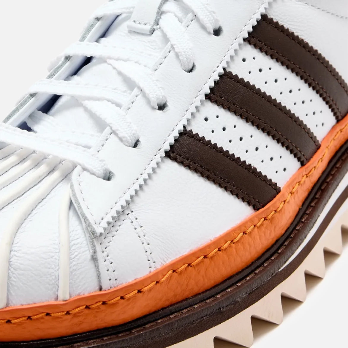 Edison Chen injects a shot of caffeine into an adidas Original on the pair's latest collaboration, the CLOT By Edison Chen x adidas Superstar "Coffee". Chen's latest reimagining of an iconic adidas style features a clean white premium leather upper overlaid with serrated brown leather 3-Stripes and heel tab, like a dash of coffe in a cup of cream. Micr-perforations hit the side and the heel tab, while an orange tumbled leather mudguard wraps the entire bottom of the upper. The signature shell toe is redone in premium white leather, and a brown leather welt is pressed onto a striking cream, white and brown ripple sole to complete the design.