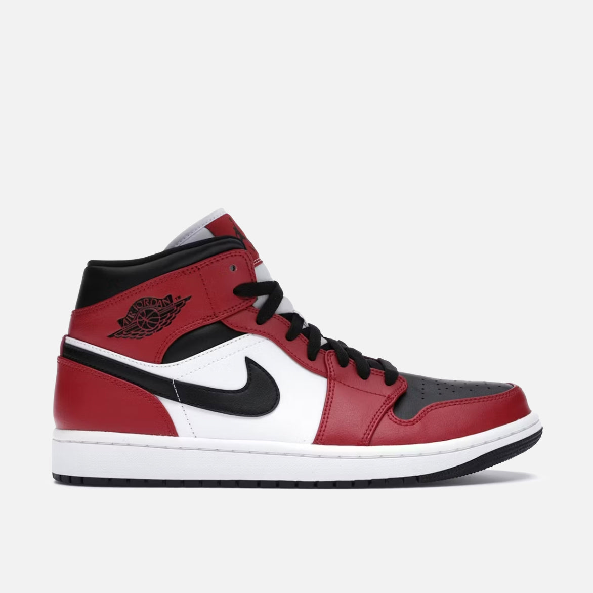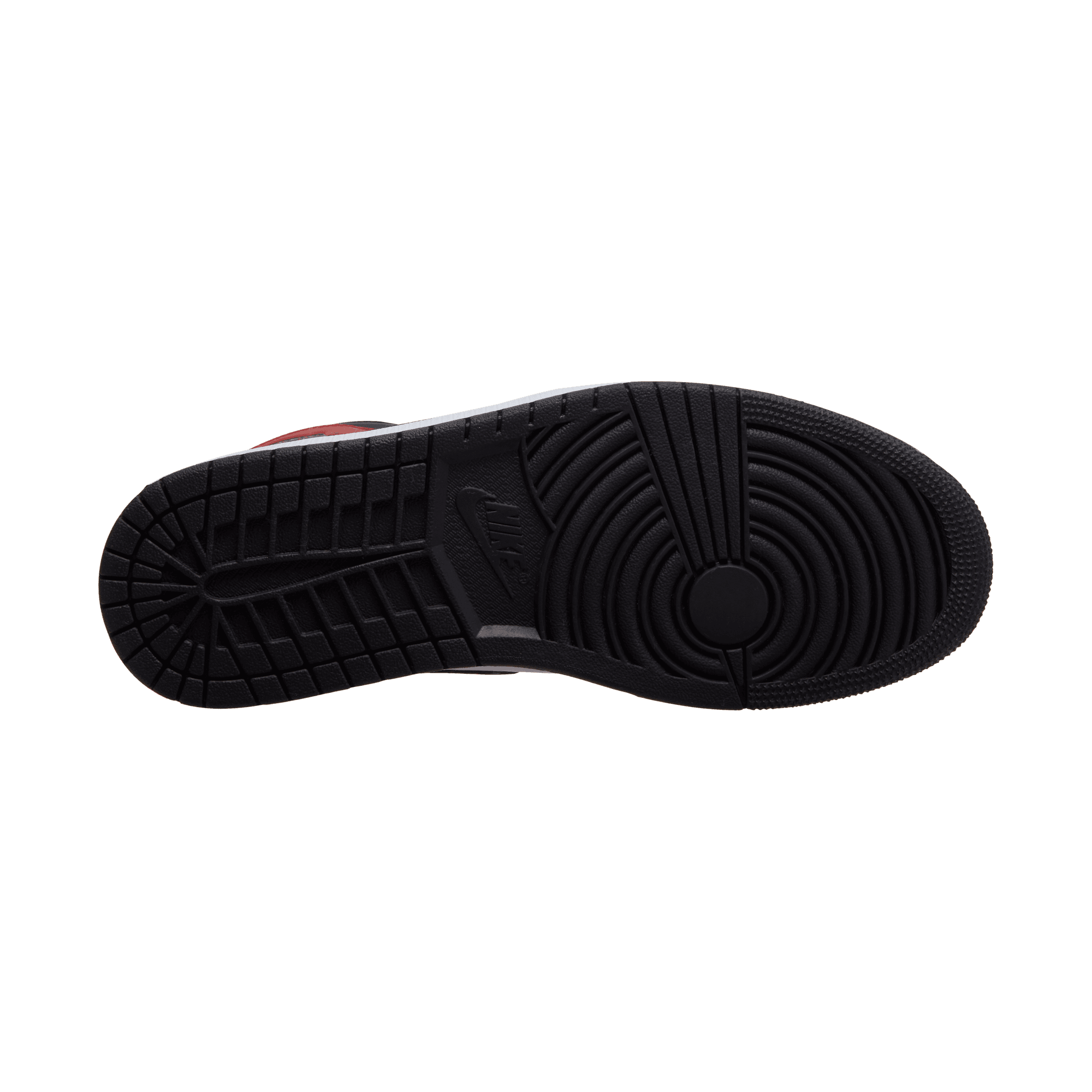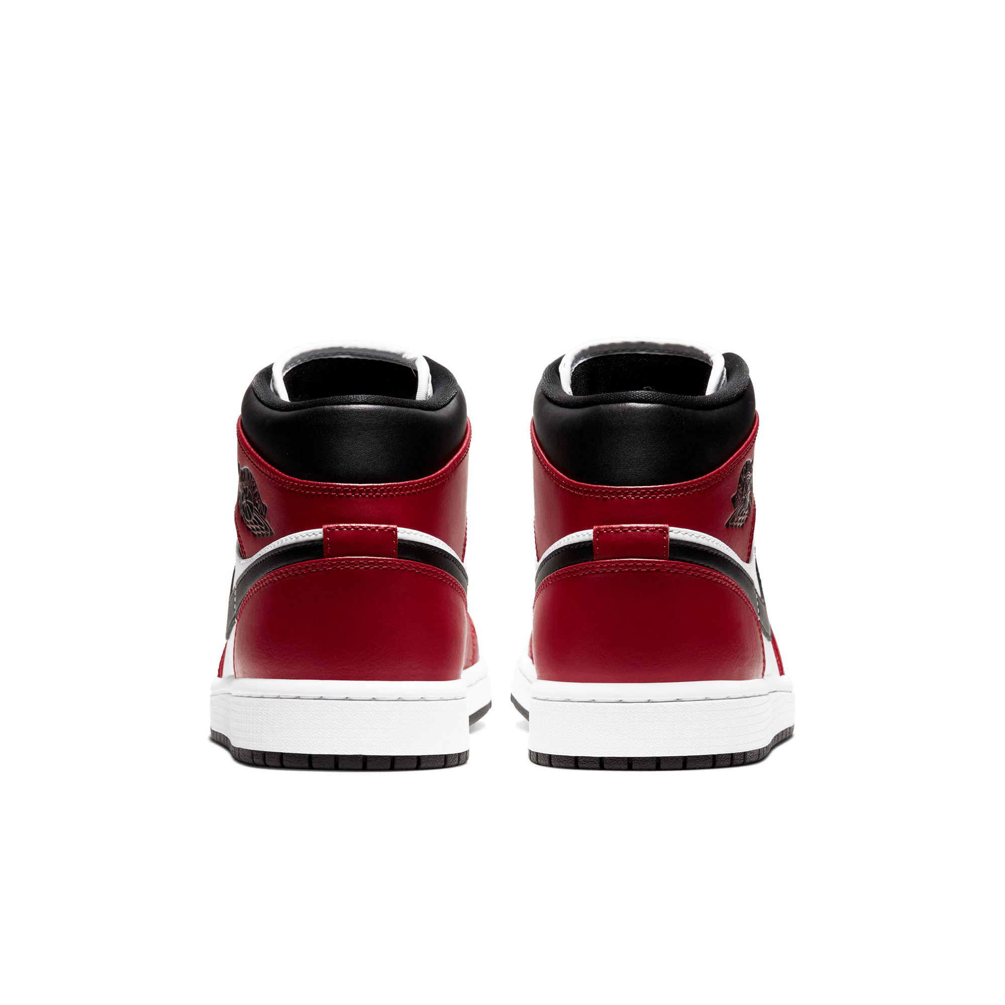 Two iconic OG colorways of the original Air Jordan combine to form another classic Bulls-inspired look on the Air Jordan 1 Mid "Chicago Black Toe". This mid top version of the classic silhouette takes the classic "Chicago" blocking of red overlays on smooth white leather with a black swoosh and collar, and adds the the signature "Black Toe" of a black toe box and red cap. Black branding on the red tongue tag and Wings logo, black laces, and lining, white midsole and black rubber outsole finish off the historic look.