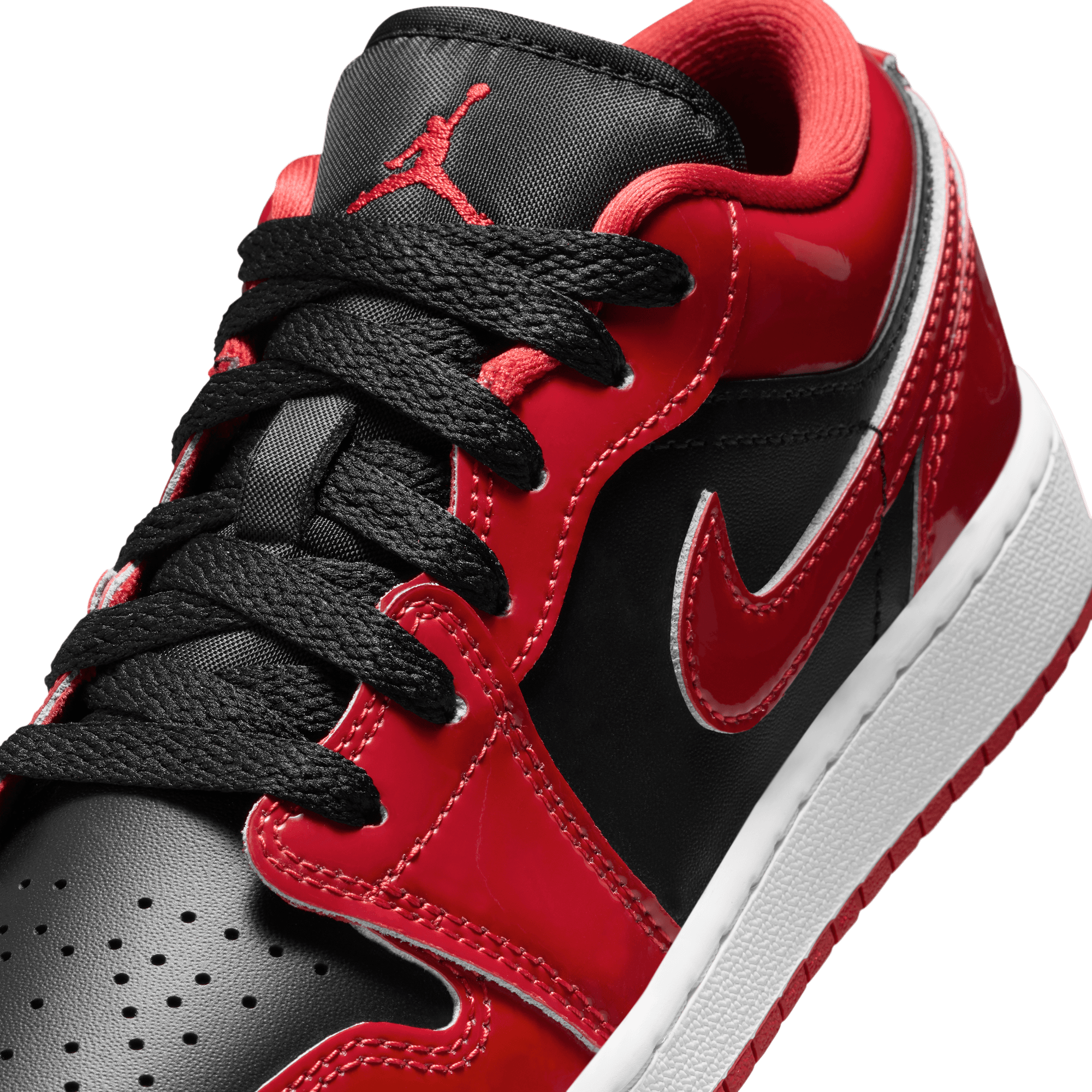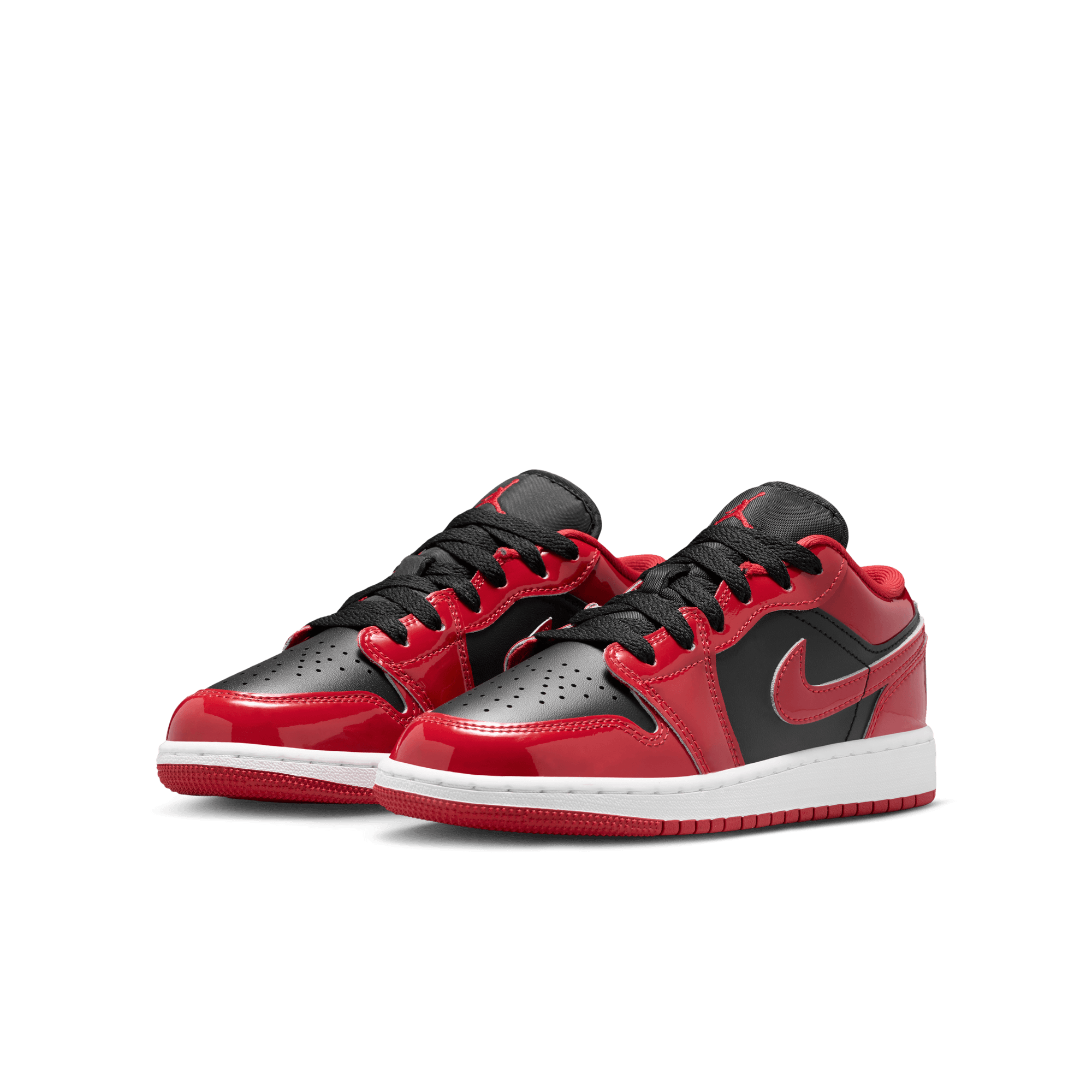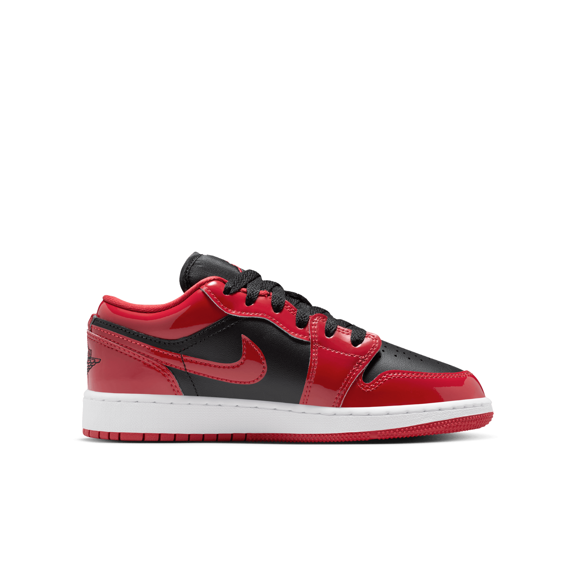 This SE version of the classic silhouette dives back into the ever-present Bulls aesthetic with a shiny twist on the Air Jordan 1 Low SE - Black/White/Varsity Red. The classic style adds luxurious red patent leather to its black smooth leather upper, mimicking the blocking of the iconic "Bred" on the toe. It's accented with a black tongue tag, laces and lining, along with black Wings logo on the heel. A white midsole and red rubber outsole finish off the look of this AJ1 Low.