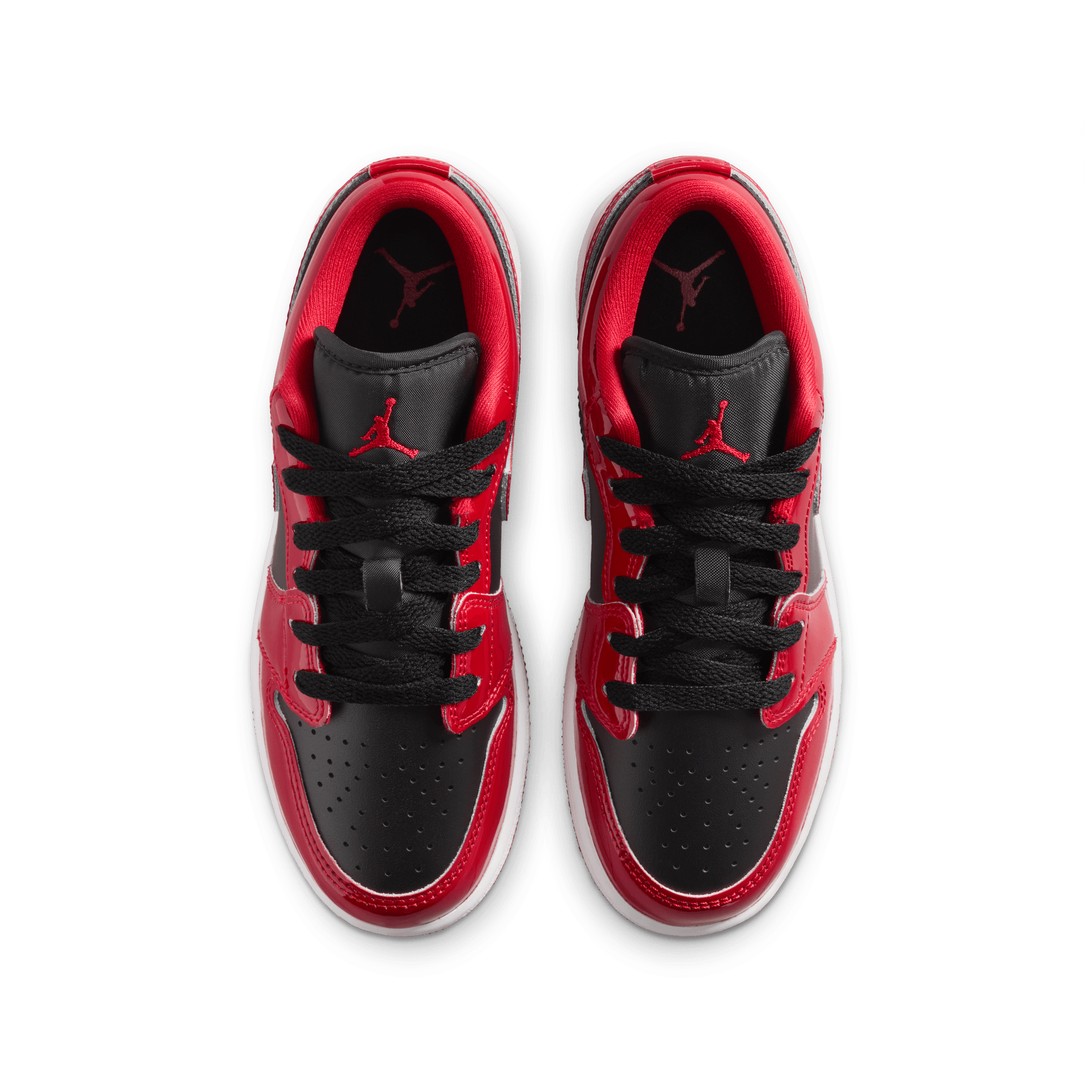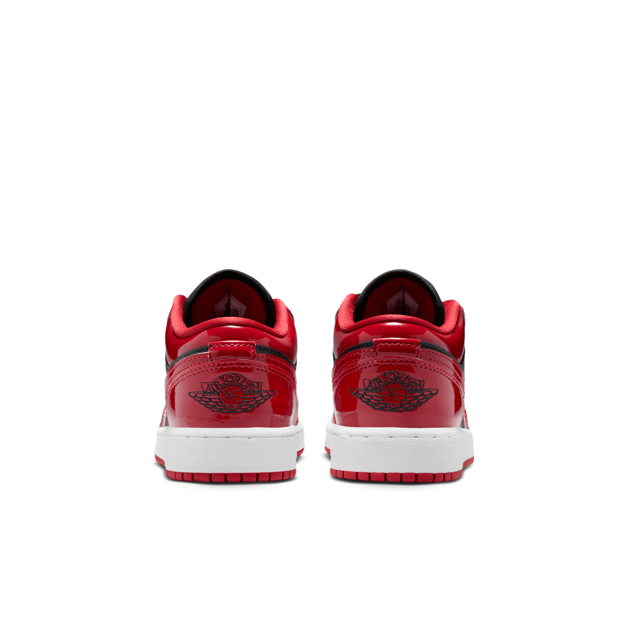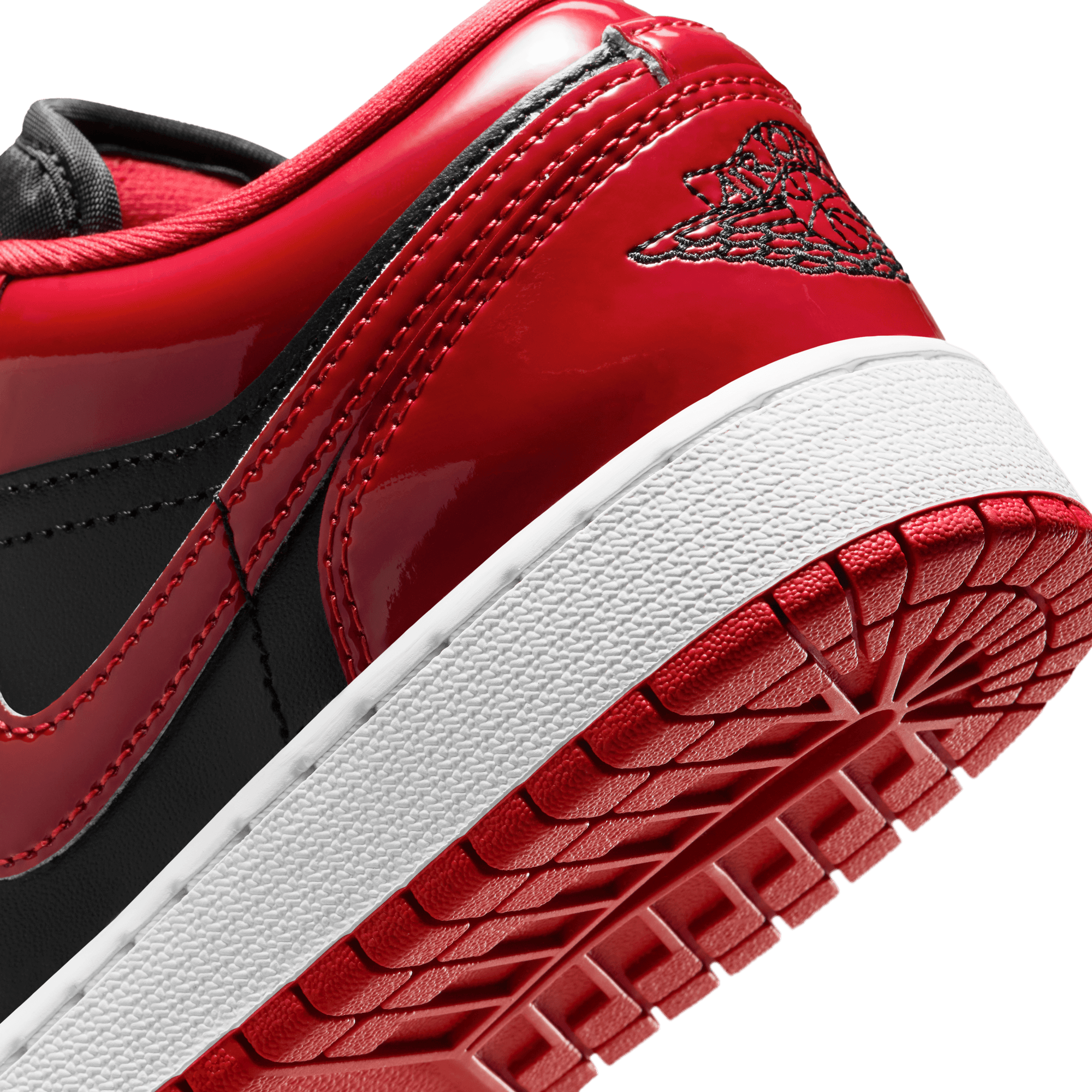This SE version of the classic silhouette dives back into the ever-present Bulls aesthetic with a shiny twist on the Air Jordan 1 Low SE - Black/White/Varsity Red. The classic style adds luxurious red patent leather to its black smooth leather upper, mimicking the blocking of the iconic "Bred" on the toe. It's accented with a black tongue tag, laces and lining, along with black Wings logo on the heel. A white midsole and red rubber outsole finish off the look of this AJ1 Low.