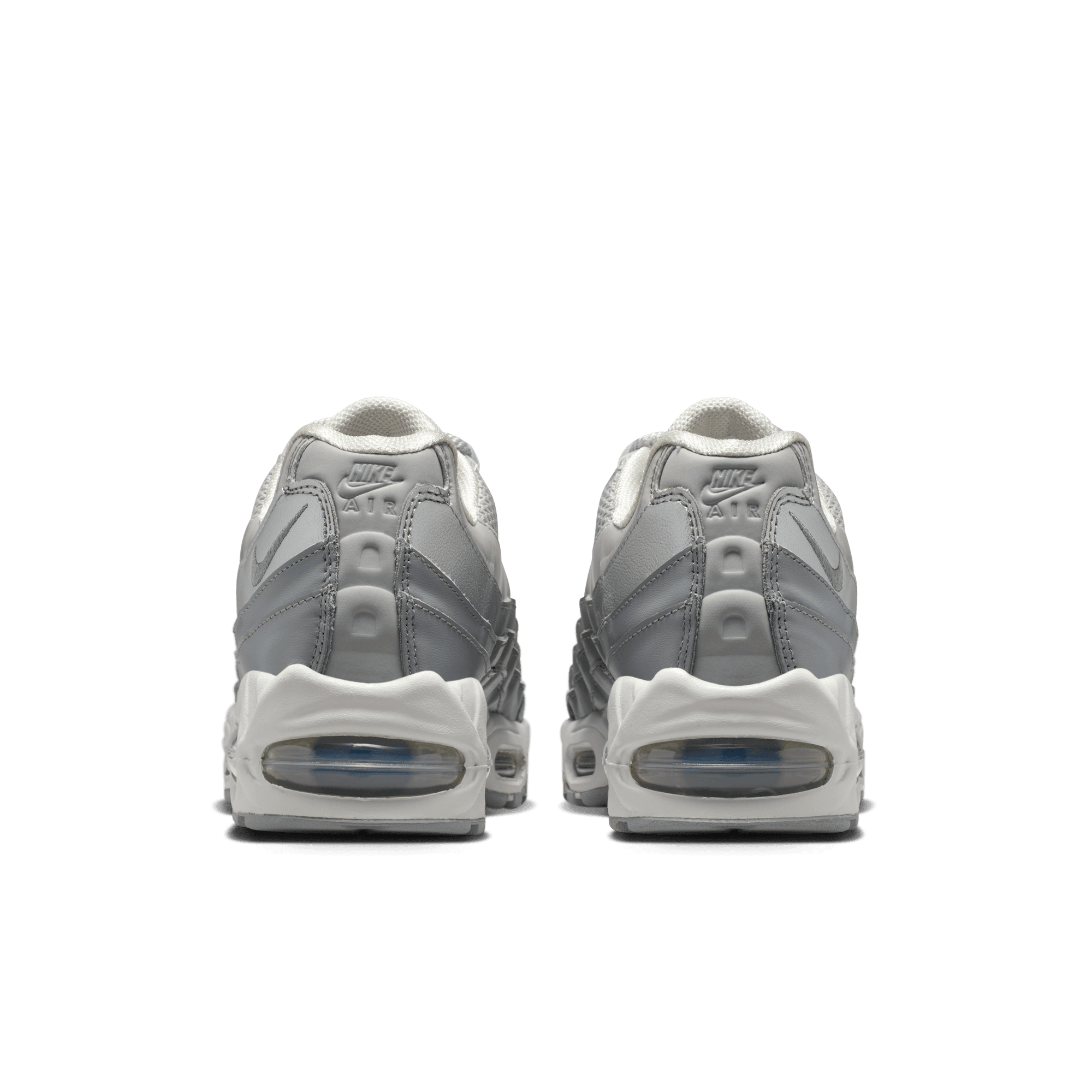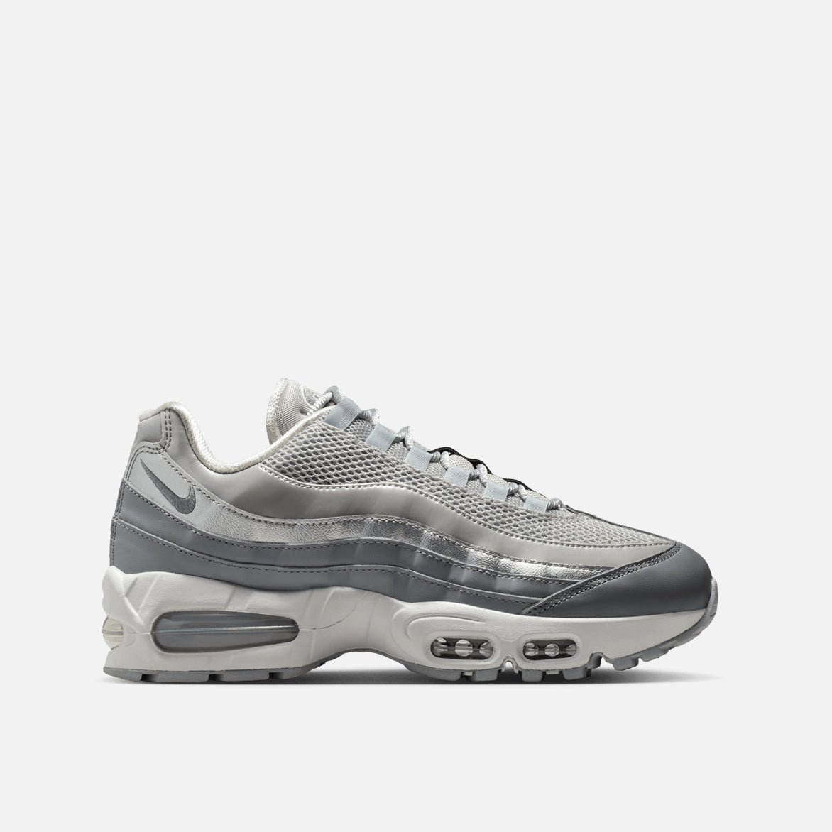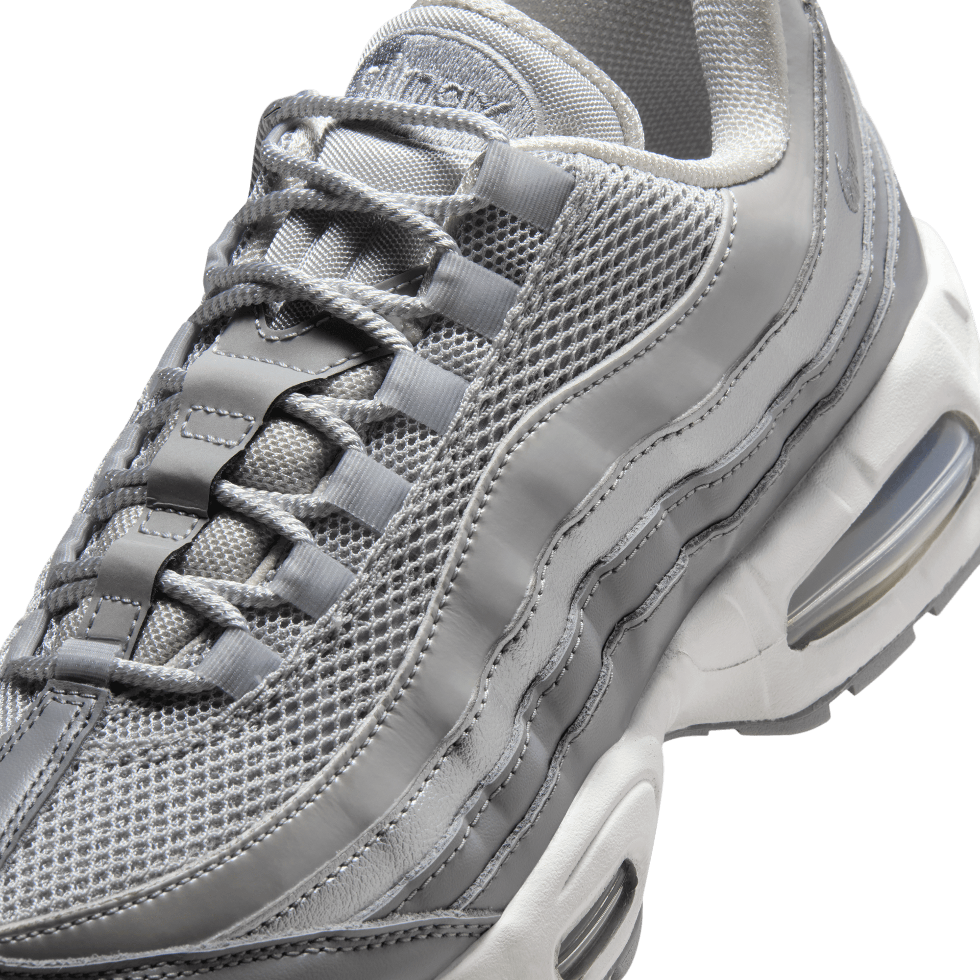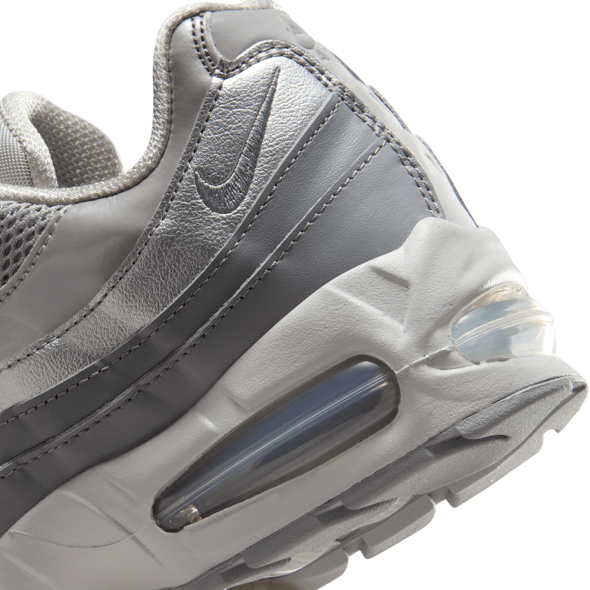 The Air Max 95 continues its 30th anniversary celebration this muted women's exclusive version of the OG "Big Bubble" design: the WMNS Air Max 95 SE "Grey Fog". The multi-layered upper combines multiple tones of grey premium leather wavy panels with a single silver layer in the middle, like a silver lining amongst the clouds. A white mesh saddle with a grey leather toe cap, grey accents on the branding and eyelets, silver laces, white lining, detail the upper. The aforementioned bigger Max Air units located in the forefoot and heel of the chunky white midsole contain a blue hue, while the shoe's original PSI markings are listed on the bottom of the Max Air unit on the grey rubber outsole.