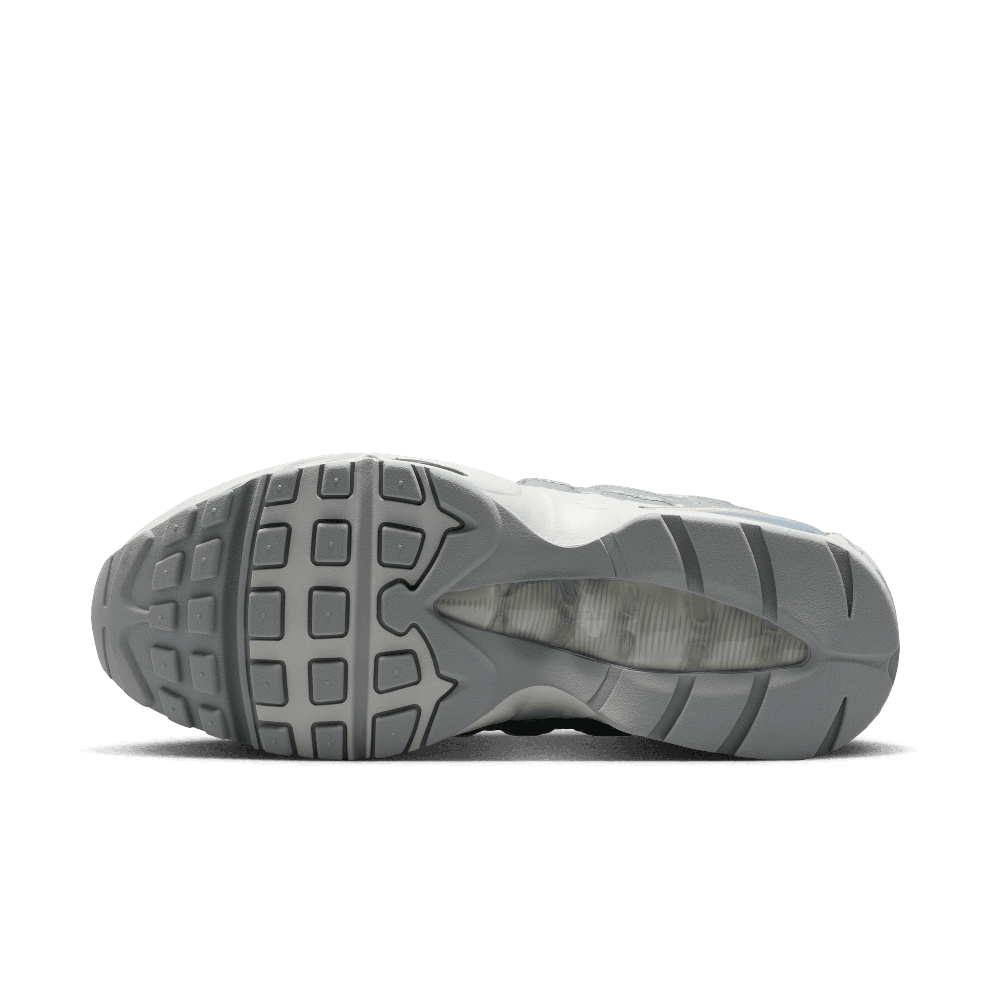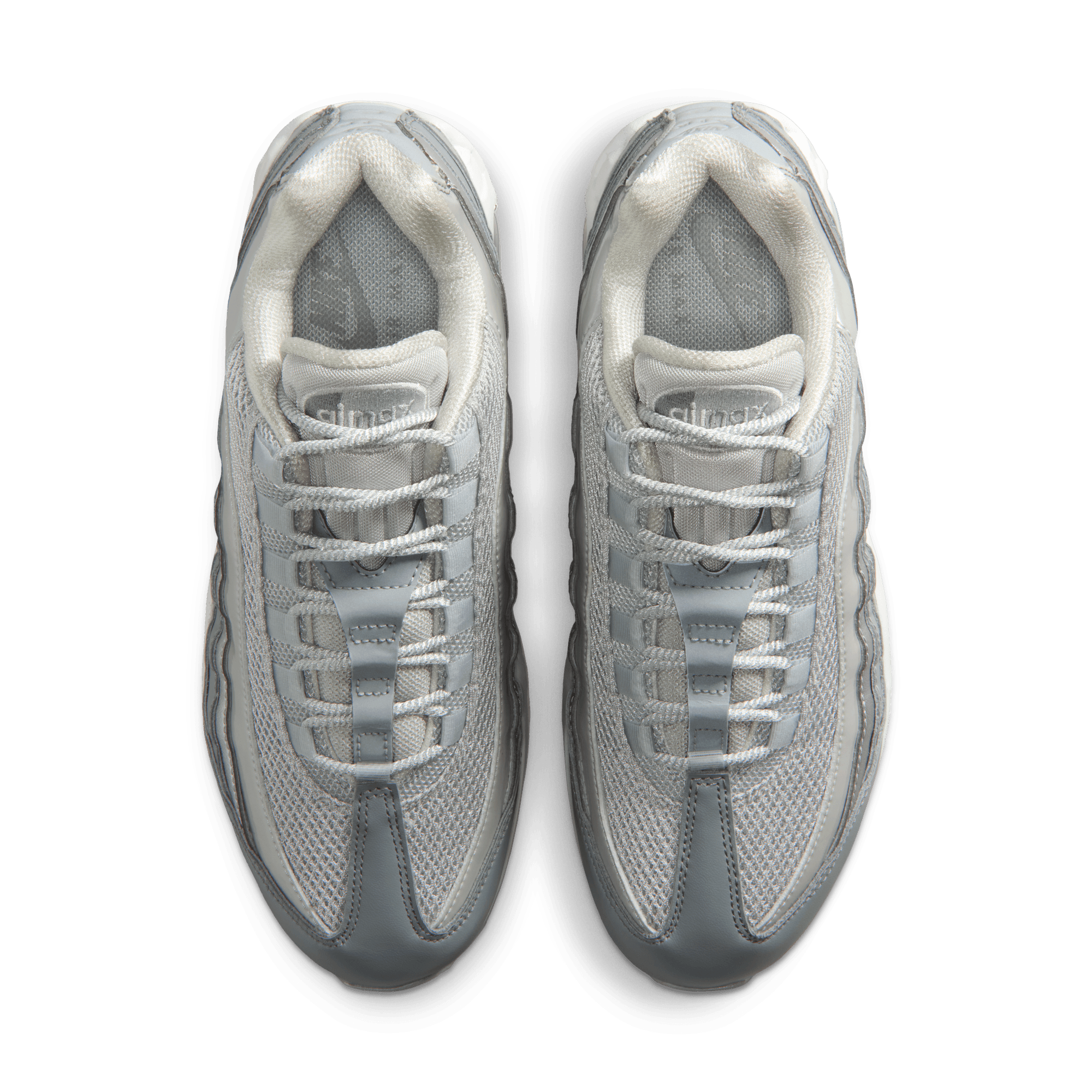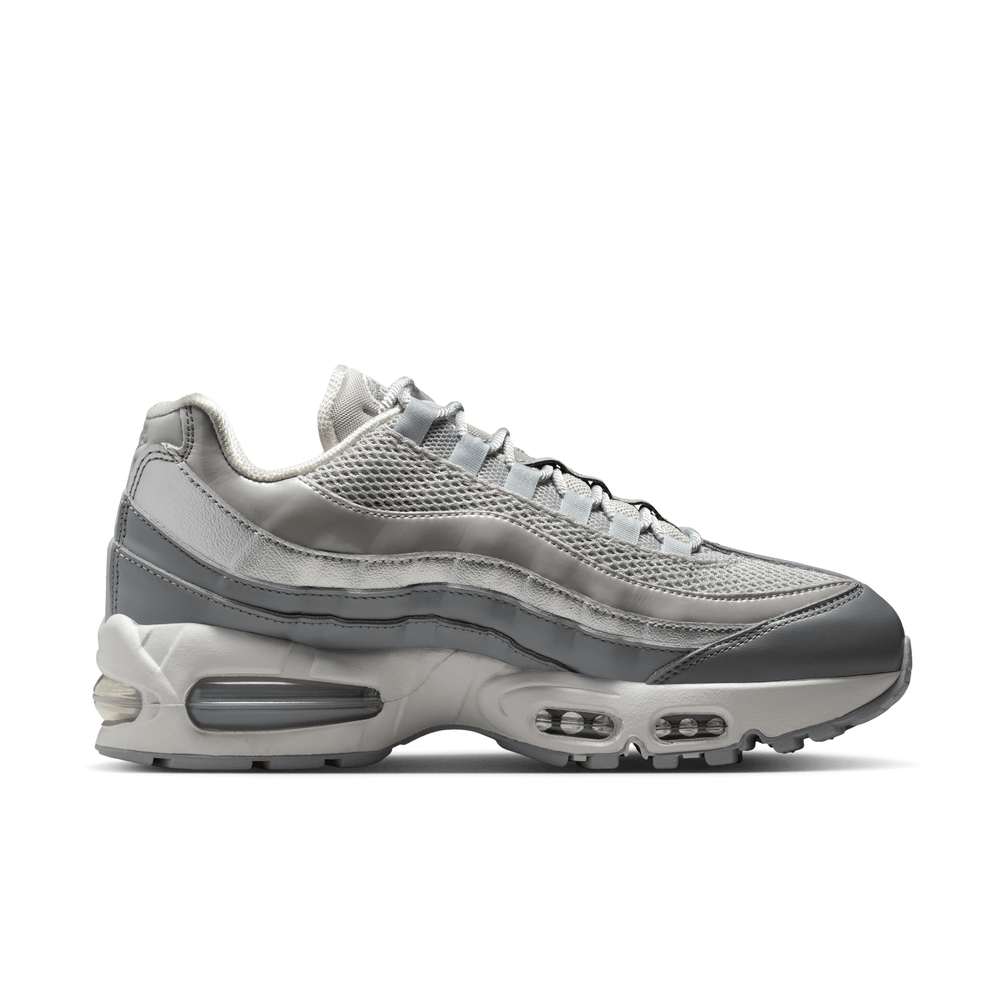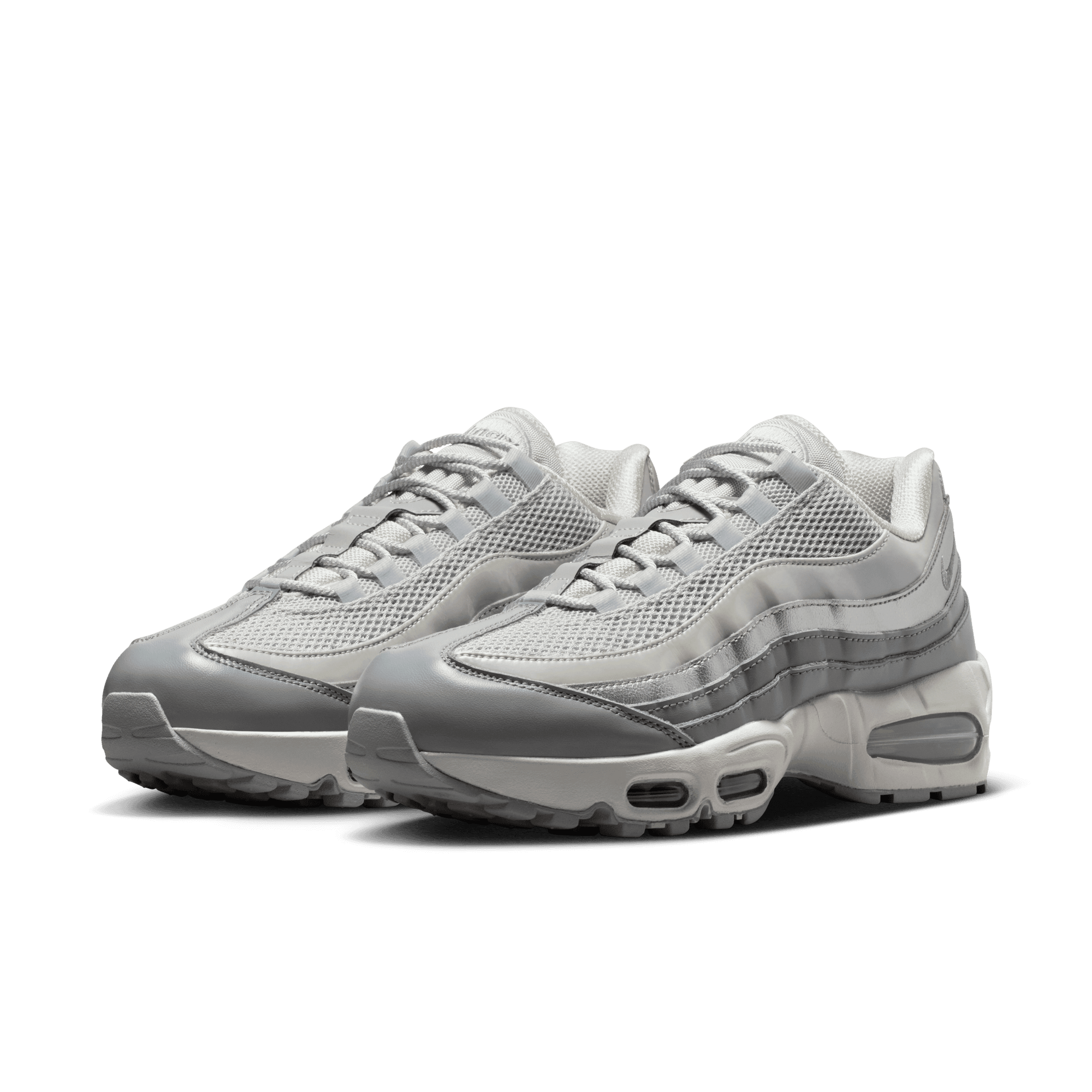 The Air Max 95 continues its 30th anniversary celebration this muted women's exclusive version of the OG "Big Bubble" design: the WMNS Air Max 95 SE "Grey Fog". The multi-layered upper combines multiple tones of grey premium leather wavy panels with a single silver layer in the middle, like a silver lining amongst the clouds. A white mesh saddle with a grey leather toe cap, grey accents on the branding and eyelets, silver laces, white lining, detail the upper. The aforementioned bigger Max Air units located in the forefoot and heel of the chunky white midsole contain a blue hue, while the shoe's original PSI markings are listed on the bottom of the Max Air unit on the grey rubber outsole.