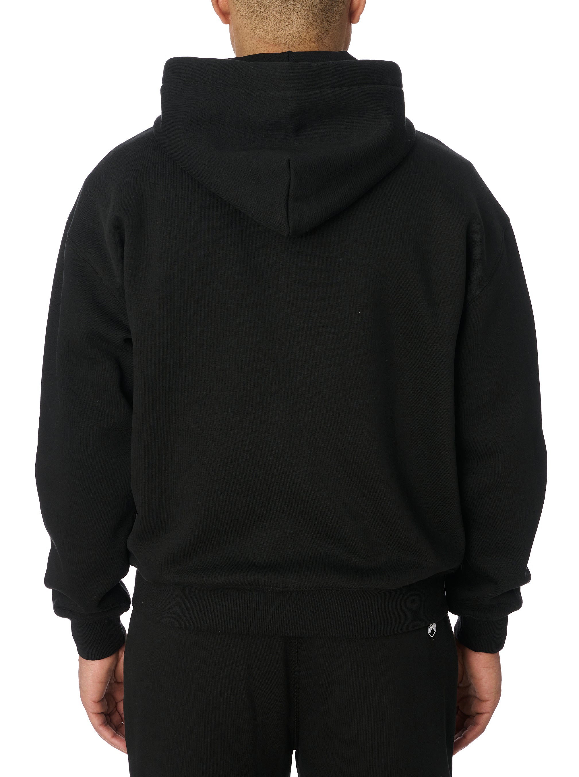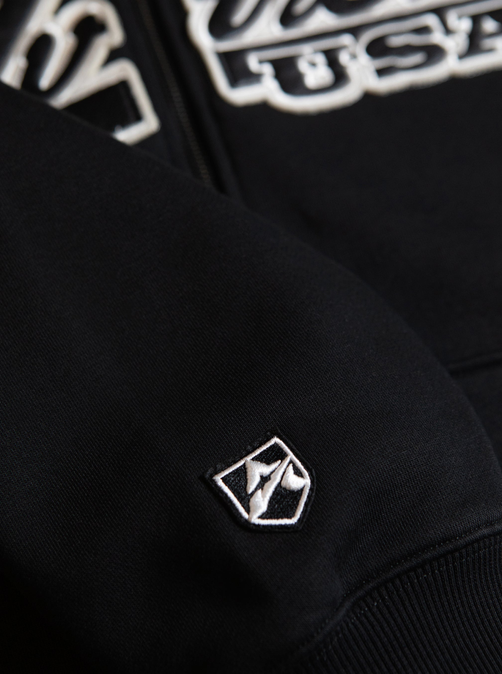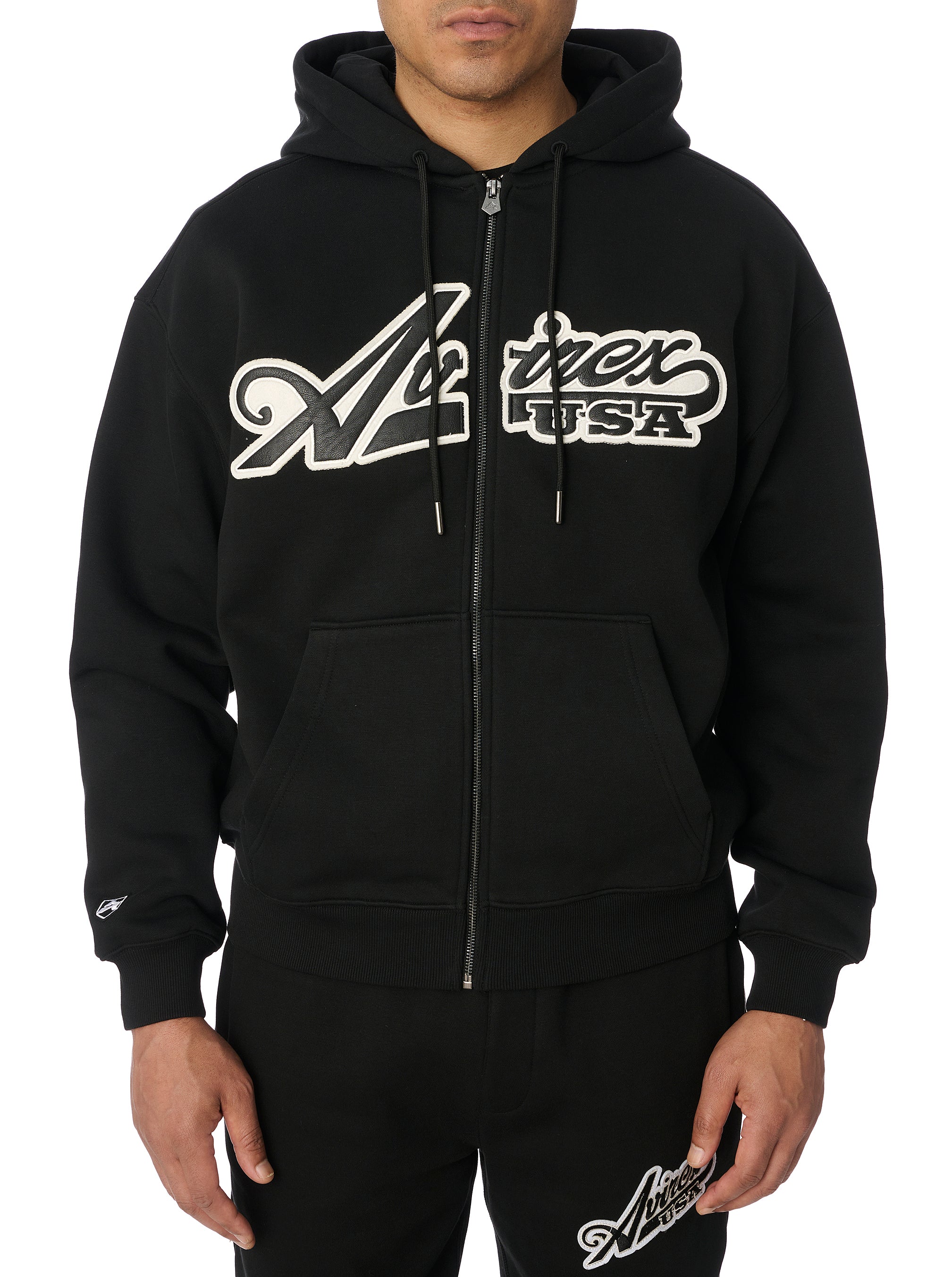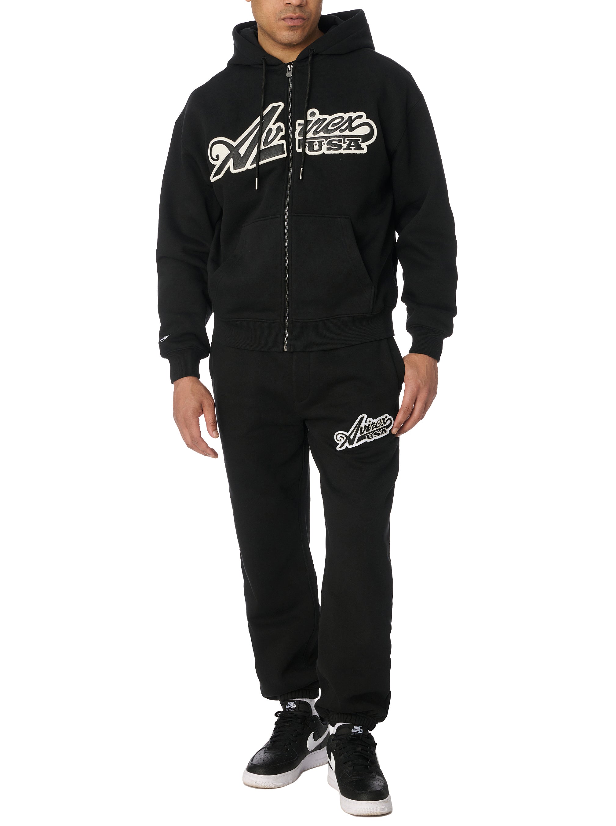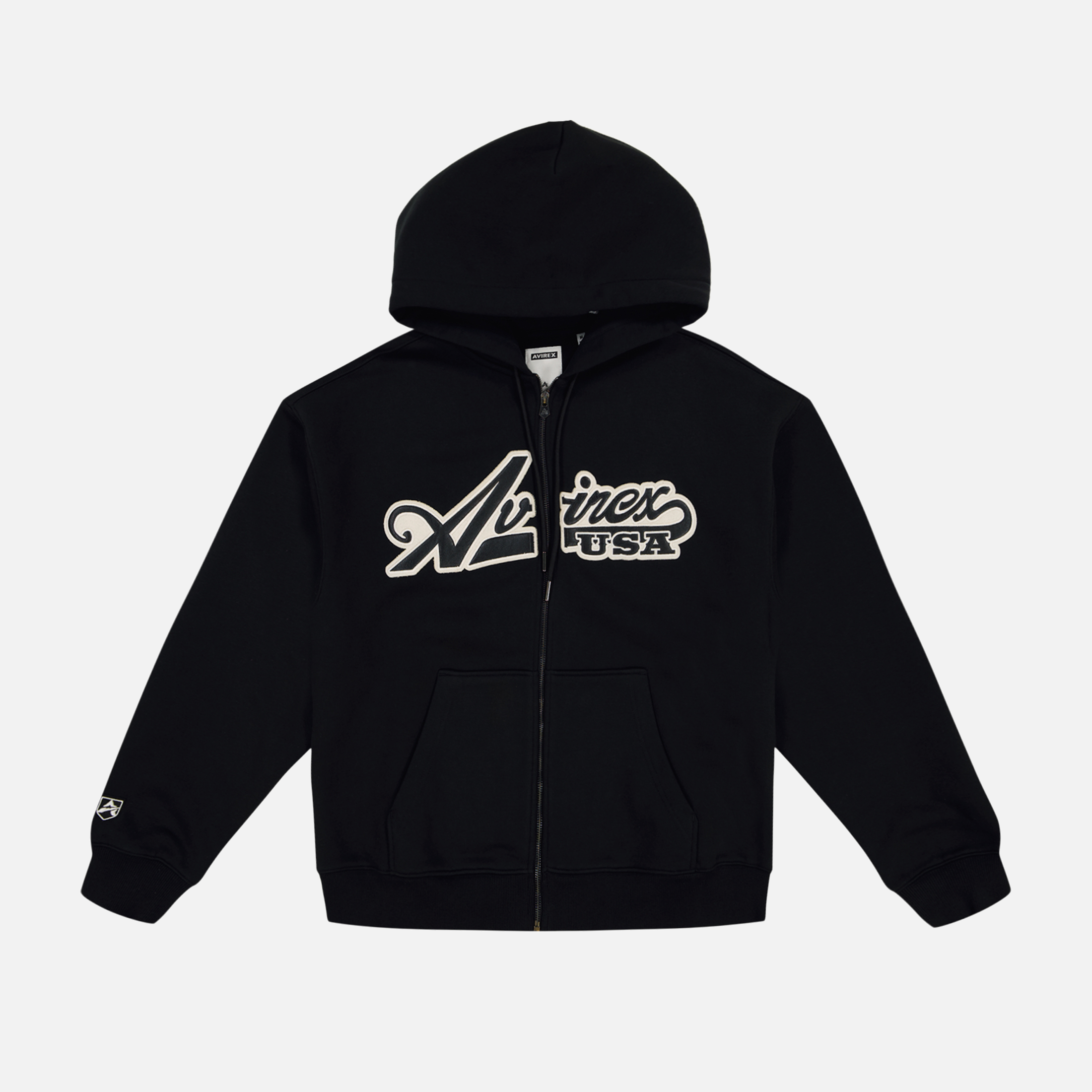 Avirex full-zip cotton fleece hoodie. Features embroidered script lettering across the front and "A" crest patch at cuff.