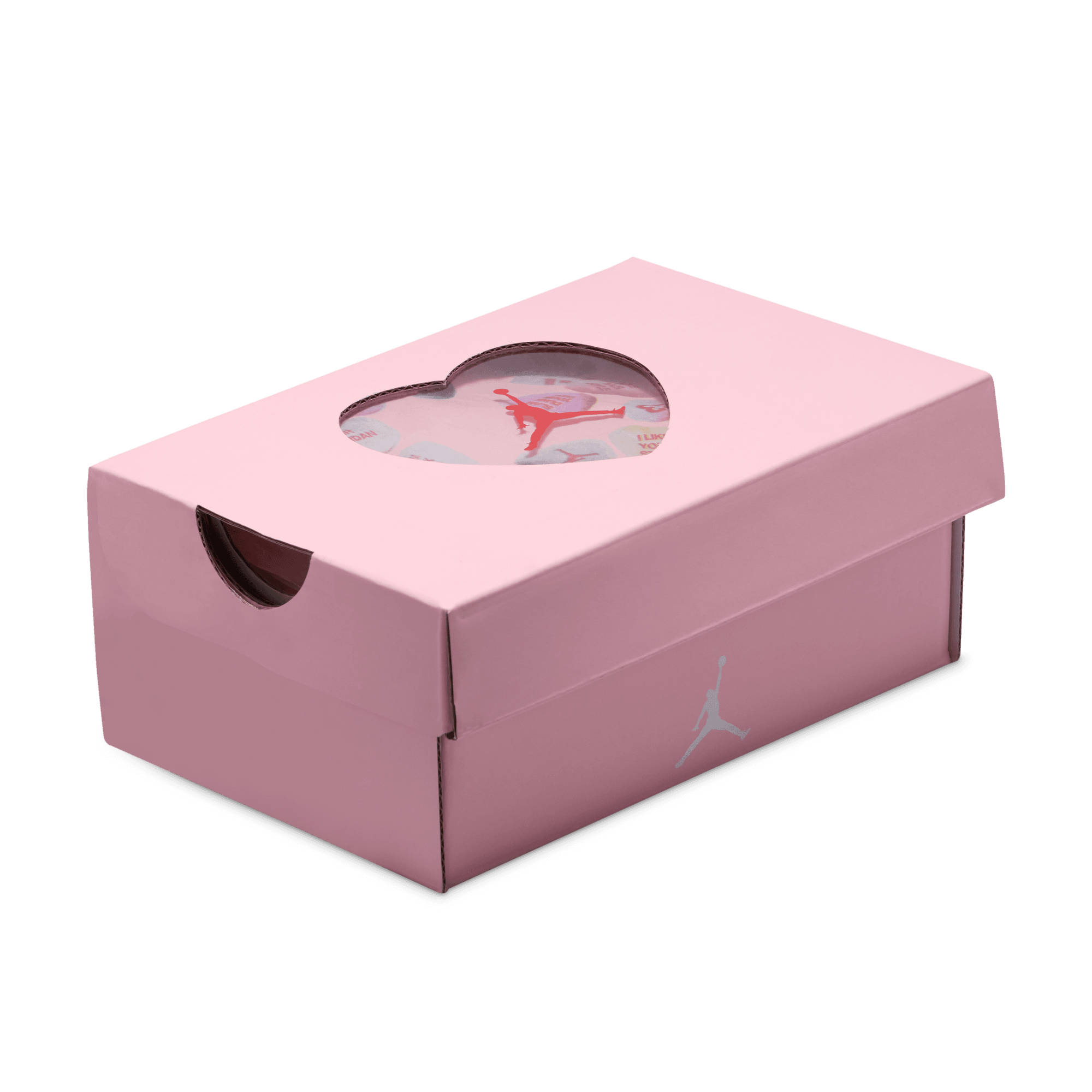 Love is till in the air on this springy Valentine's-themed kids exclusive Air Jordan 4 Retro "White/Vapor Green/Medium Soft Pink". The classic silhouette builds its upper from tumbled white leather with seasonal pastel accents on the blue lace hardware, green netting and tongue tag, and pink mudguard and heel branding. The insoles are printed with a heart candy graphic to go along with the Jumpman heart hang tag and pink heart-themed packaging.