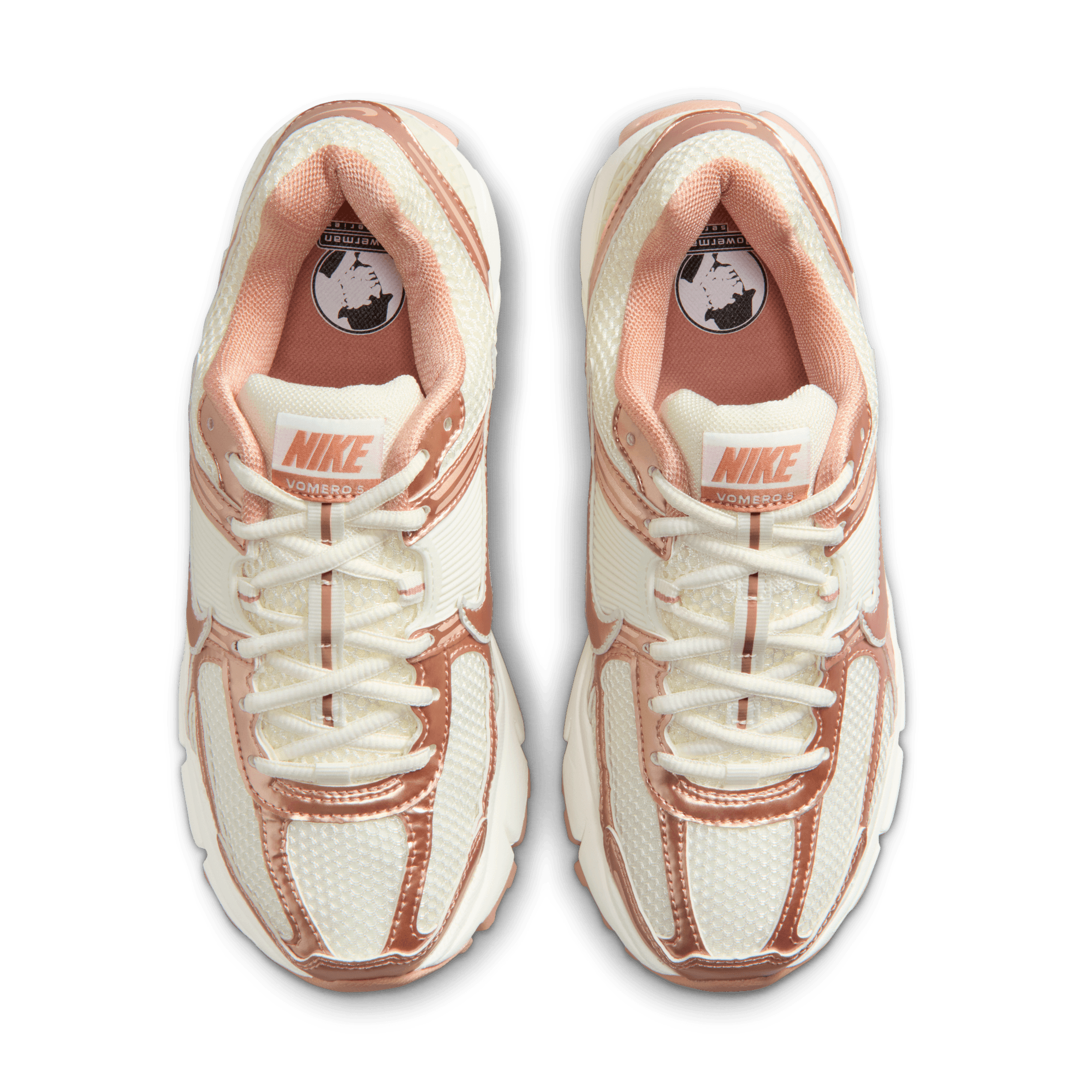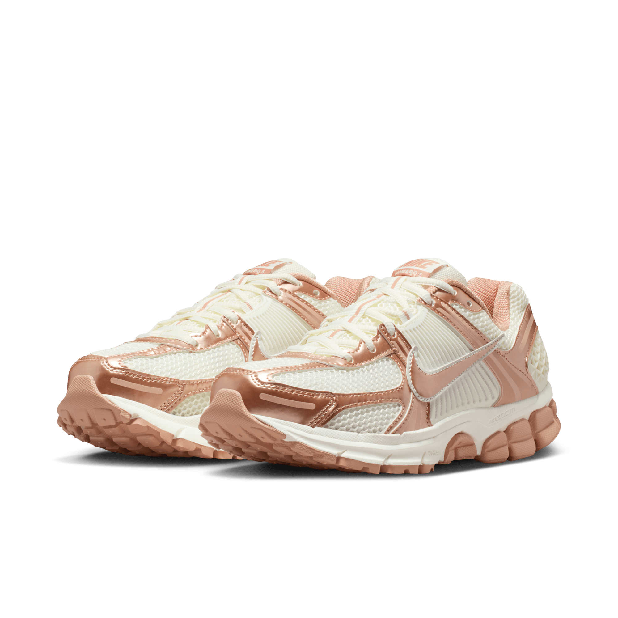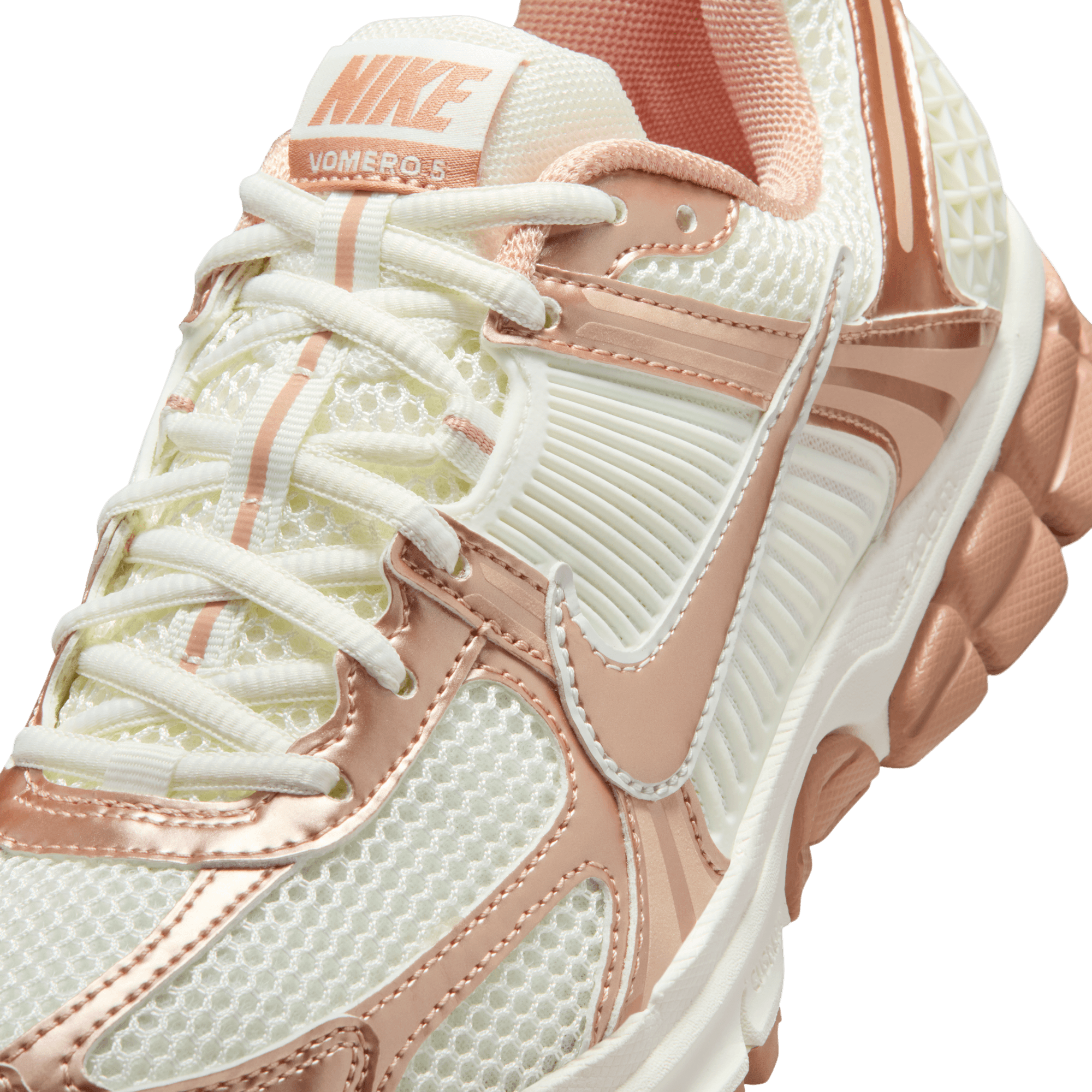The classic tech runner is back in a luxurious spring colorway that truly marries lifestyle and tech with the WMNS Zoom Vomero 5 "Rose Gold". Originally released in 2010, the Zoom Vomero 5 is renowned for its nearly unmatched comfort, with two separate Zoom Air units in the heel and forefoot providing pillowy soft cushioning. This shiny colorway is built from a white mesh upper with rose gold TecTuff leather overlays and swoosh, white laces, rose gold lining, and accents throughout. The shoe features white TPU side panels, 3M reflective details, a Bob Bowerman graphic on the insole, and a white 3D printed lattice-like air ventilation panel on the heel. A white Zoom Air midsole and a clay-colored waffle outsole completes the design.