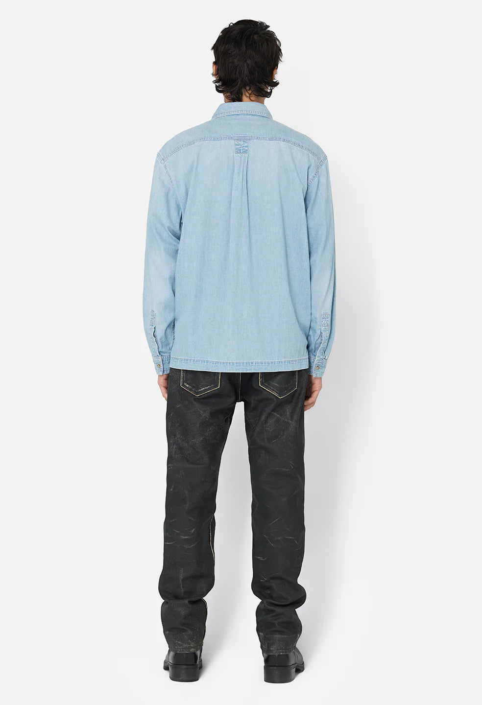 aRelaxed-fit work shirt in 2X1 indigo denim with a light vintage wash. This shirt features a button closure, flap pockets at the chest, spread collar, barrel cuffs, box pleat at the back yoke, and side seams with an engineered notch. Contrast tobacco stitching. Made in Japan.