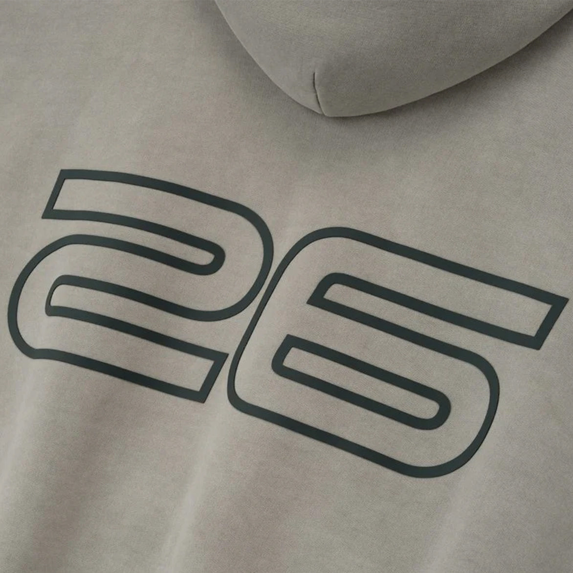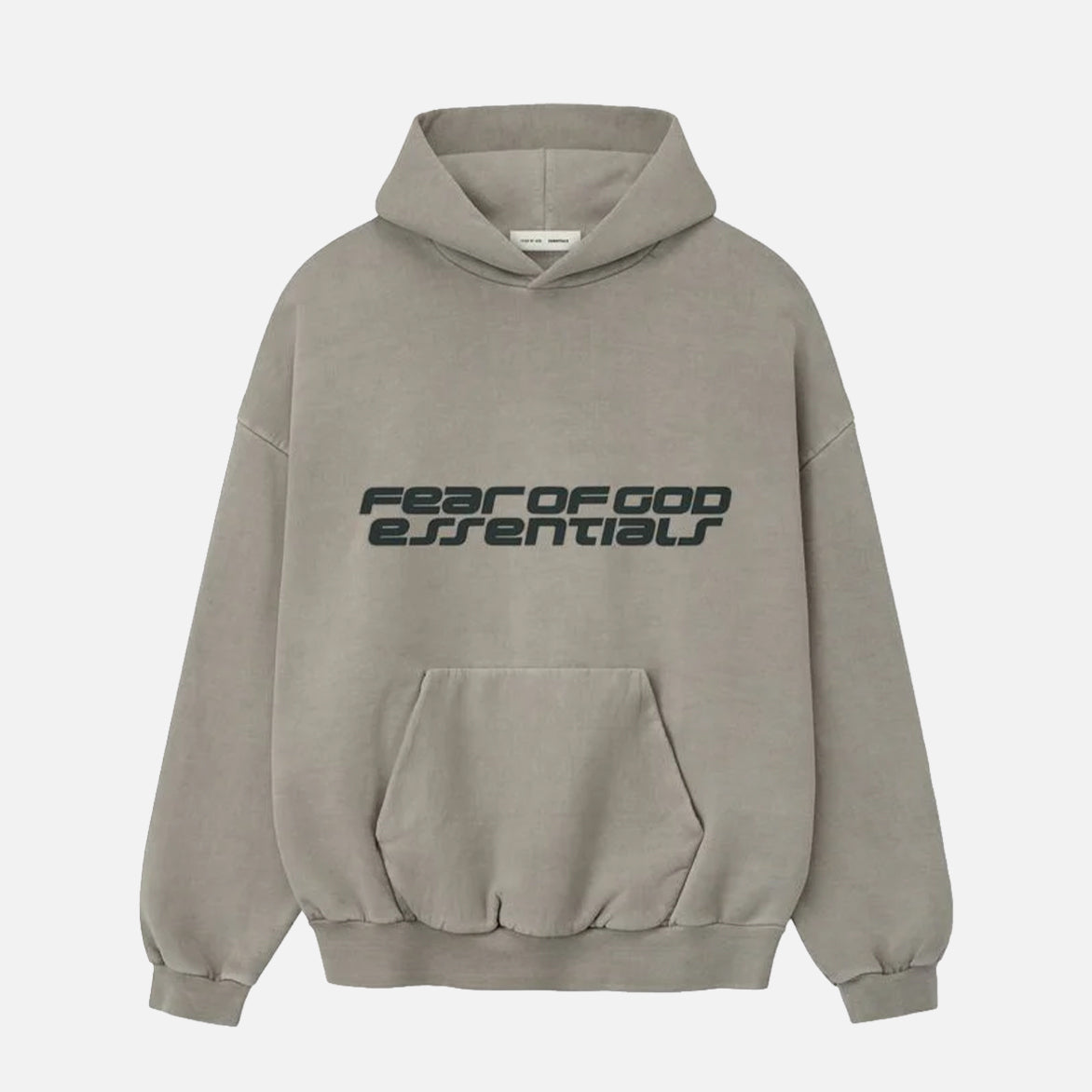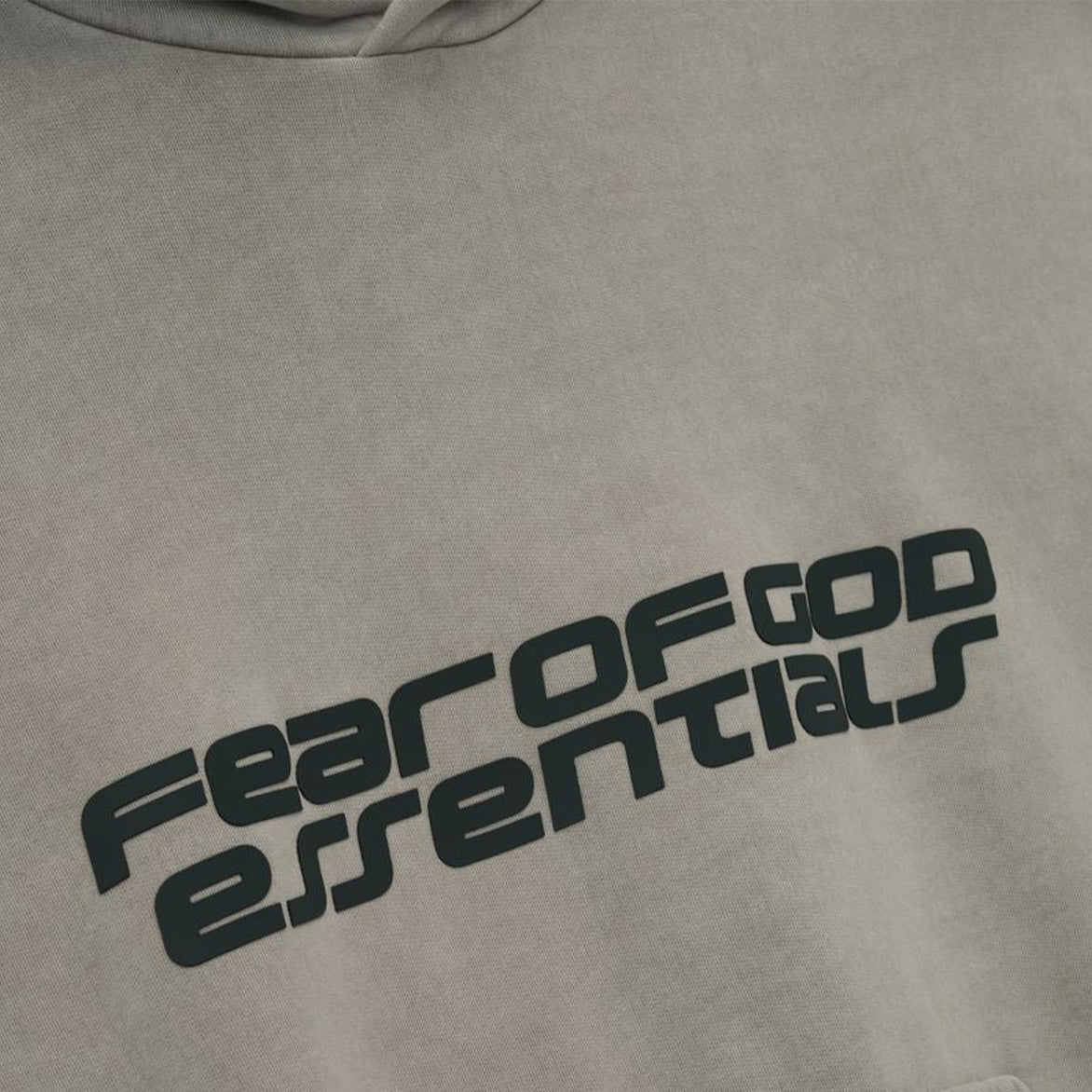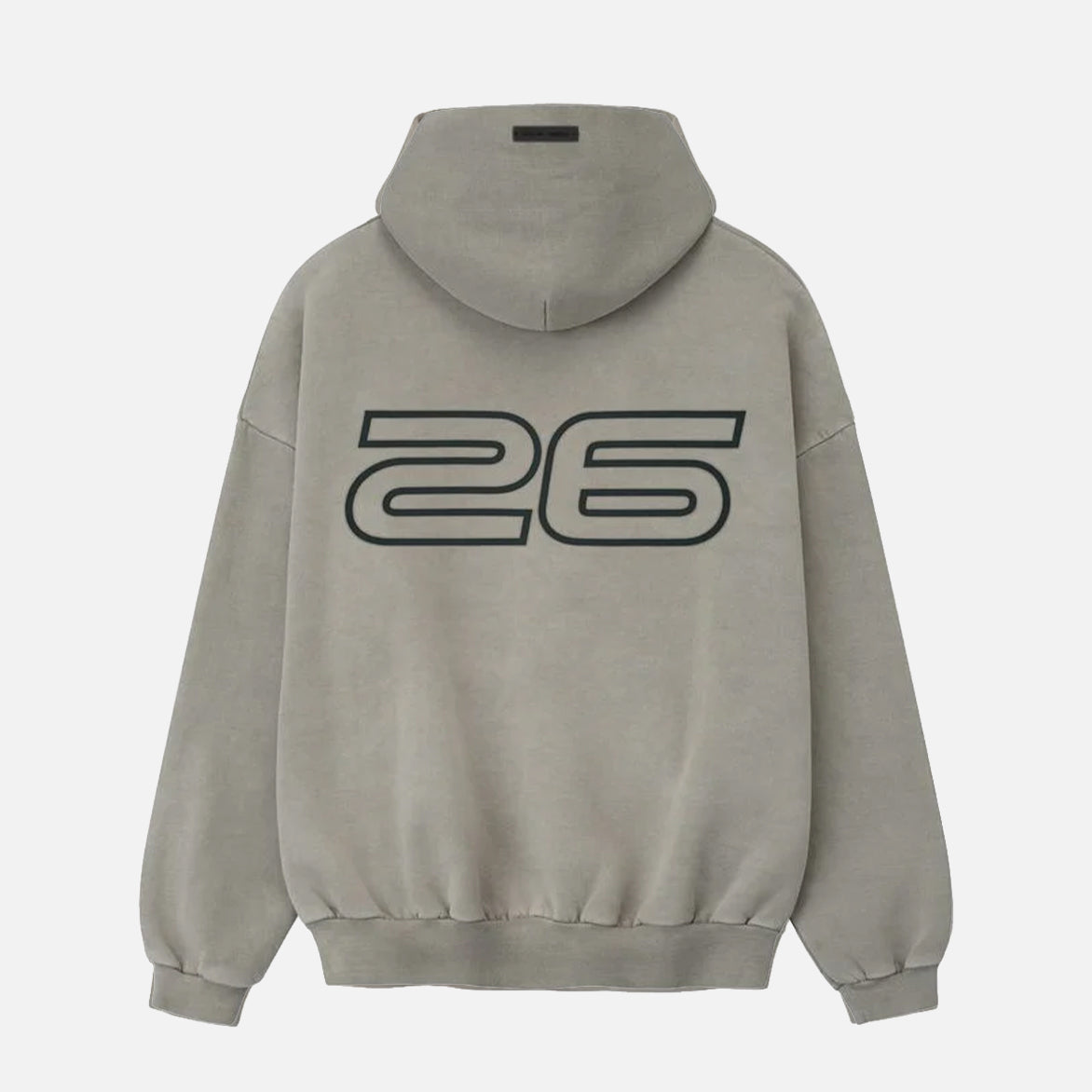 The Heavy Fleece Hoodie is crafted from 100% cotton 520gsm heavy fleece and treated with a pigment dye to create rich depth of color. Designed in an oversized 90s-inspired silhouette, it features exaggerated proportions with dropped shoulders for a relaxed drape. The hoodie is defined by HD-printed graphics—“Fear of God Essentials” logo on the front and “26” on the back. Finishing details include a kangaroo pocket, rib-knit cuffs, waist-hem and a Fear of God Essentials rubberized label stitched on the hood.