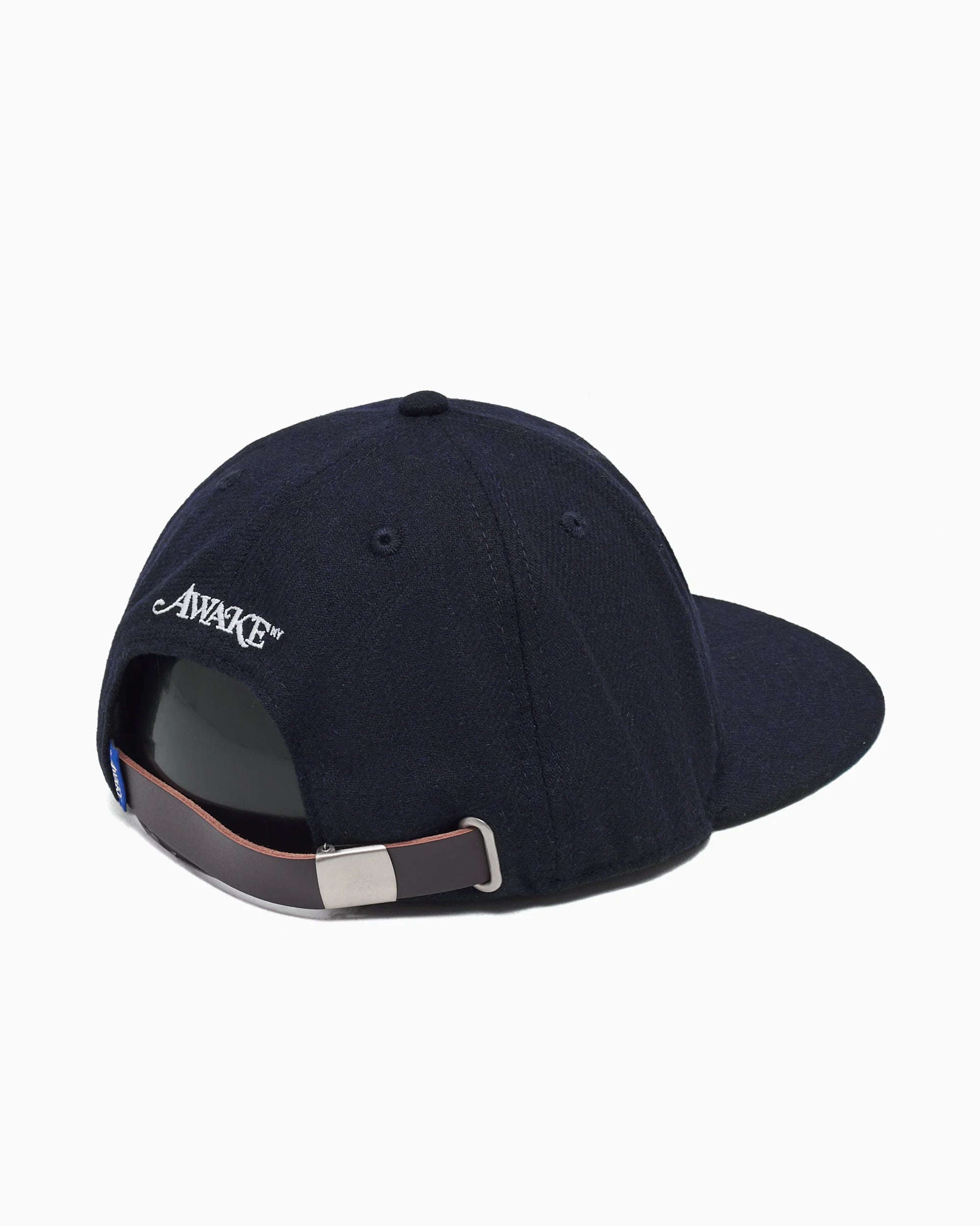 Cotton baseball cap with leather strap and embroidered logos.