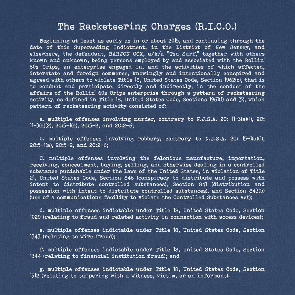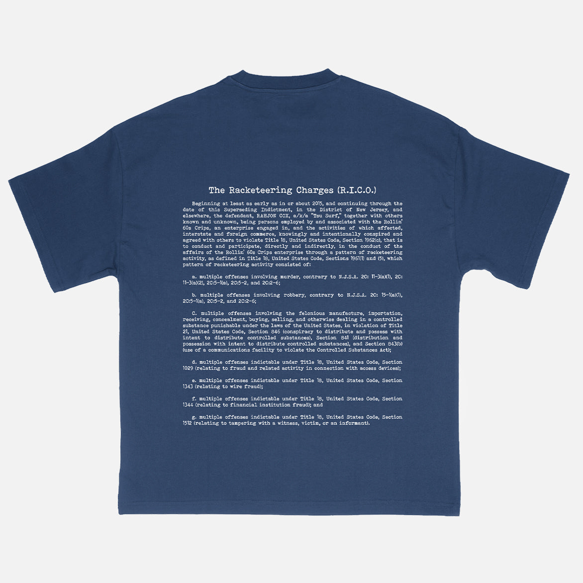 Corner Store teams with Tsu Surf on a garment that functions as both clothing and document with the Corner Store x Tsu Surf x 1000WORD$ "Free Surf" Tee. The same portrait. The same weight. A quieter form. This navy t-shirt features a sewn cotton twill Polaroid-style patch of Tsu Surf, photographed by 1000WORD$ and left intentionally out of focus. Across the back, his federal indictment is printed in white — direct, unembellished. Finished with Corner Store’s signature co-branded receipt tag. A study in restraint and proximity. Each piece comes with a Corner Store Sticker and a 1000WORD$ sticker.