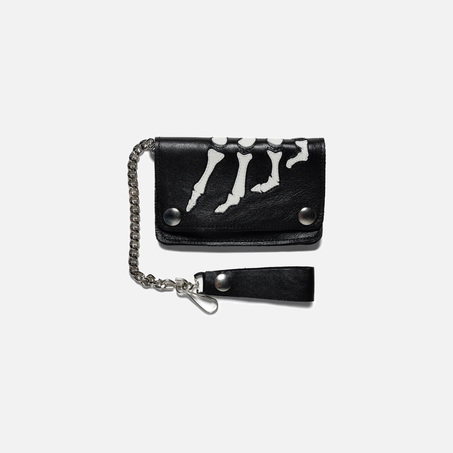 Leather skeleton wallet with Vanson and AWAKE NY graphic.