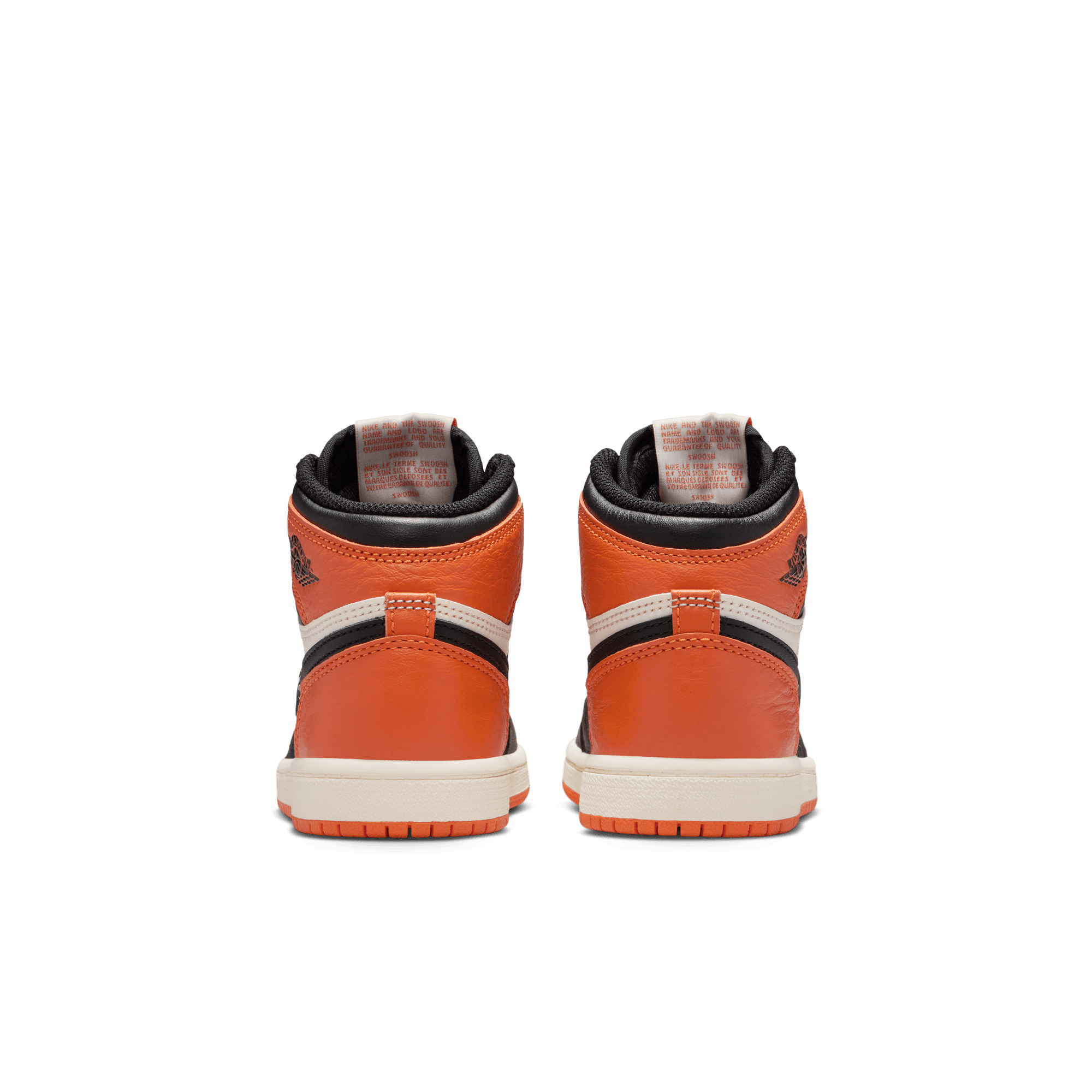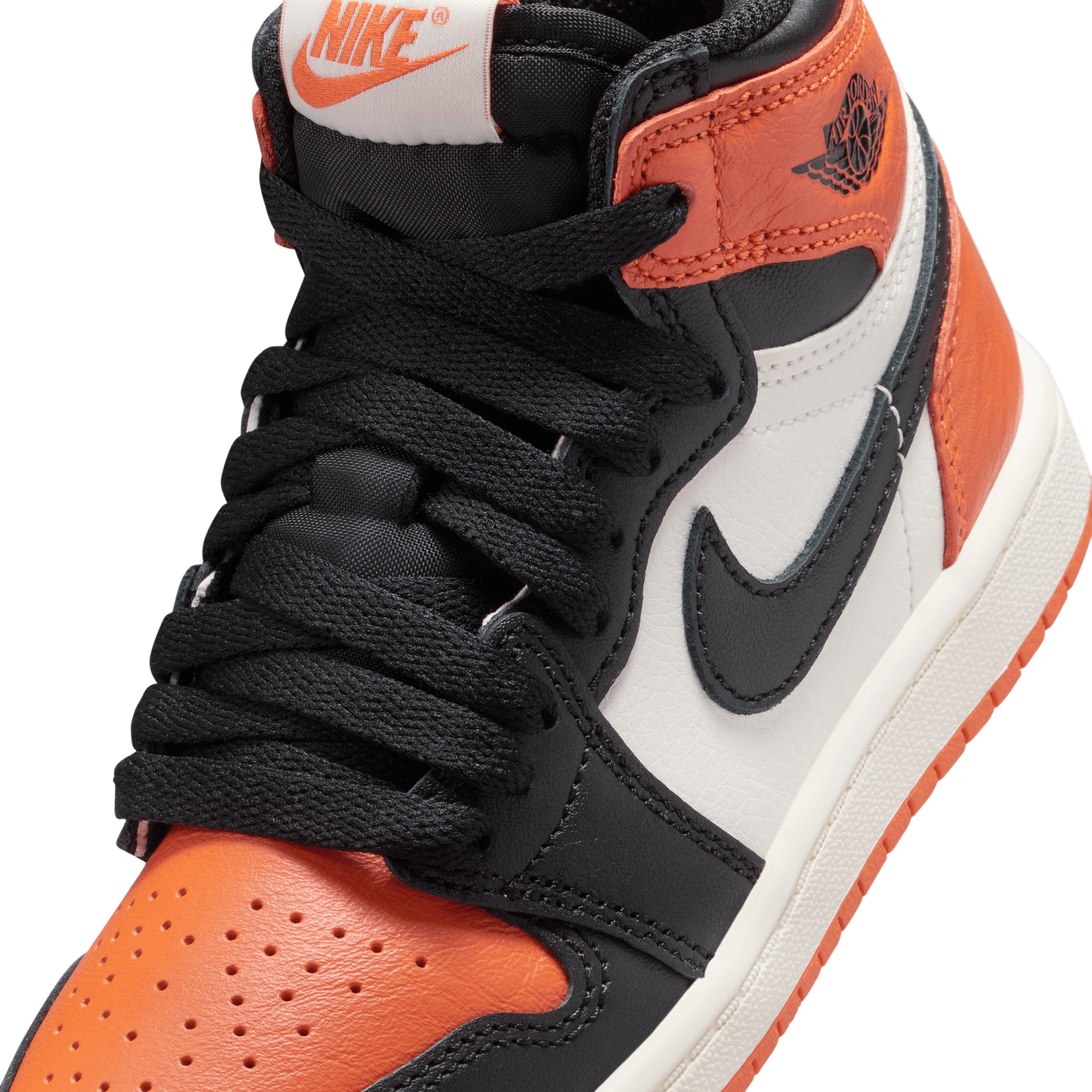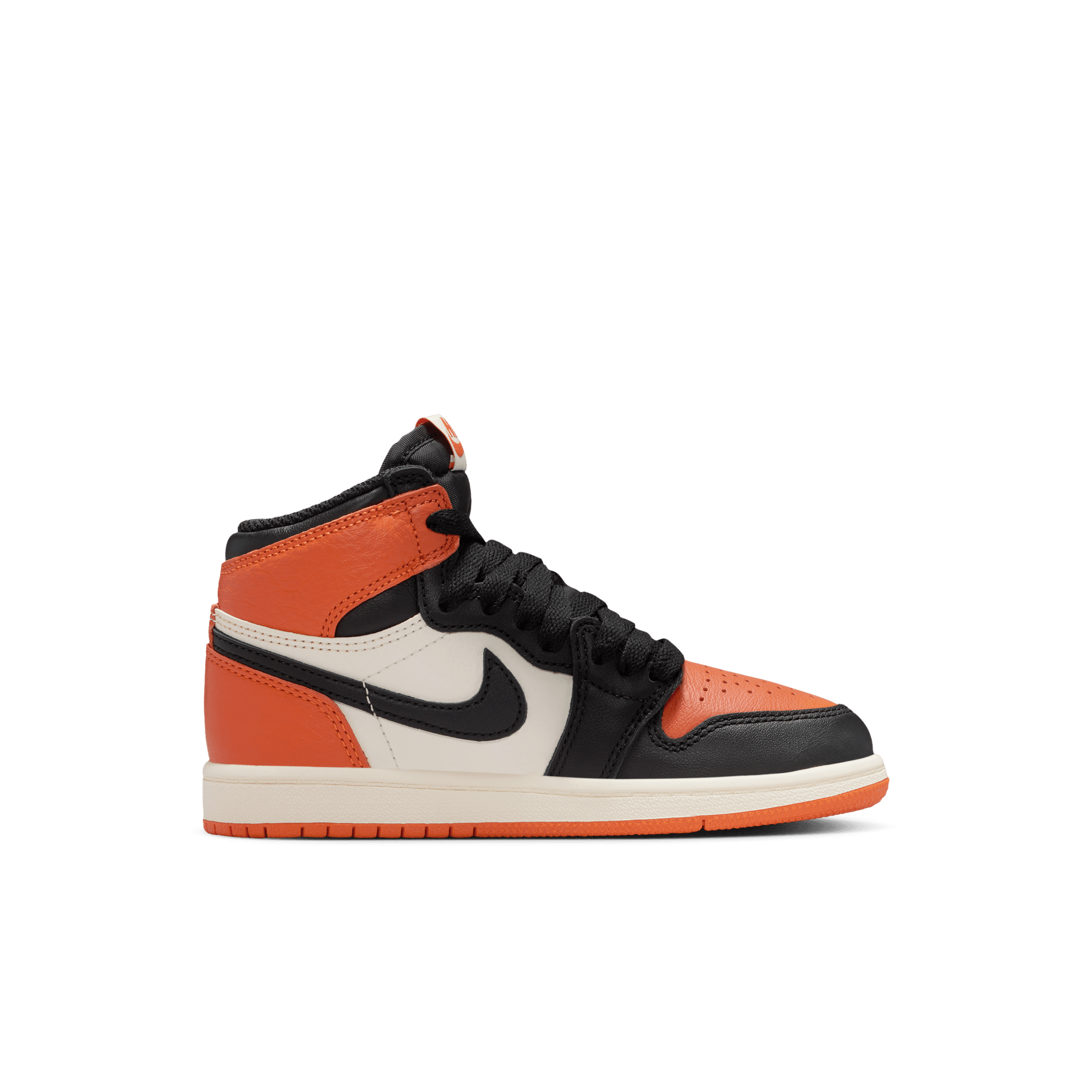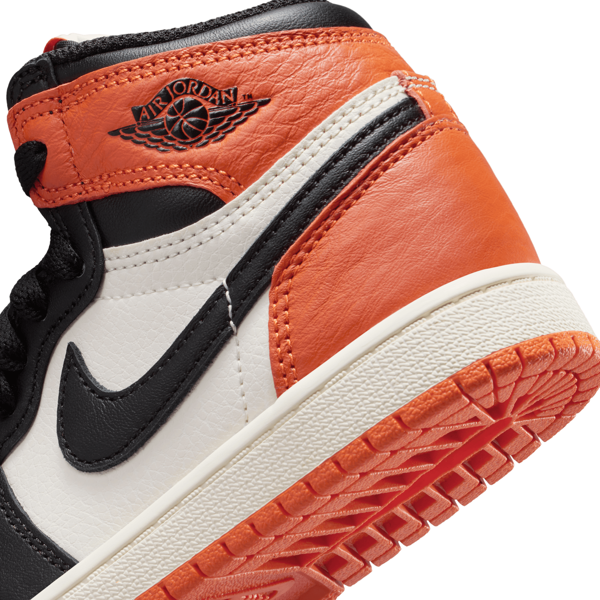 The shoe that created a frenzy upon its initial release in 2015 and went into the Jordan 1 pantheon is back for its 10th anniversary with the return of the Air Jordan 1 Retro High OG "Shattered Backboard". By now we all know the backstory of MJ's backboard-breaking performance in an Italian exhibition game after his rookie year, and the orange and black uniform he wore that inspired this colorway. The 2025 edition stays true to the original with premium orange and black leather panels contrasted with sail tumbled leather side panels and offset by black swooshes. Nike Air tongue tag and Jordan Wings logo on the ankle, and black laces and lining fill in the details while a sail midsole and orange rubber outsole complete the design. Signature shattered glass graphics on the insole supply the finishing touch.
