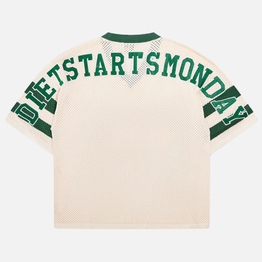 Diet Starts Monday, the experimental streetwear brand founded by John Geiger and Davin Gentry is back with an all new summer collection for 2025 featuring their signature graphic-heavy designs. The Knit Jersey is a classic football jersey silhouette made from a cotton yarn crochet fabric with 84 printed on the front, triple stripe sleeves and Diet logo across the back shoulders.