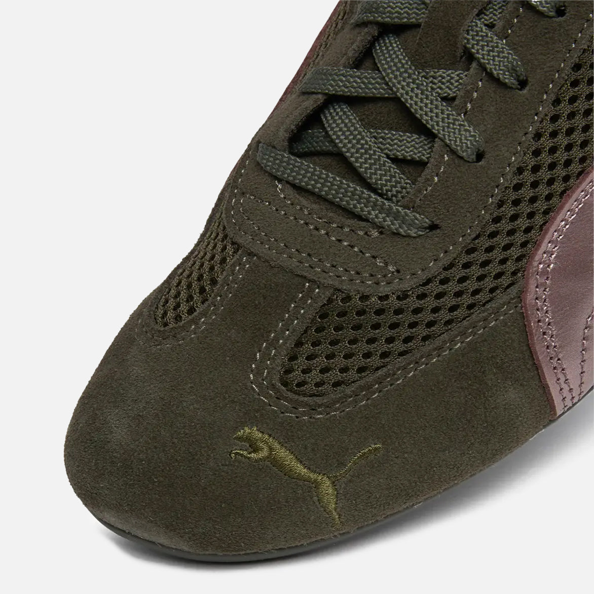 For over two decades, the PUMA Speedcat has been a streetwear and racing culture icon. Originally engineered as an ultra-slim driving shoe designed to cut milliseconds off lap times, it later made its mark on the streets of global fashion capitals. This Premium version features an olive suede and mesh upper with tonal branding, a metallic silver formstripe and an olive rubber outsole to complete the design.