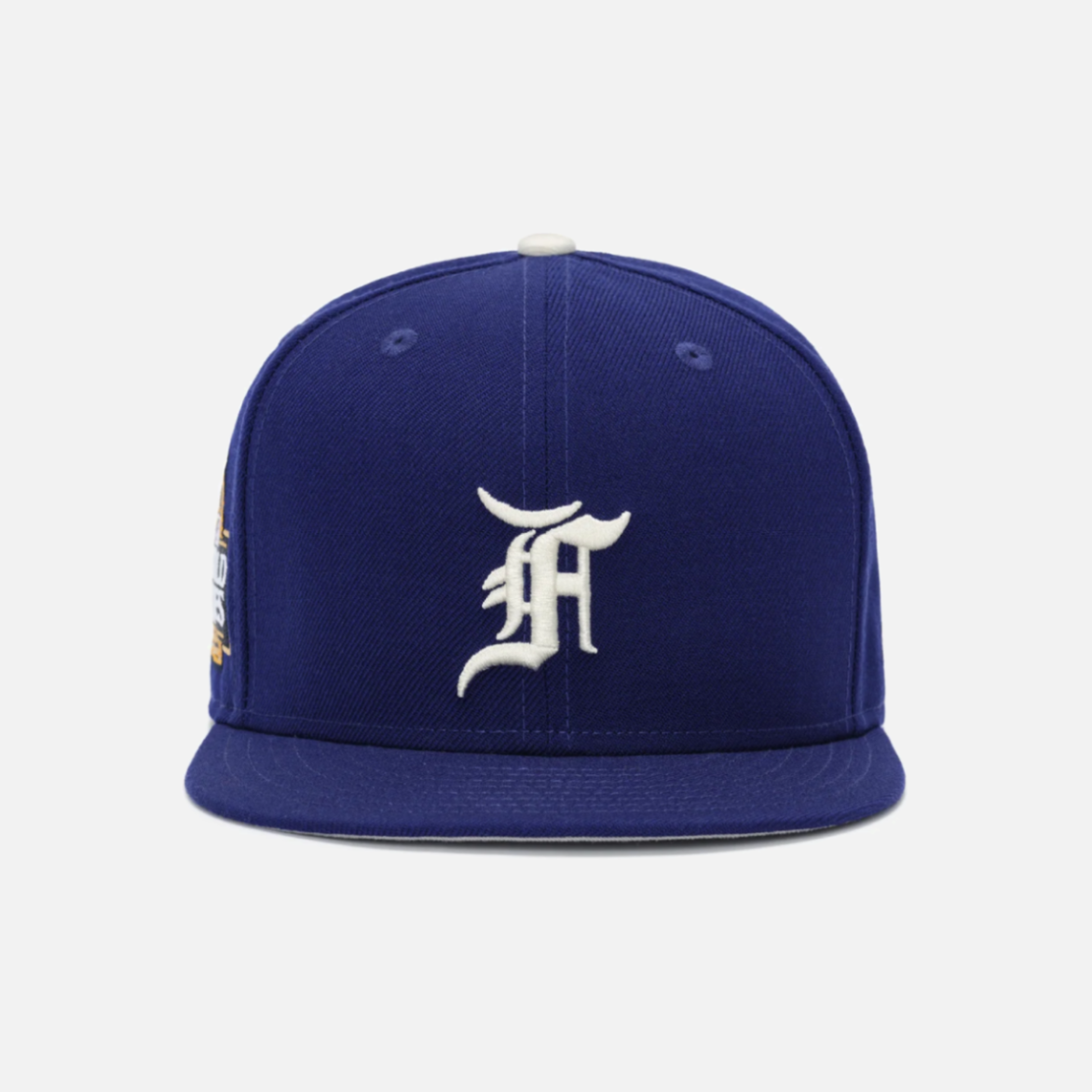 The Fear of God Essentials Los Angeles Dodgers 59FIFTY Fitted Cap features an embroidered Fear of God script logo at the front, 2024 World Series patch on the side, and a Fear of God label at the back. Additional details include a Dodgers team color fabrication with a grey undervisor.