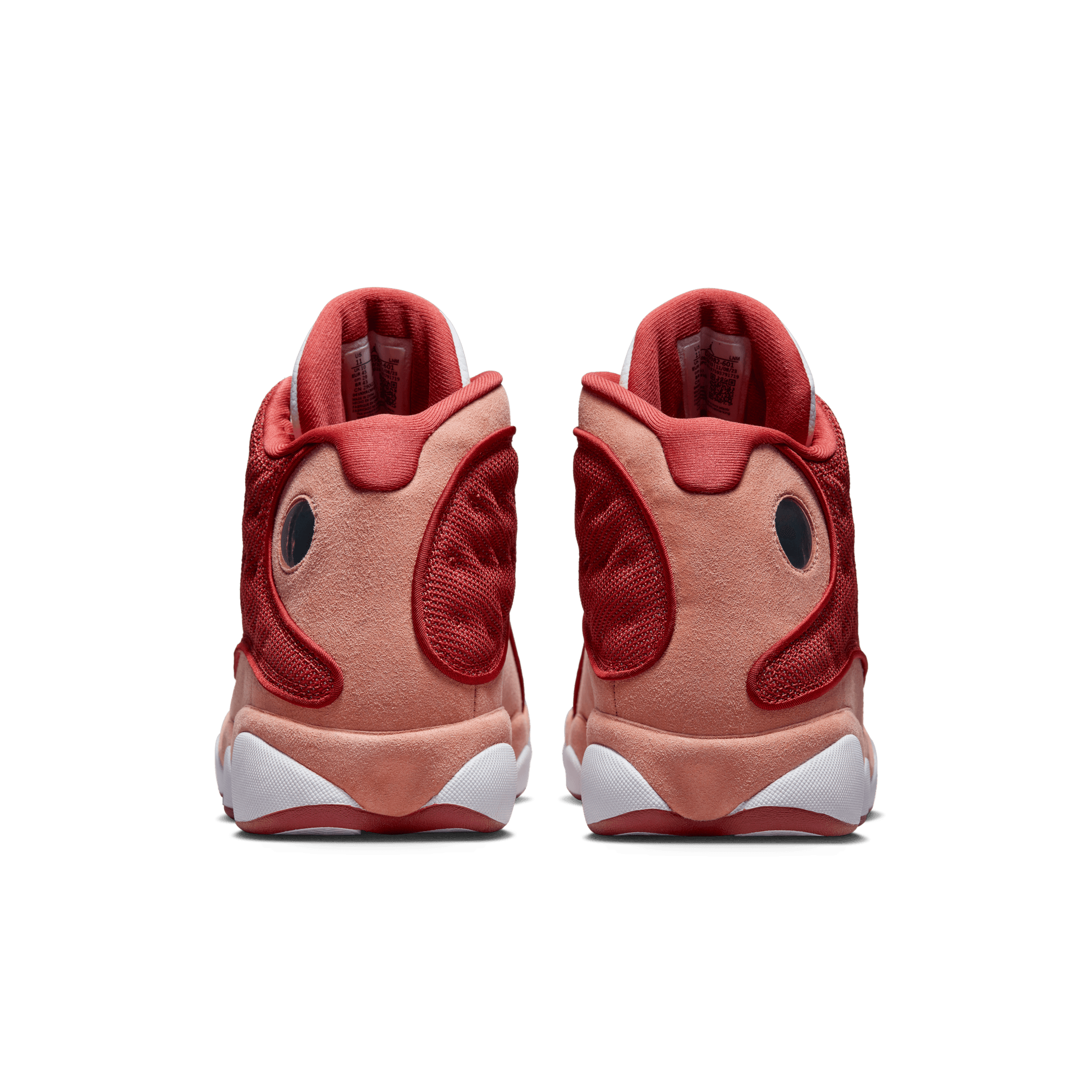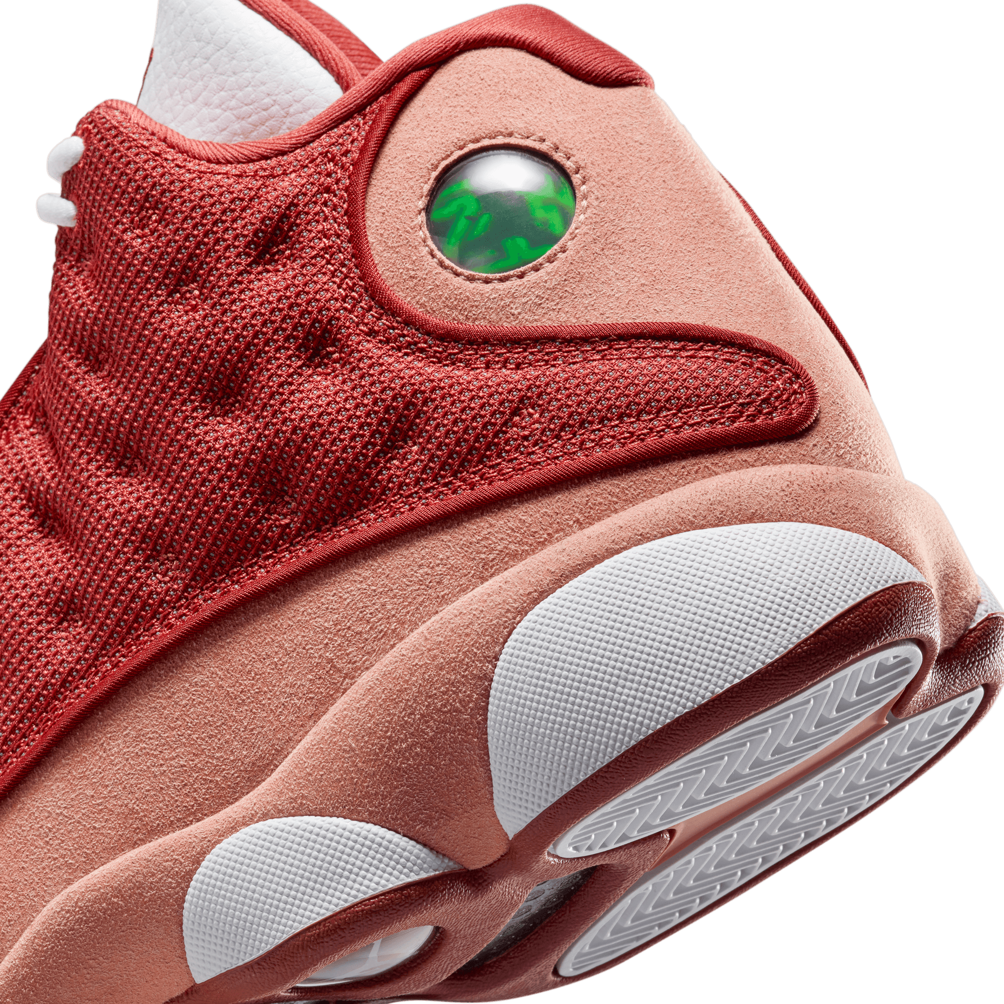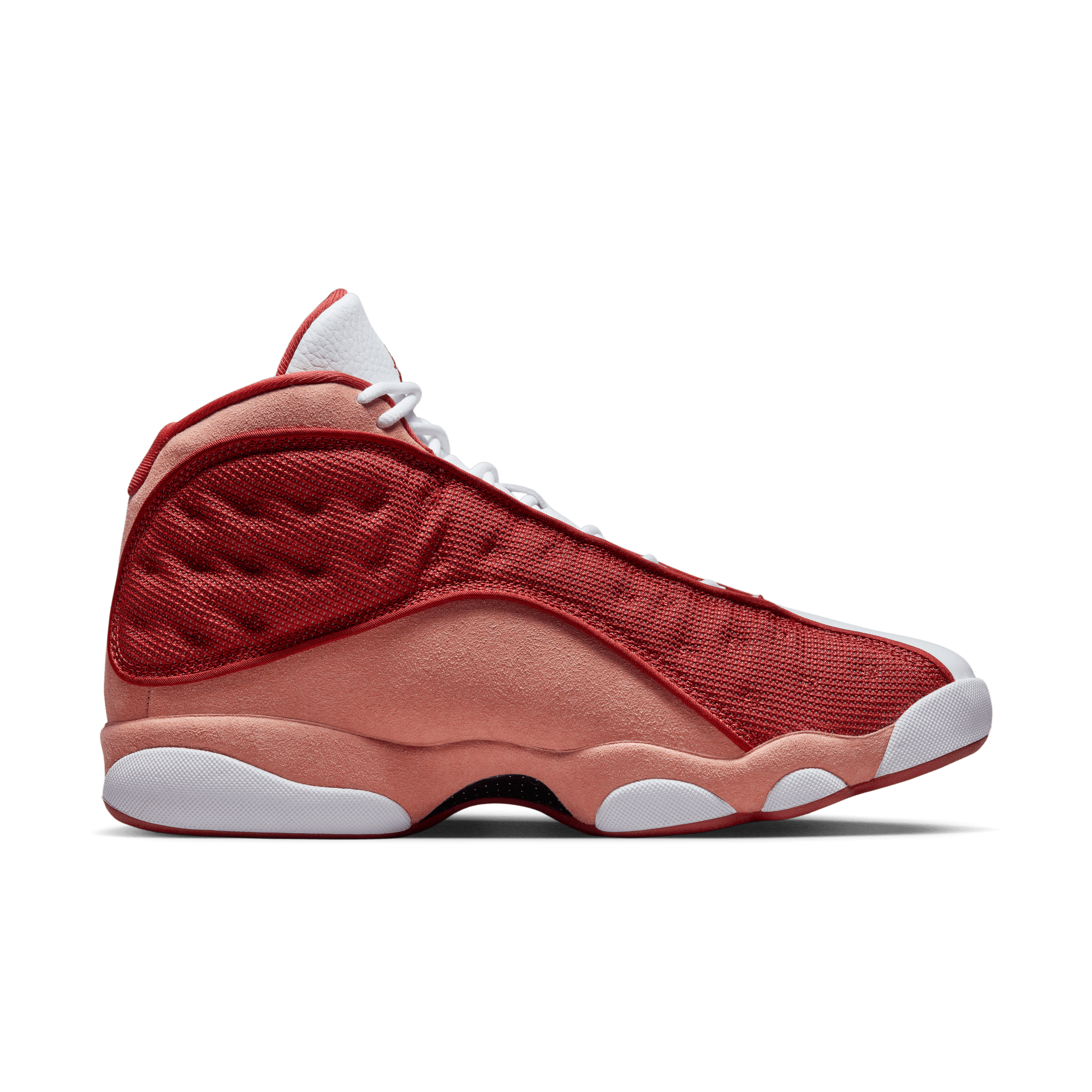 The newest colorway of Michael Jordan's thirteenth signature glows like a desert sunset on the Air Jordan 13 Retro "Dune Red". Reminiscent of the ultra limited AJ13 Premio "Bin 23", this new "Dune Red" edition echoes that grail's deep red quilted upper but replaces the tan suede mudguard with pink. Deep red also hits the branding and insole, while the signature holographic marble on the ankle, red marble on the outsole and pink and red rubber multi-pod outsole complete the design.