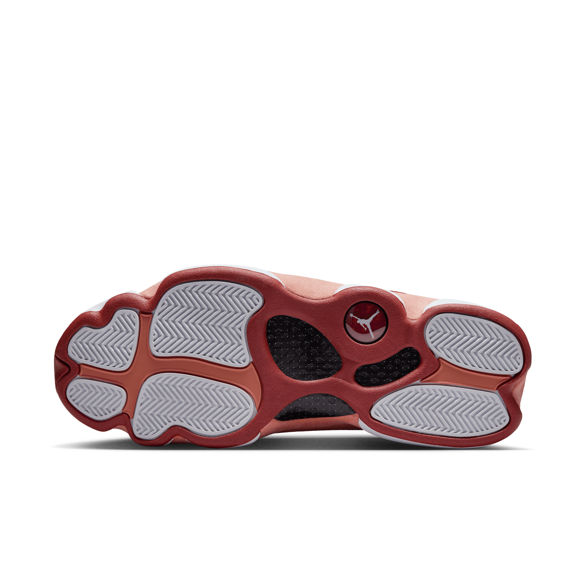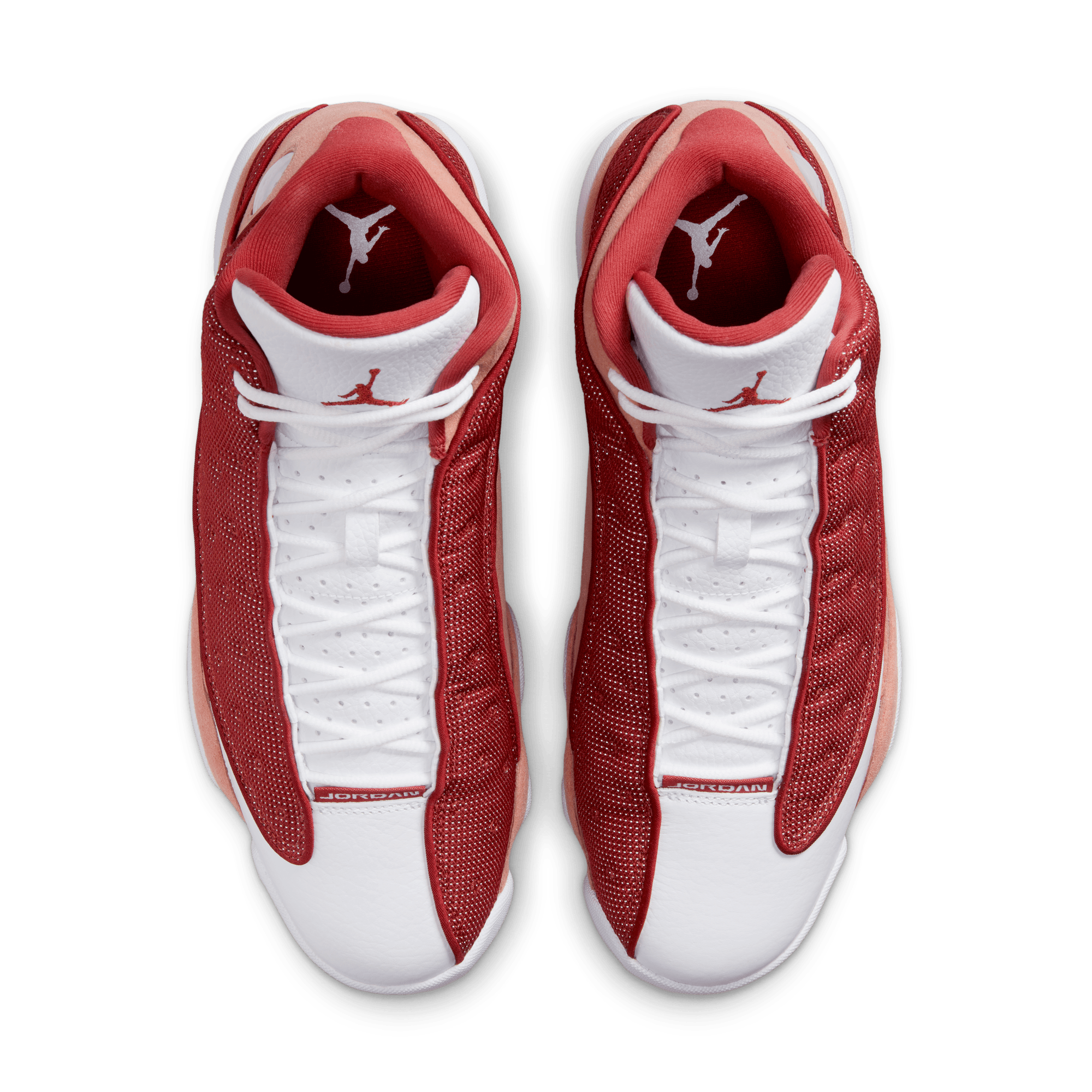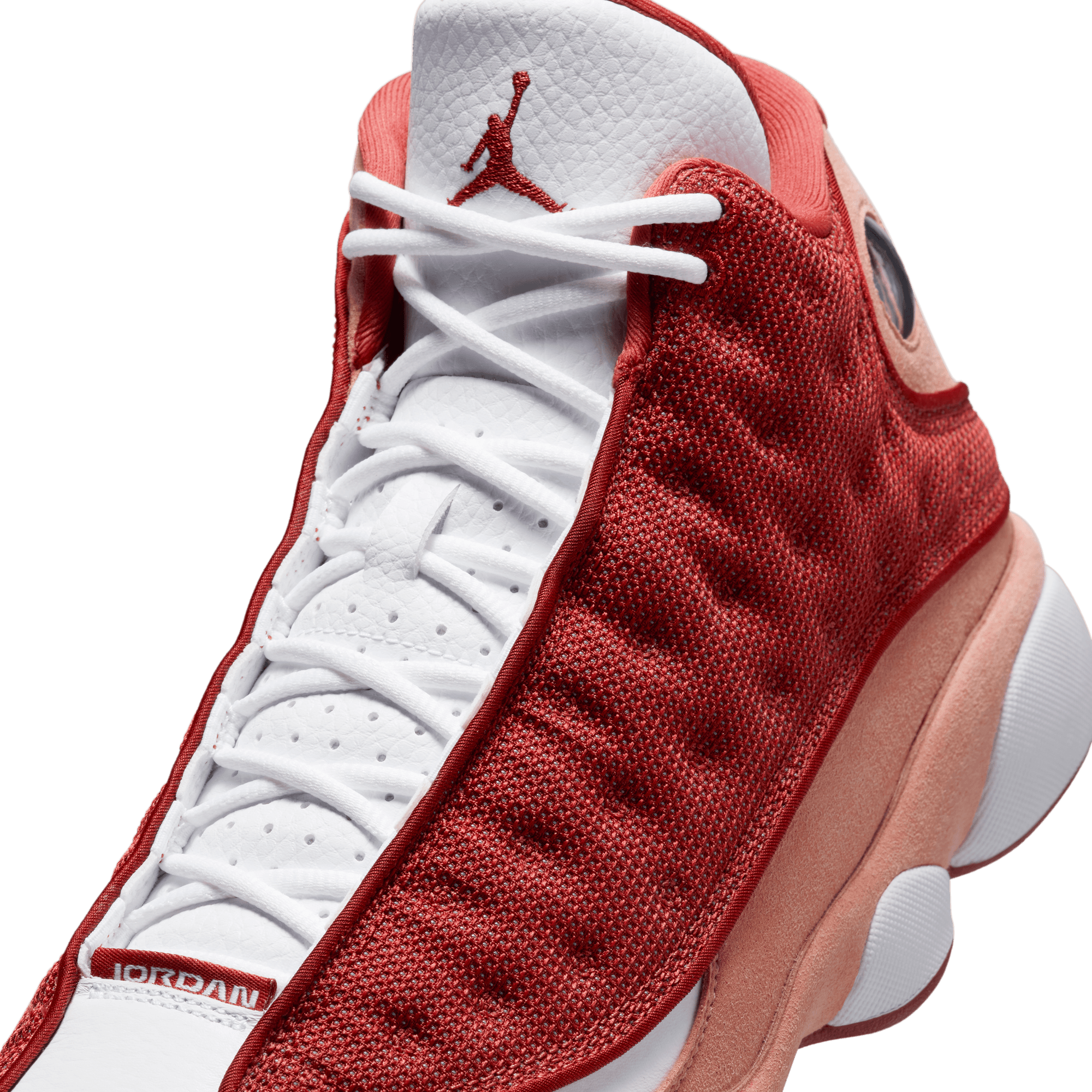 The newest colorway of Michael Jordan's thirteenth signature glows like a desert sunset on the Air Jordan 13 Retro "Dune Red". Reminiscent of the ultra limited AJ13 Premio "Bin 23", this new "Dune Red" edition echoes that grail's deep red quilted upper but replaces the tan suede mudguard with pink. Deep red also hits the branding and insole, while the signature holographic marble on the ankle, red marble on the outsole and pink and red rubber multi-pod outsole complete the design.