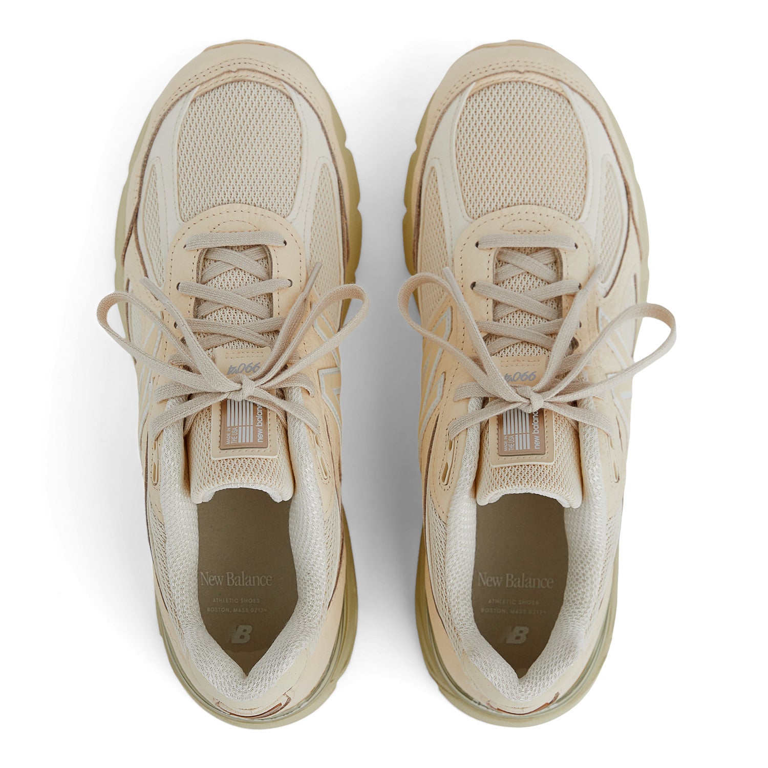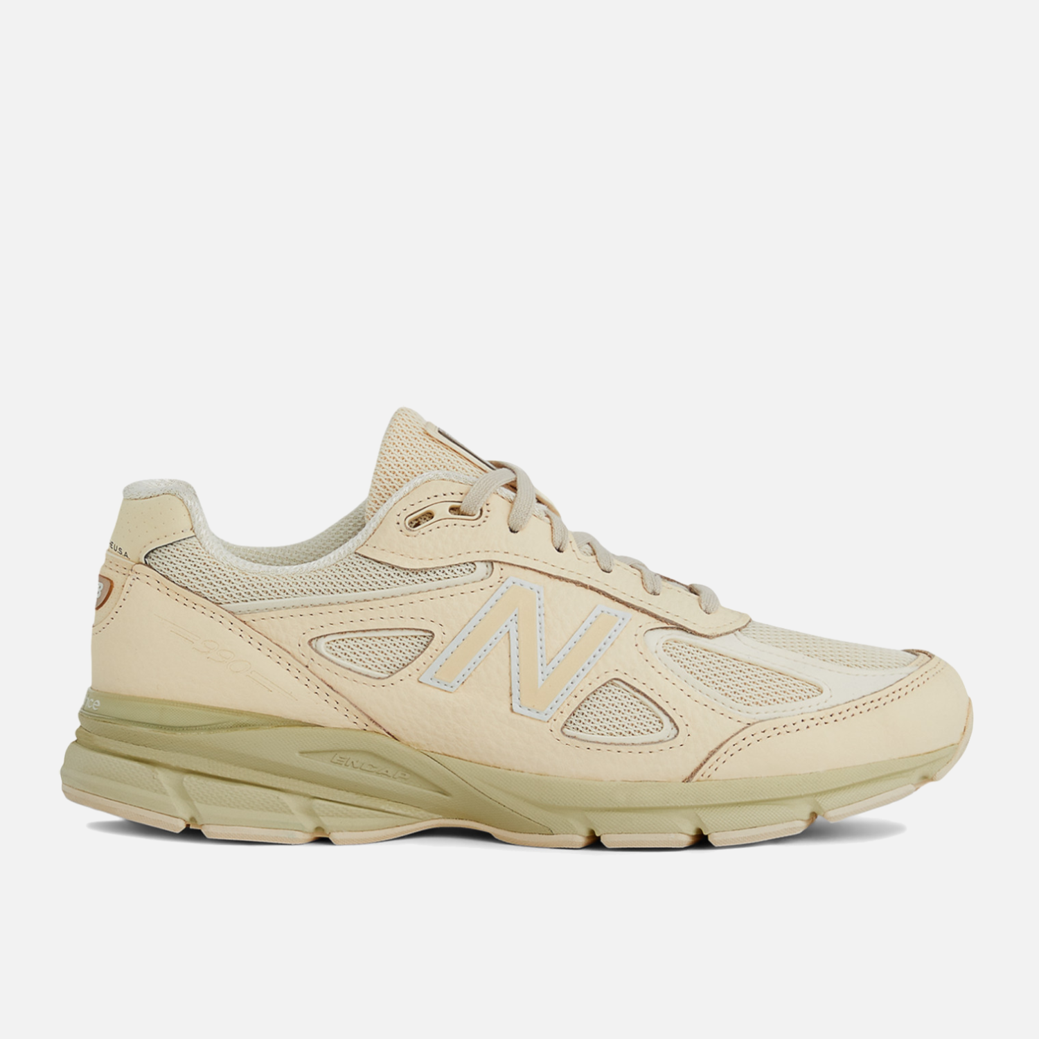 The New Balance 990V4 Made In USA "Macadamia Nut" continues the heritage of their 990 line of running shoes that have been the pinnacle of performance and design since 1982. This premium update of 2016's V4 model is built from premium cream-colored tumbled leather on top of a tonal mesh upper with white leather accents. It features a refined and sleeker shape with a white-outlined cream 'N' logo on the side, premium cushioning with an OrthoLite insole and a pale olive midsole that features ENCAP and ABZORB technology for three layers of comfort and support and an N-durance rubber outsole. A white "New Balance Made in the USA" flag on the tongue on a copper leather tongue tab, white and copper NB heel tab and branded olive semi-translucent heel counter finish off the design.