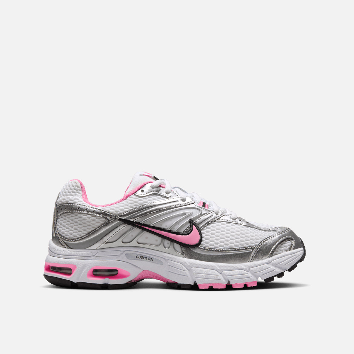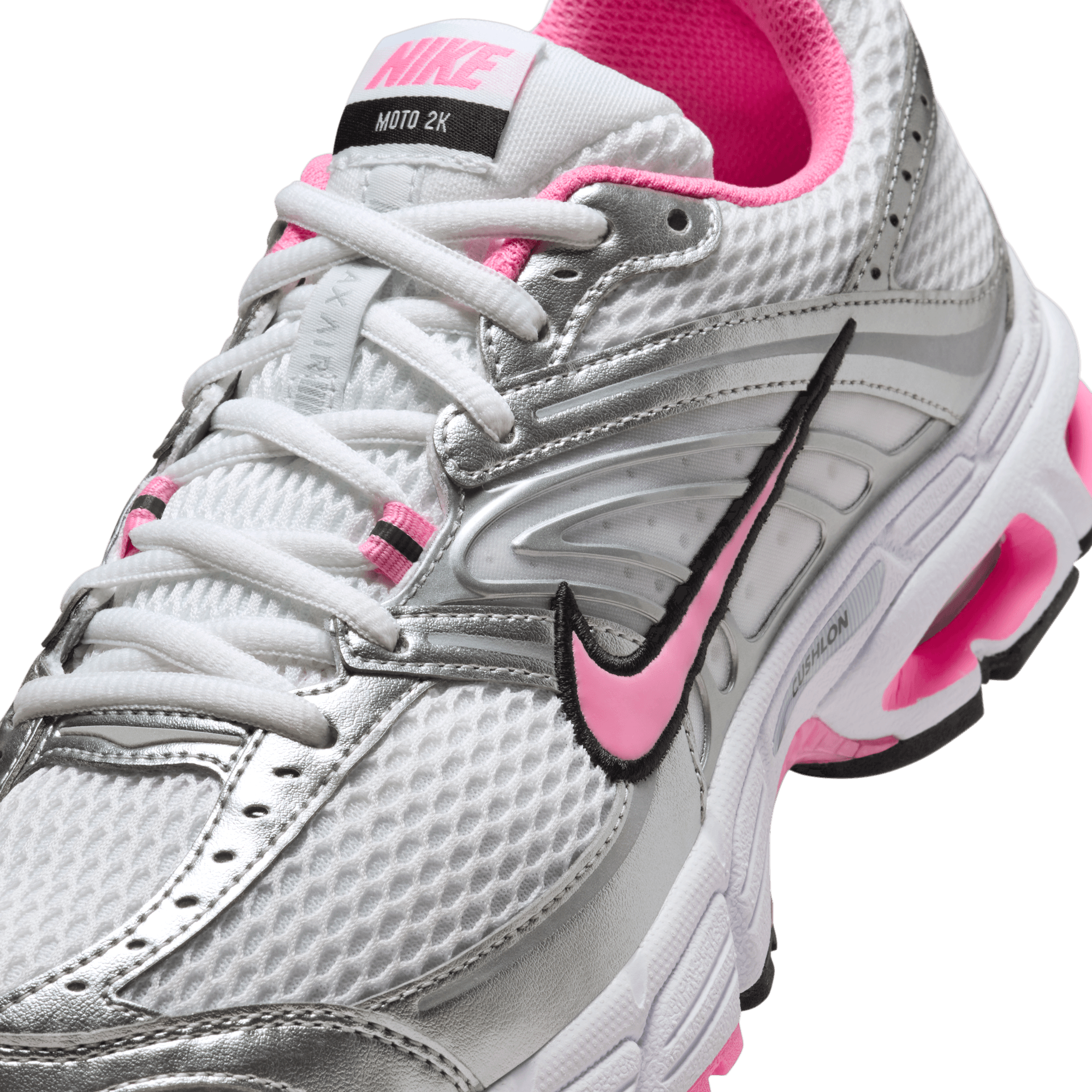 Nike's next tech runner for the masses is here with early-aughts style to spare on the WMNS Air Max Moto 2K. The familiar yet fresh design features a white, open weave mesh upper layered in synthetic metallic silver panels, 3M reflective details, and a pink swoosh on top of a silver TPU side grill. A white Phylon midsole contains plush and comfortable Air Max cushioning, while a black and pink rubber outsole completes the look.