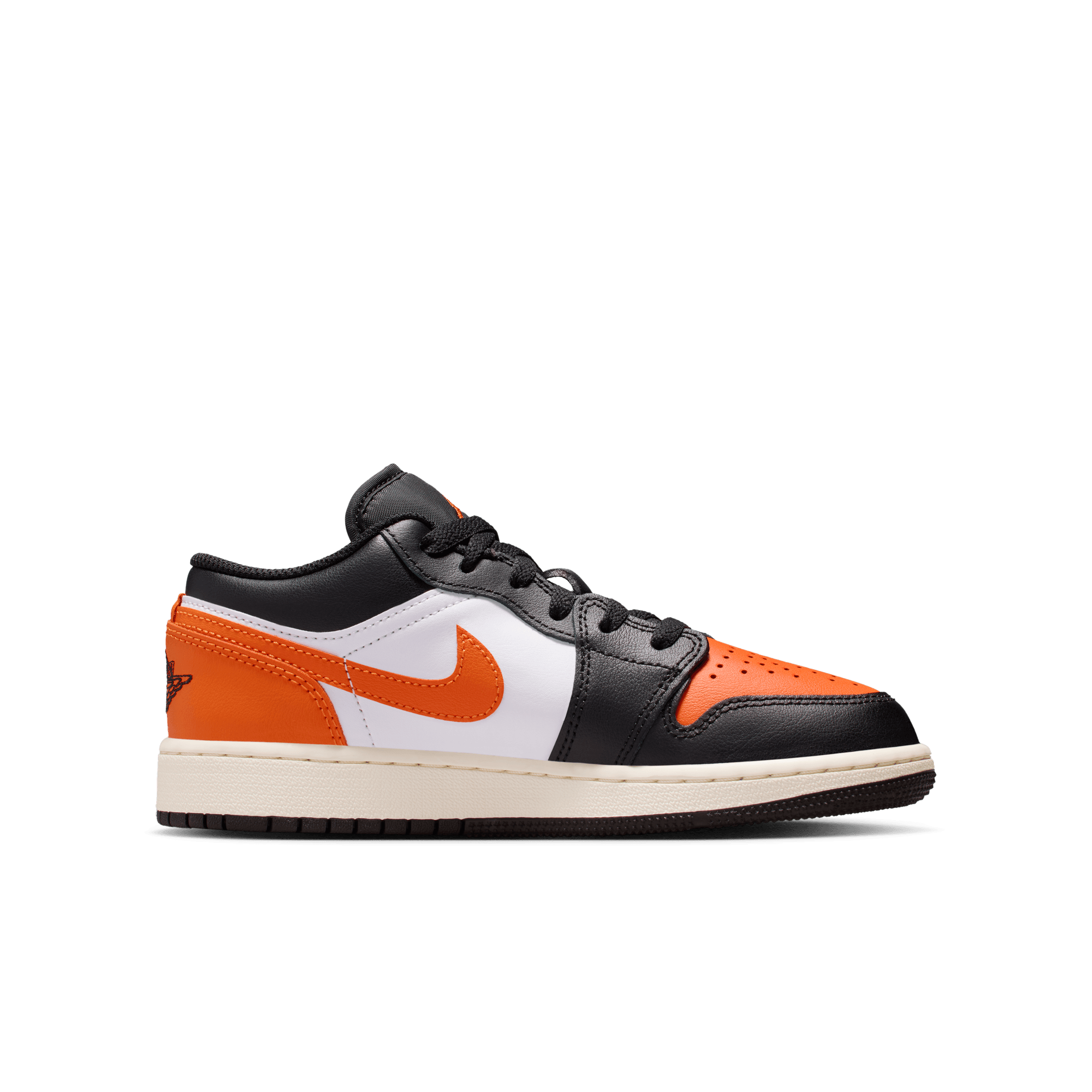 The low version of the original Air Jordan embodies everything you love about the Air Jordan 1. This edition of the classic silhouette features a white and orange leather upper with black leather overlays and an orange leather swoosh. The black tongue, laces and lining matches the outsole, with orange branding, and a sail midsole finishing off the look of this AJ1 Low.