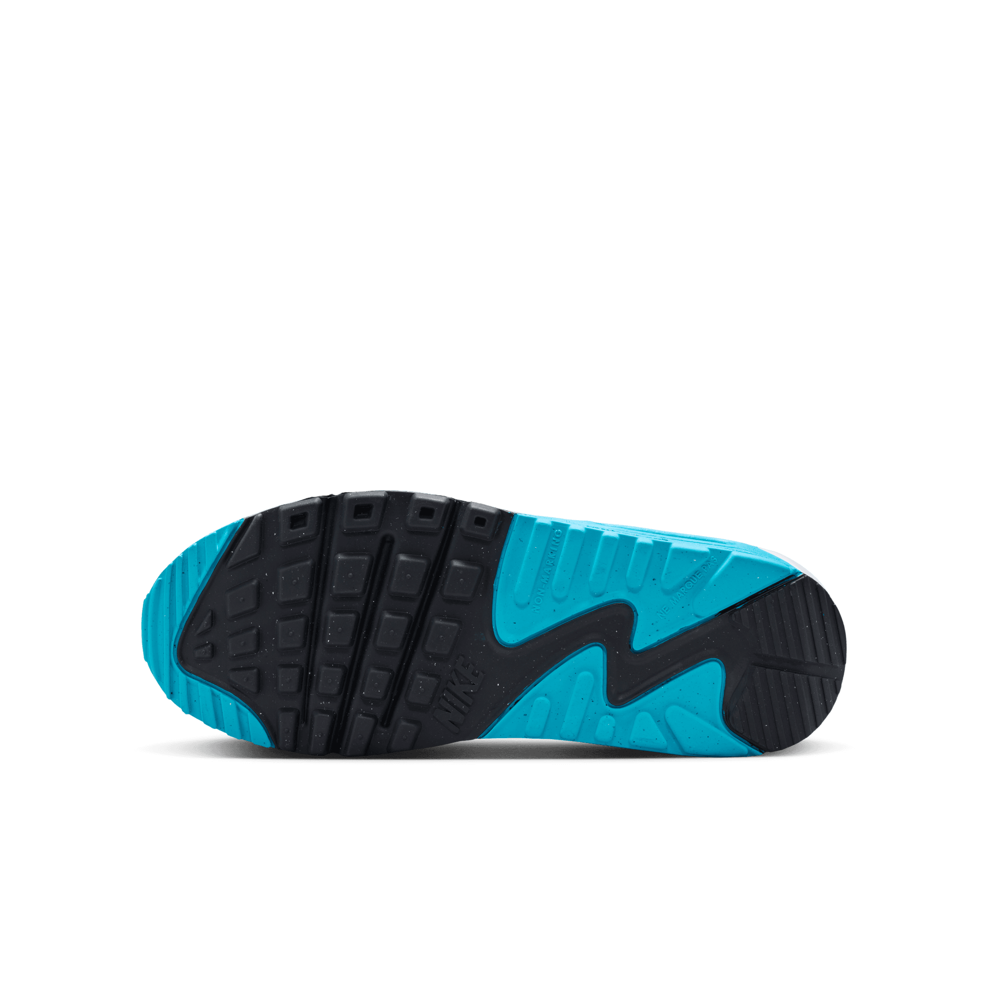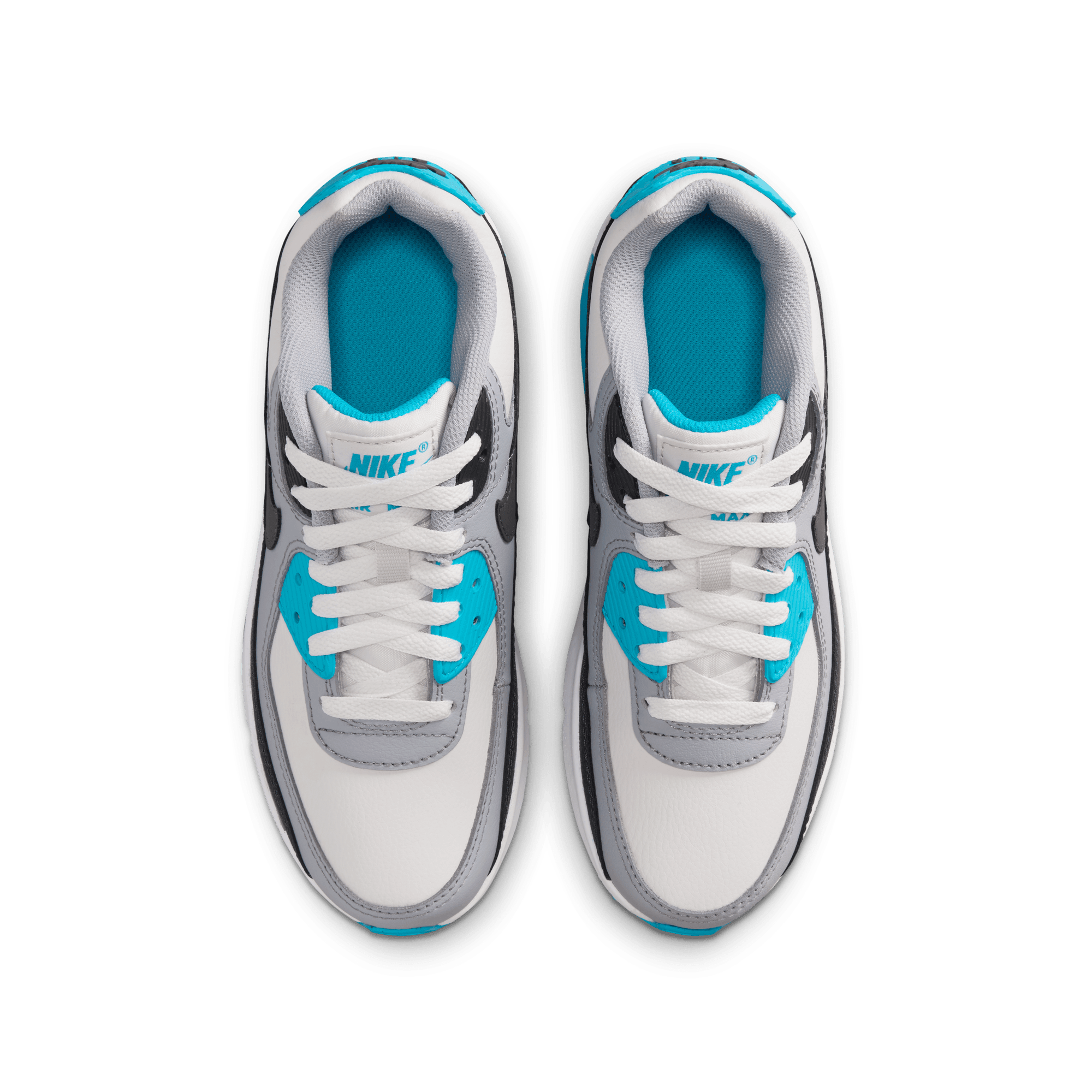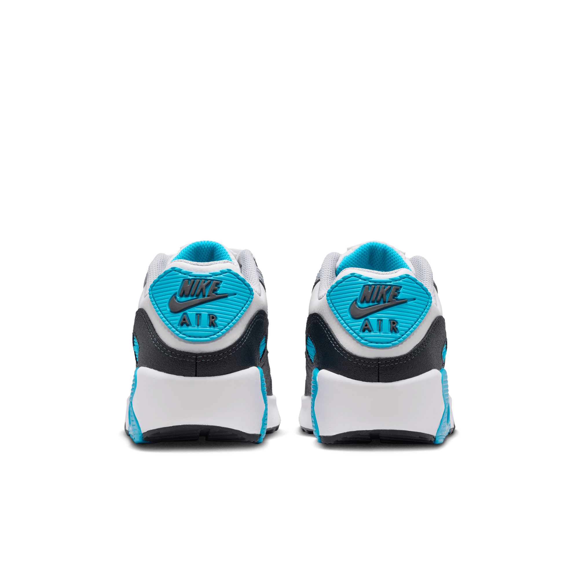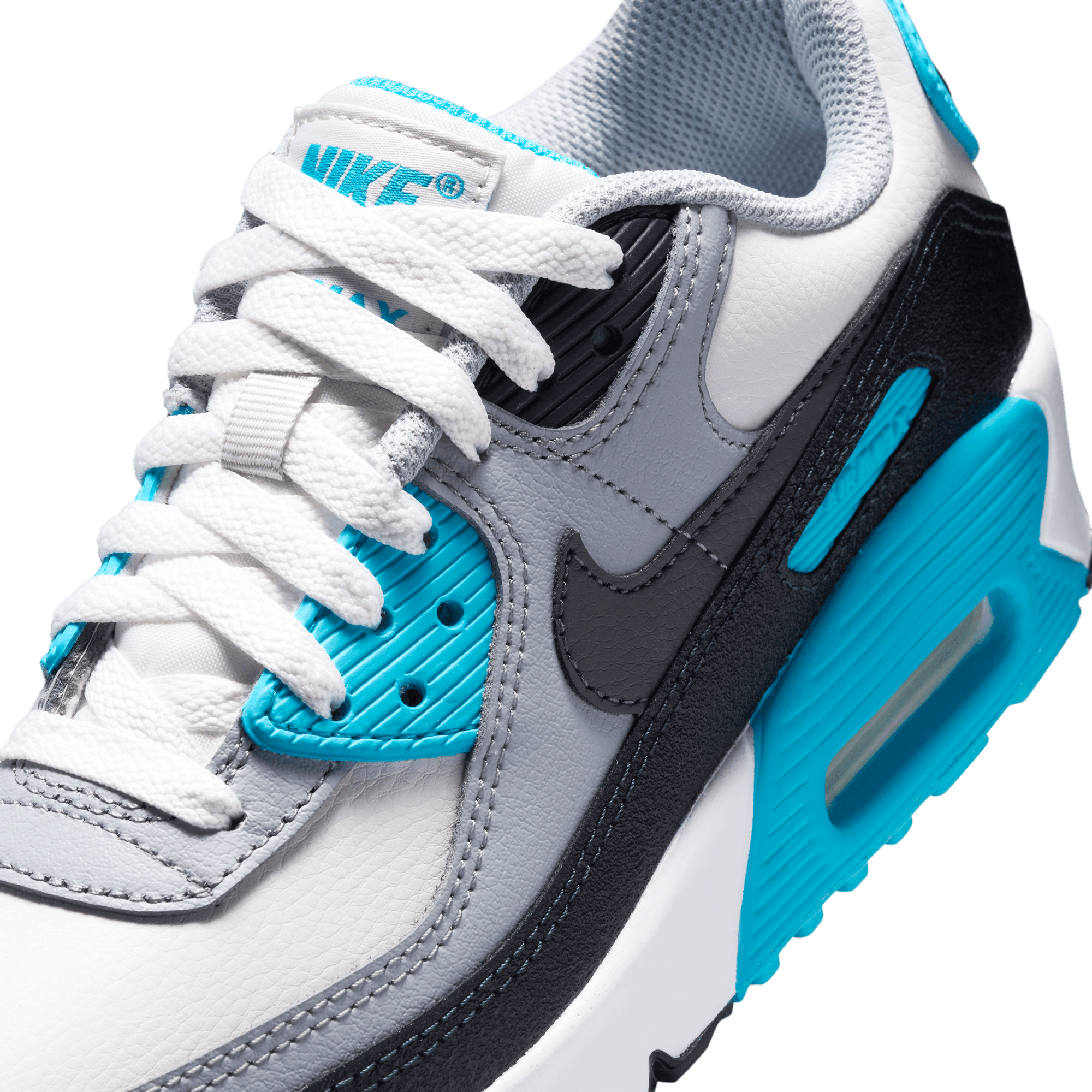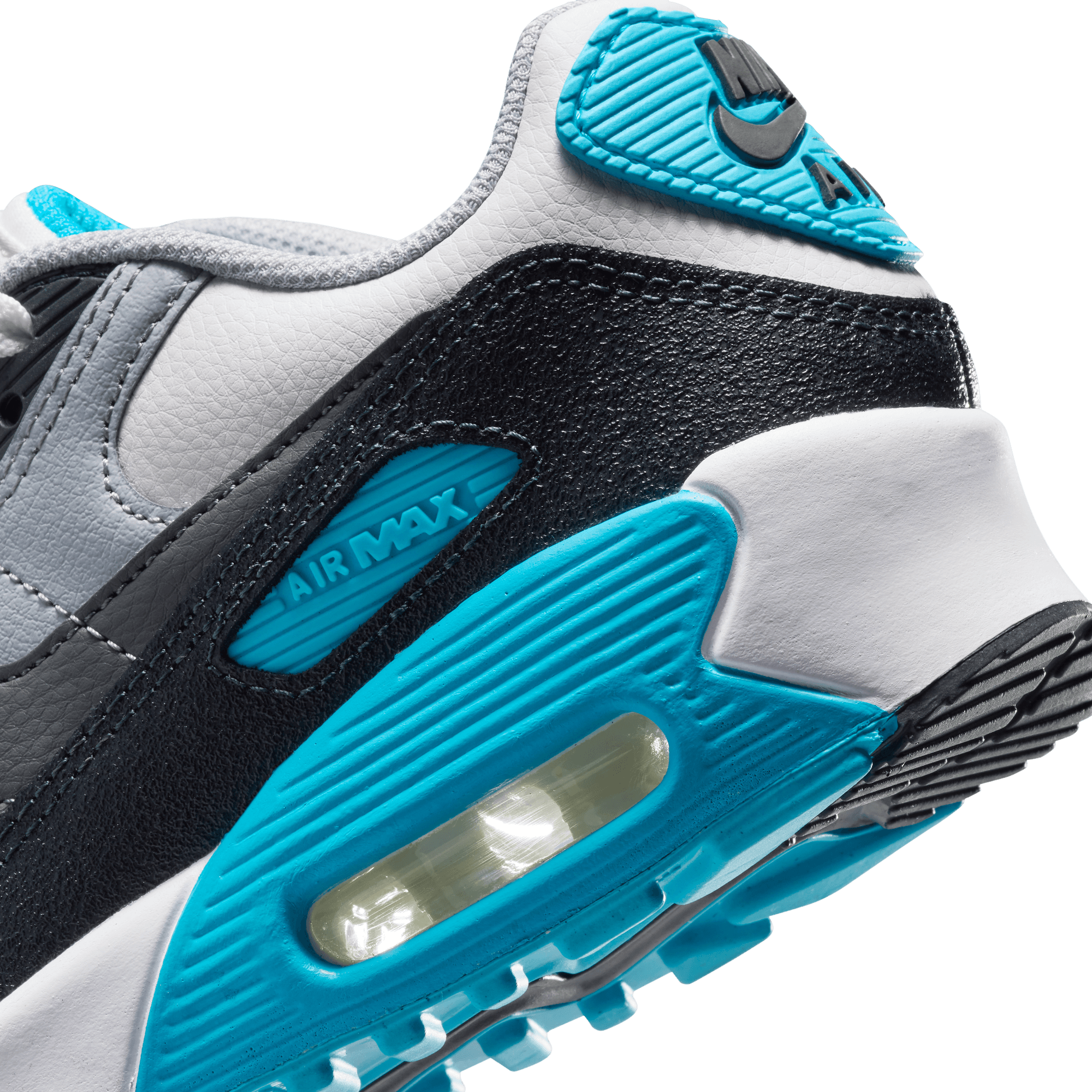 The Air Max 90 Leather upgrades a classic with an upper made from premium full-grain leather. This new colorway layers grey and black tumbled leather panels over a white leather base, with bright blue hitting the TPU overlays and tongue branding. A dark grey leather swoosh and branding on the heel badge, injected foam midsole with a Max Air unit in the heel and a black and blue rubber outsole complete the look.