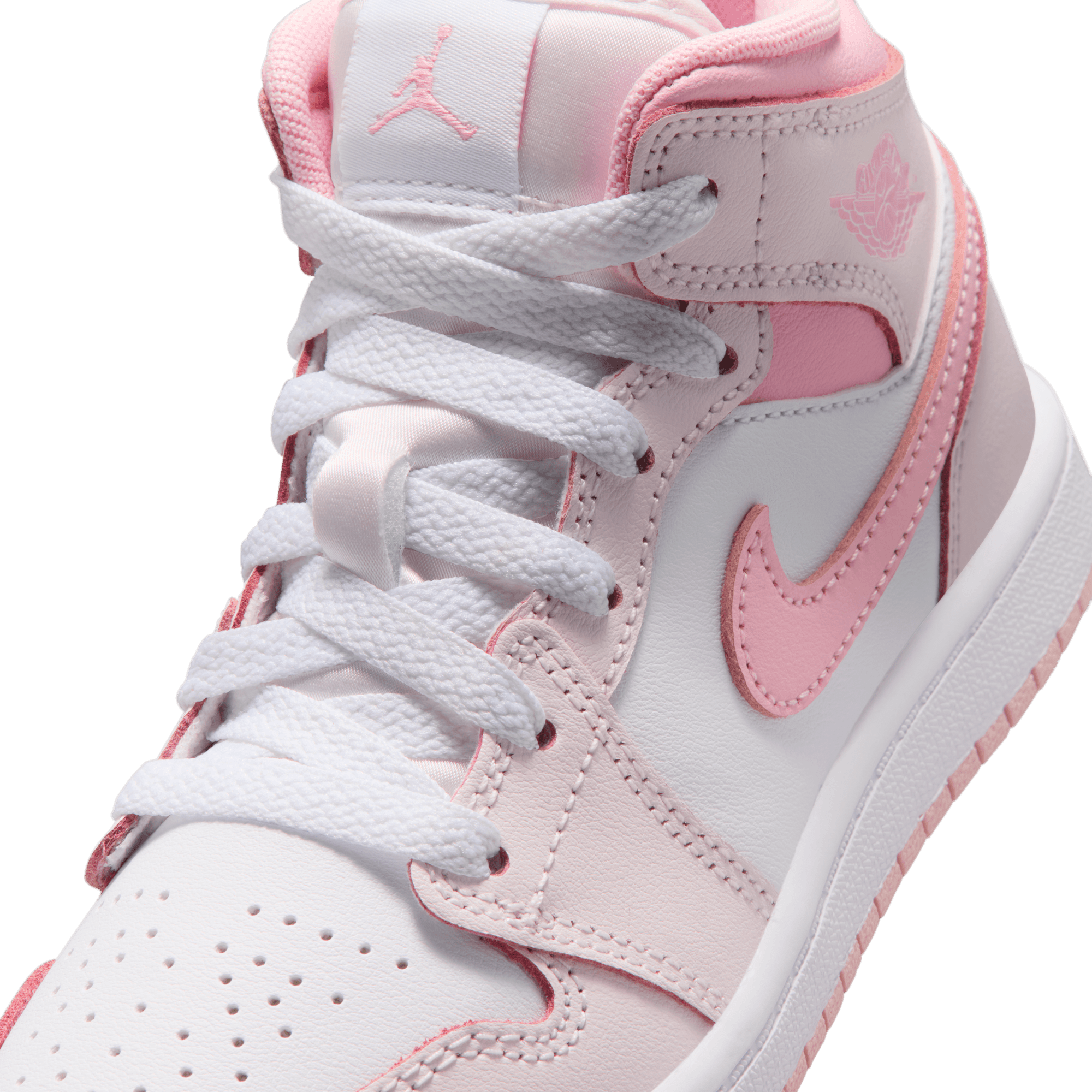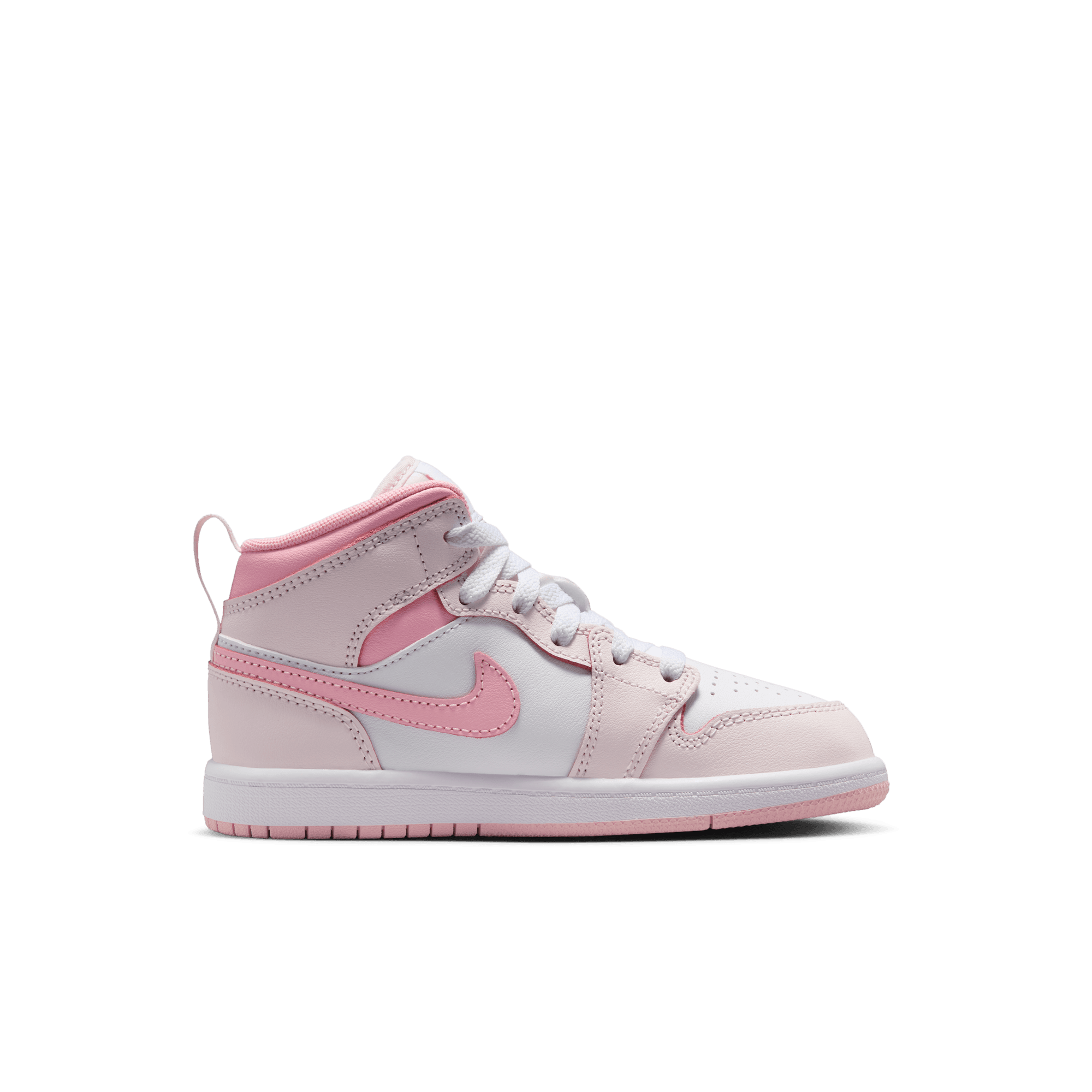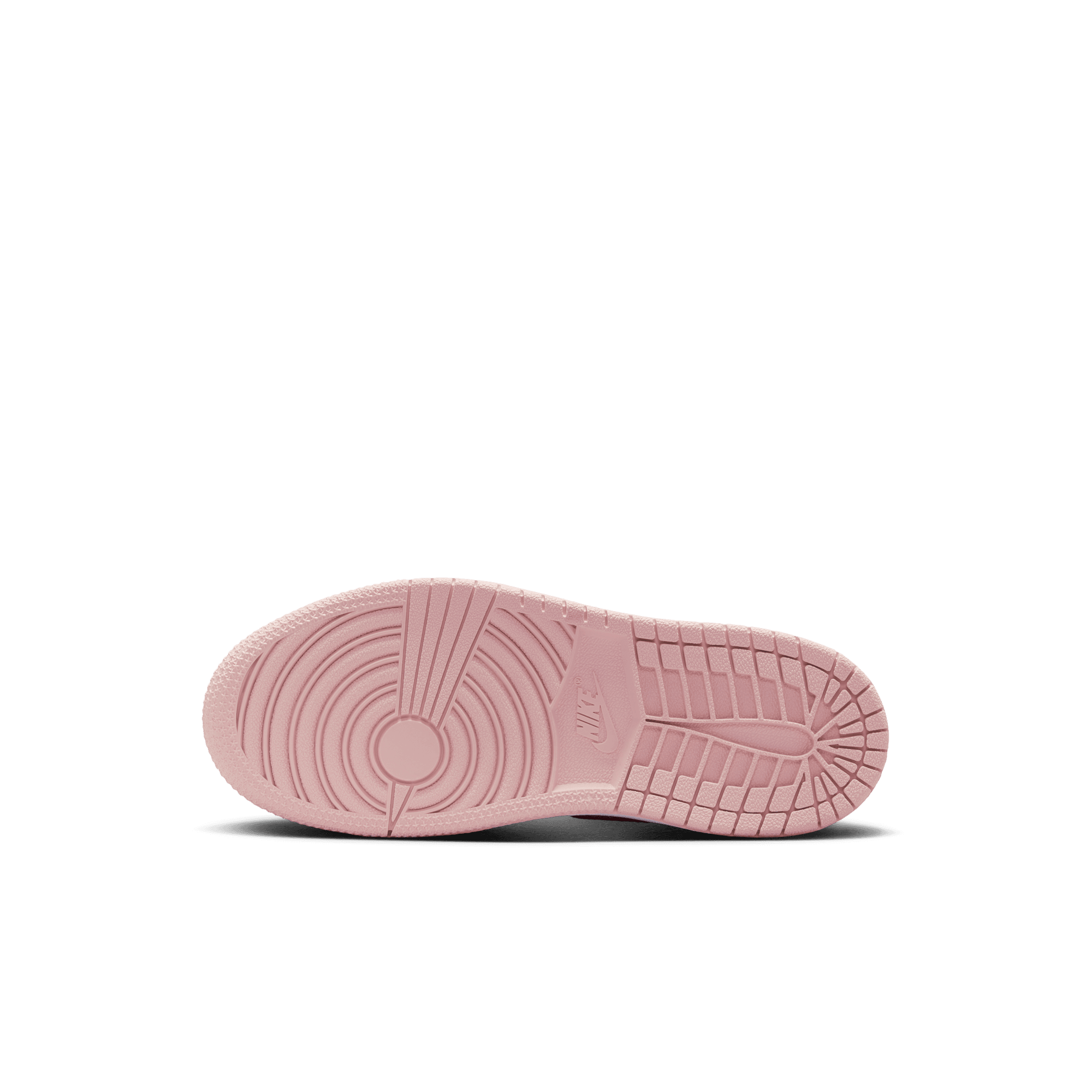 The mid top version of the original Air Jordan embodies everything you love about the Air Jordan 1. This version of the classic silhouette layers light pink leather panels on the toe cap, eyestay, swoosh, heel and ankle over the smooth white leather base with dark pink on the swoosh, collar, branding on the tongue tag and Wings logo. White laces, pink lining and tongue, white midsole and pink rubber outsole finish off the look of this AJ1 Mid.