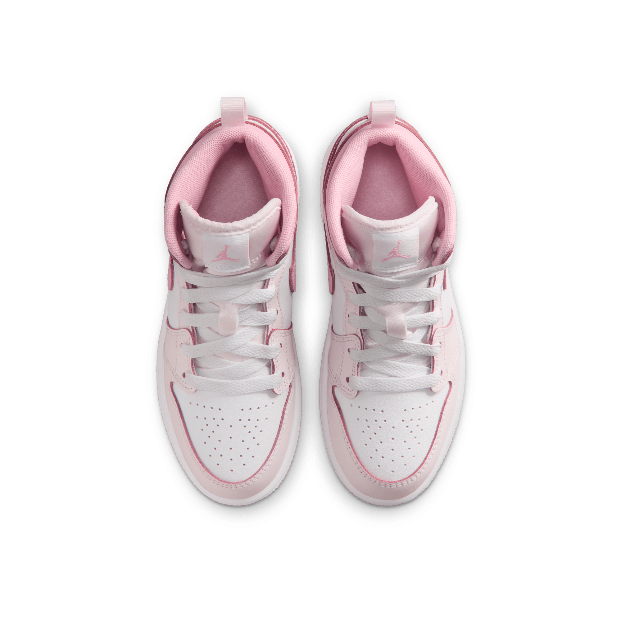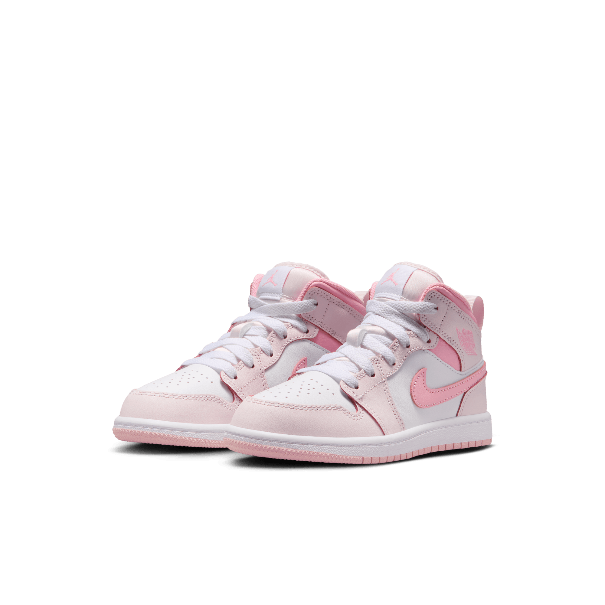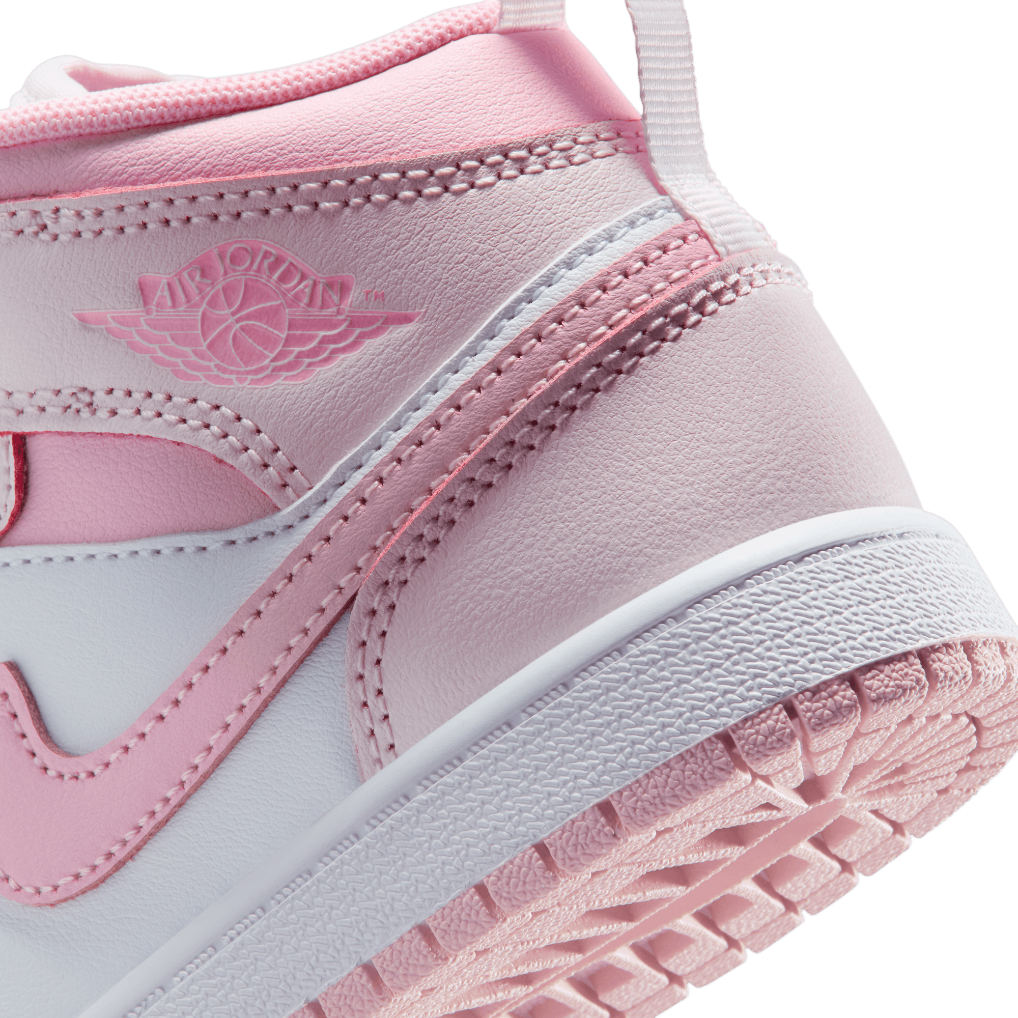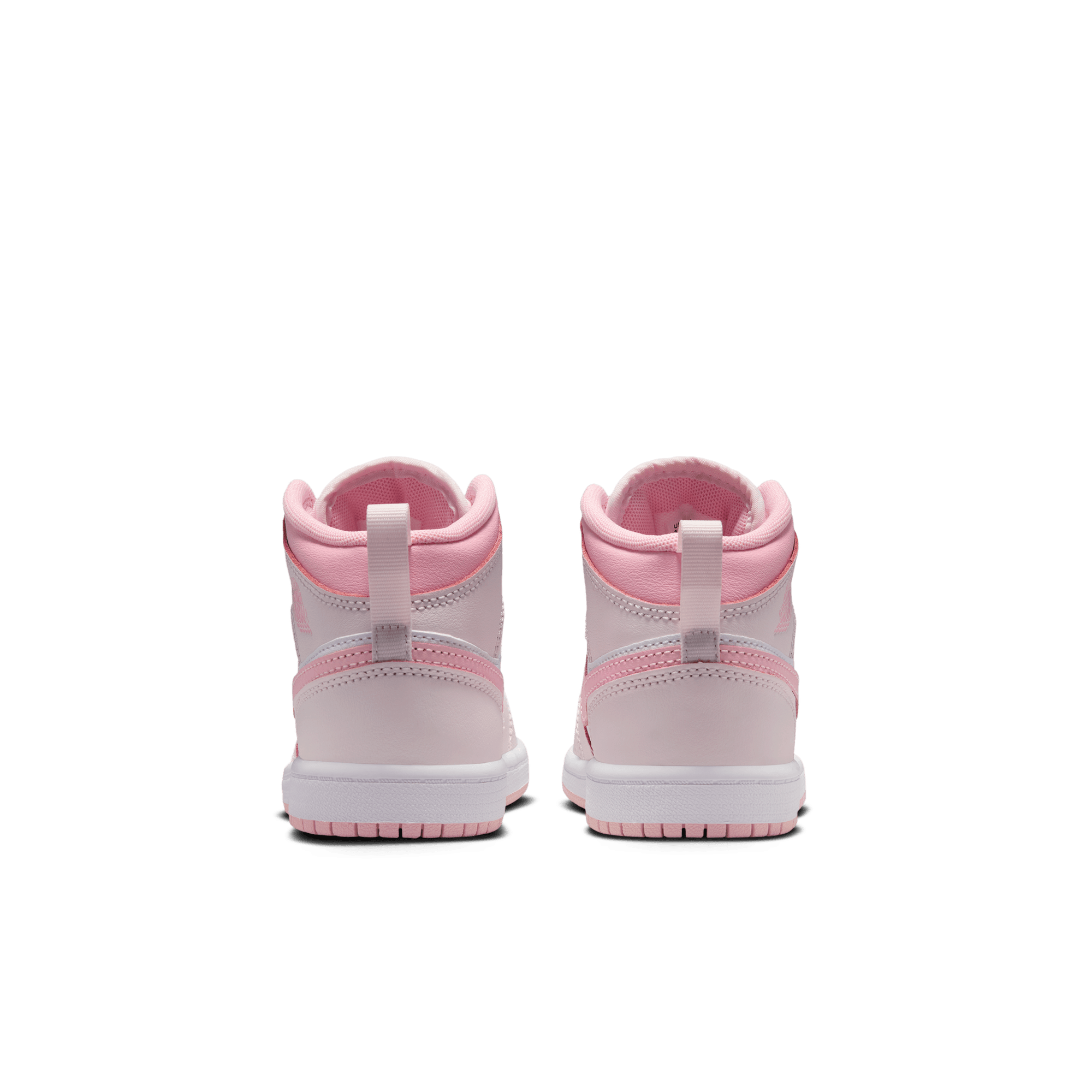 The mid top version of the original Air Jordan embodies everything you love about the Air Jordan 1. This version of the classic silhouette layers light pink leather panels on the toe cap, eyestay, swoosh, heel and ankle over the smooth white leather base with dark pink on the swoosh, collar, branding on the tongue tag and Wings logo. White laces, pink lining and tongue, white midsole and pink rubber outsole finish off the look of this AJ1 Mid.