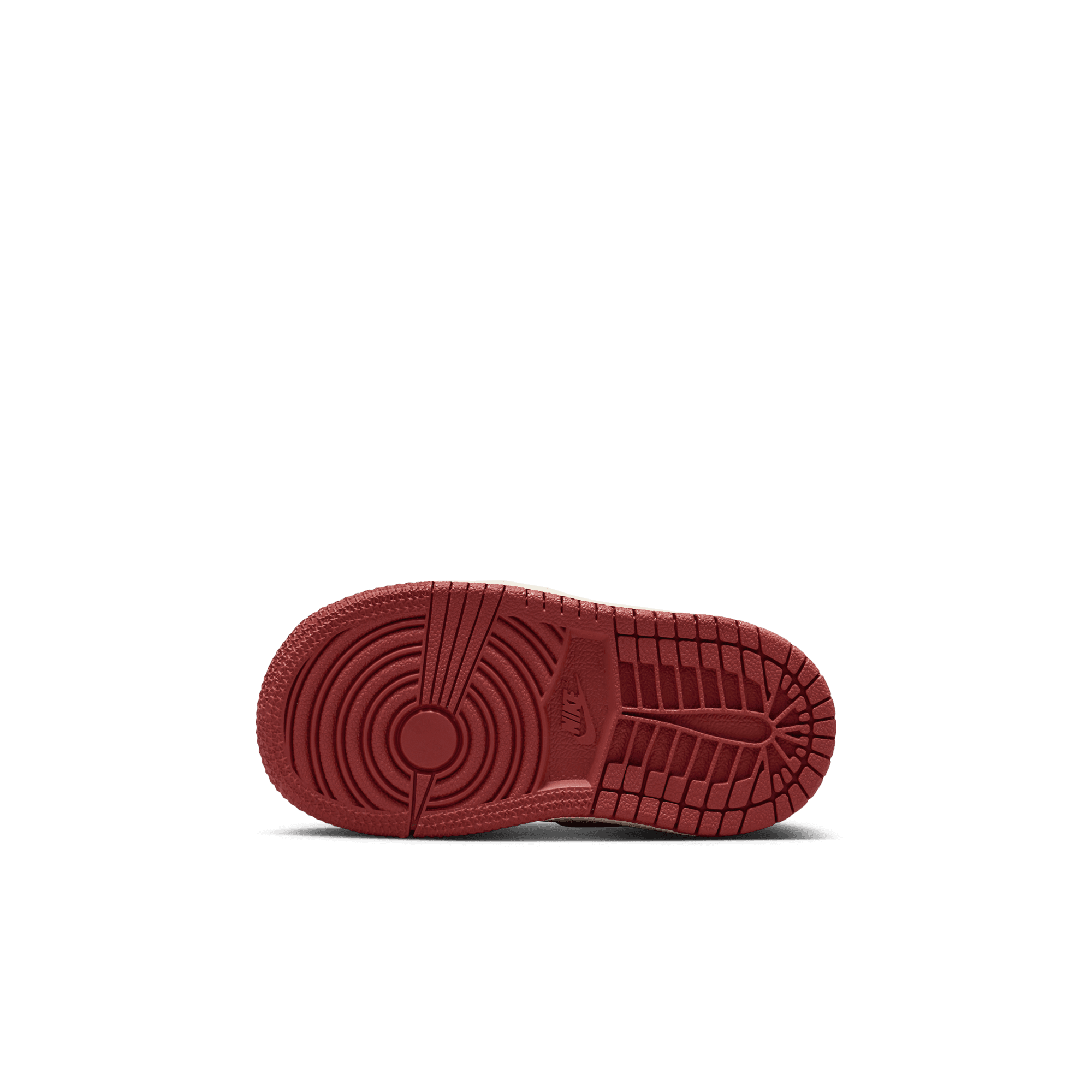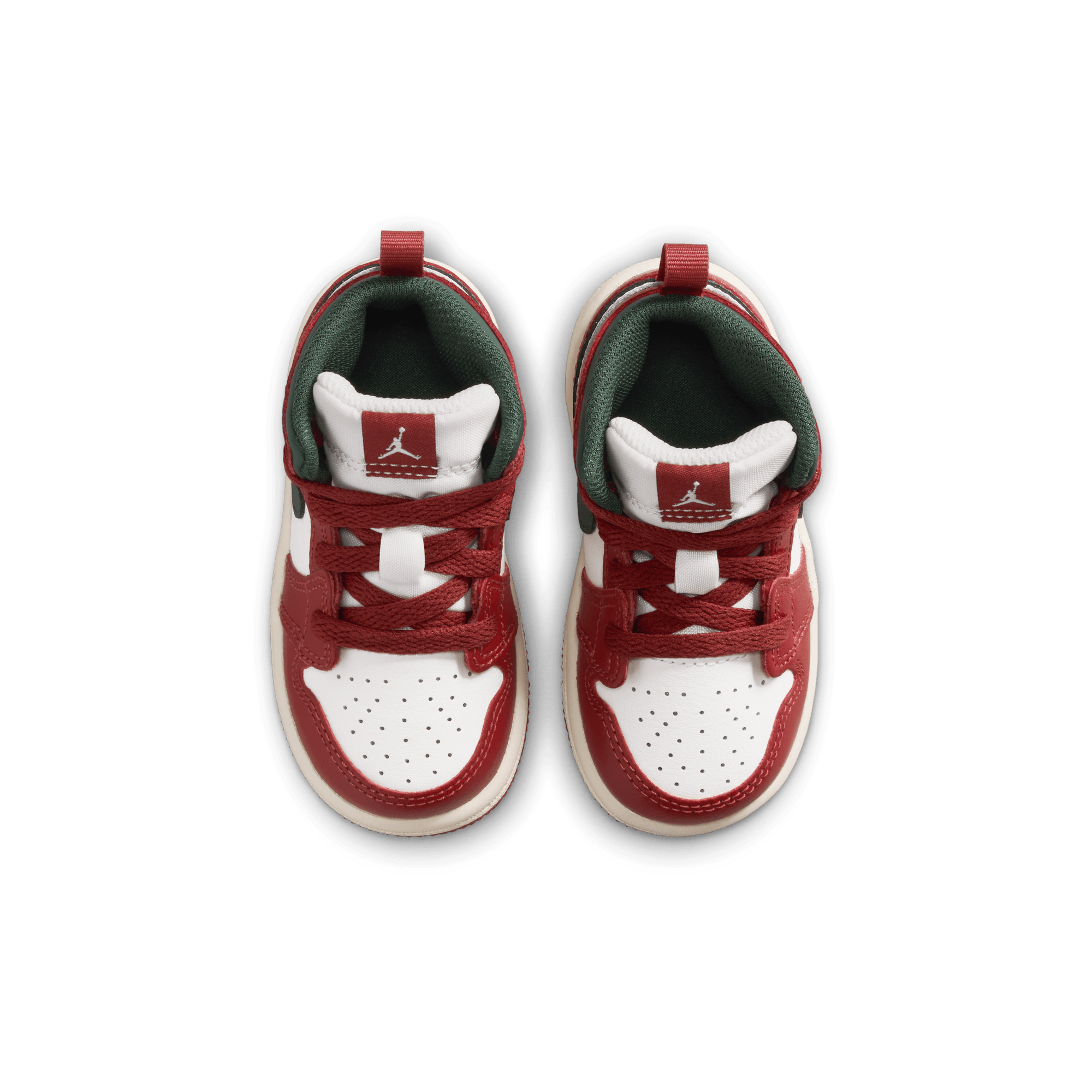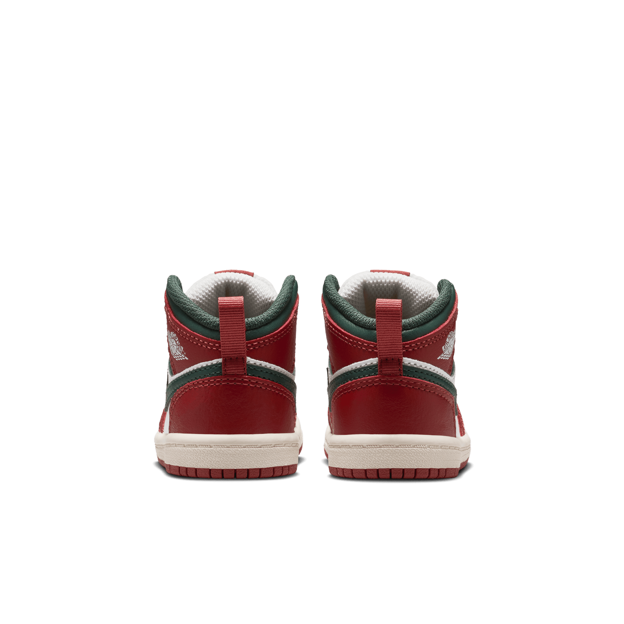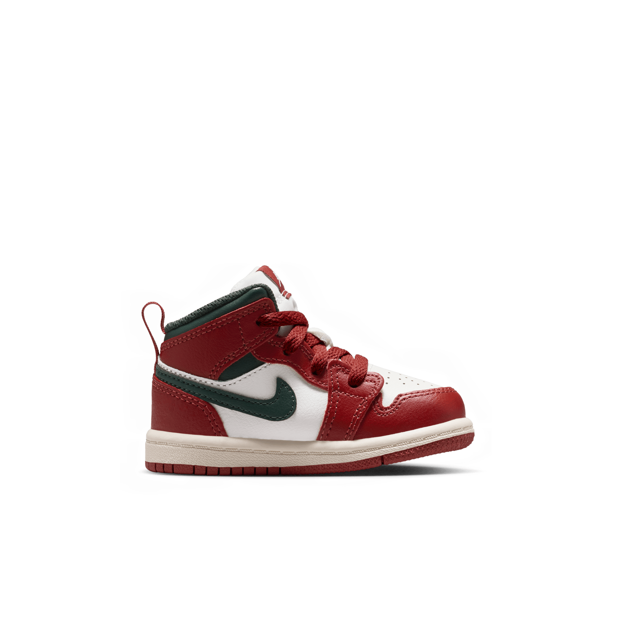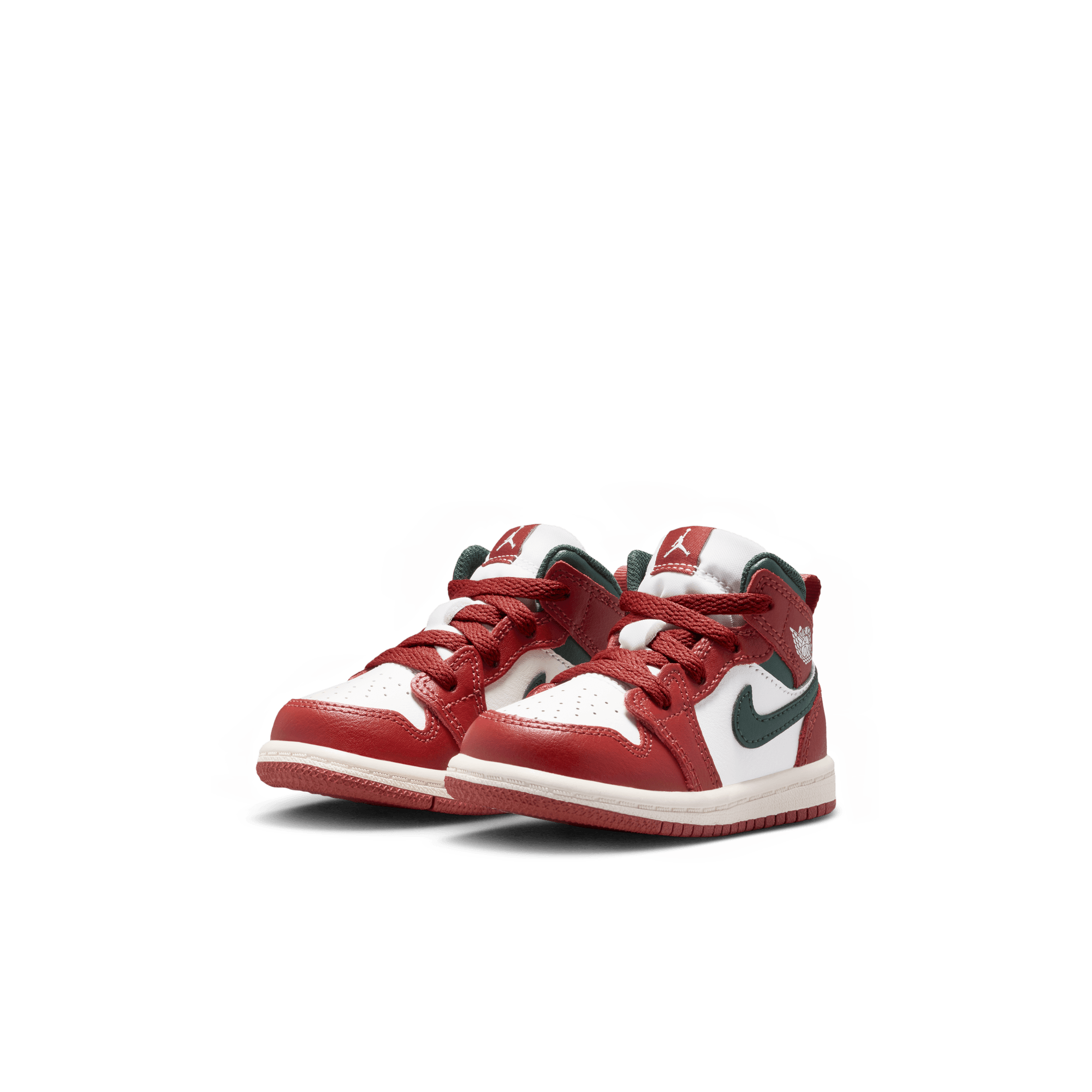 The mid top version of the original Air Jordan embodies everything you love about the Air Jordan 1. This version of the classic silhouette layers red leather panels on the toe cap, eyestay, heel and ankle over the smooth white leather base with dark green on the swoosh and collar. White branding on the red tongue tag and Wings logo, white laces, green lining, white midsole and red rubber outsole finish off the look of this AJ1 Mid.