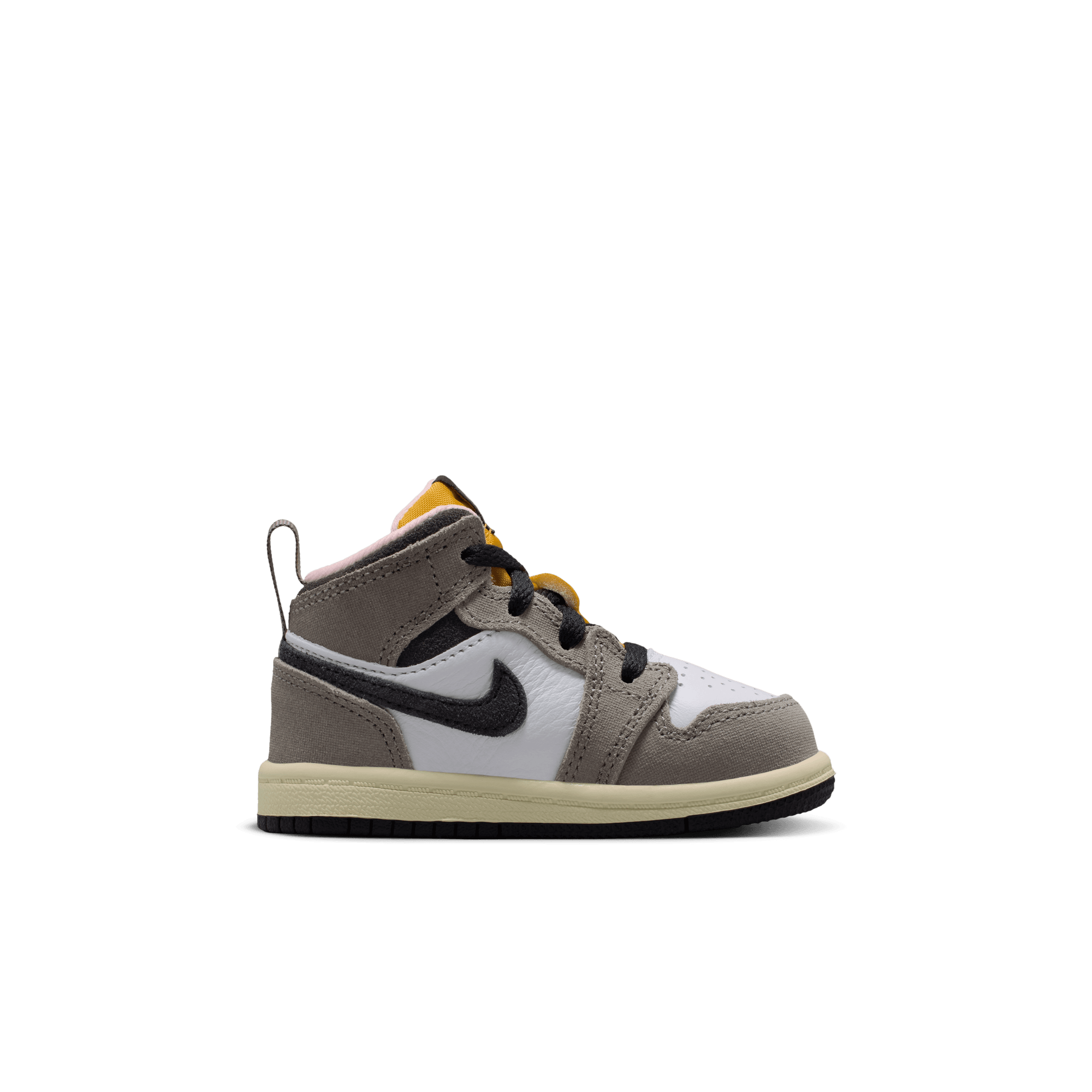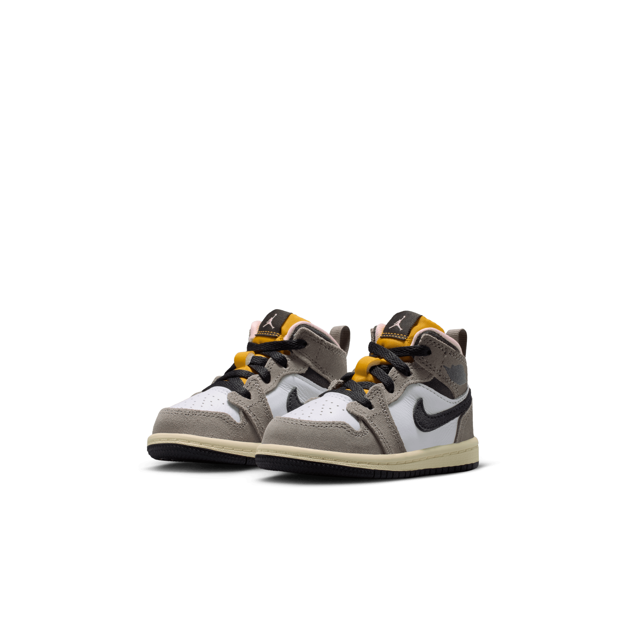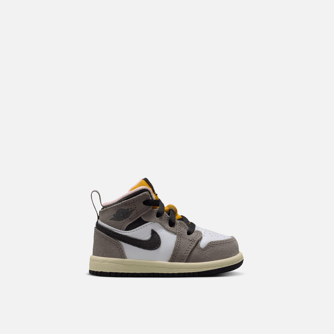 Jordan Brand cooks up a beautifully refined mid top version of MJ's debut signature, the Air Jordan 1 Mid SE "Oil Grey". The beautiful combination pairs premium grey nubuck on the heel, collar, toe and eyestay over a smooth white leather base. Black leather hits the collar and swoosh, along with the tongue tag and black Wings logo stamped on the ankle. A striking yellow on the Jumpman and tongue and pink lining set this edition apart, while a cream midsole and black outsole finish off the look.