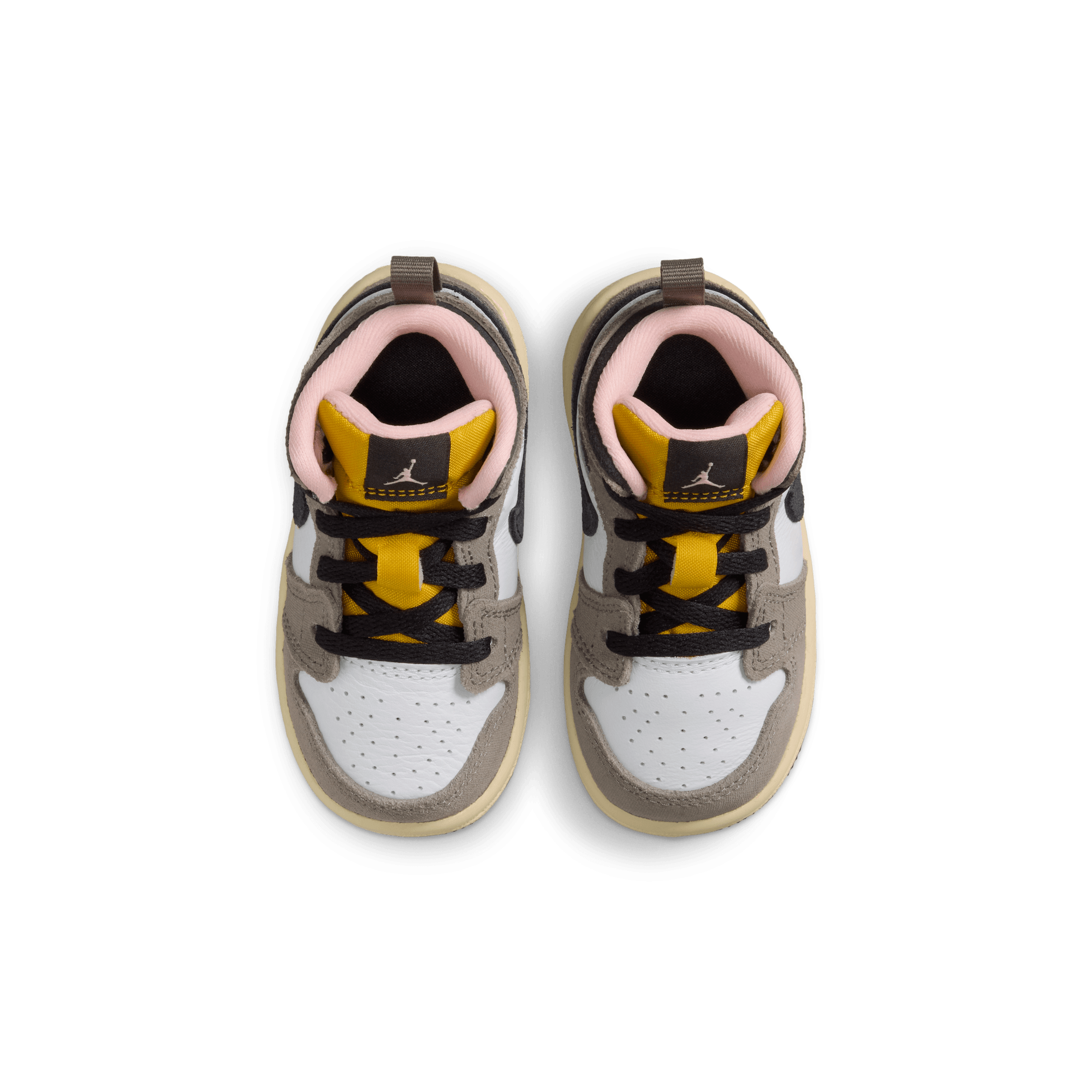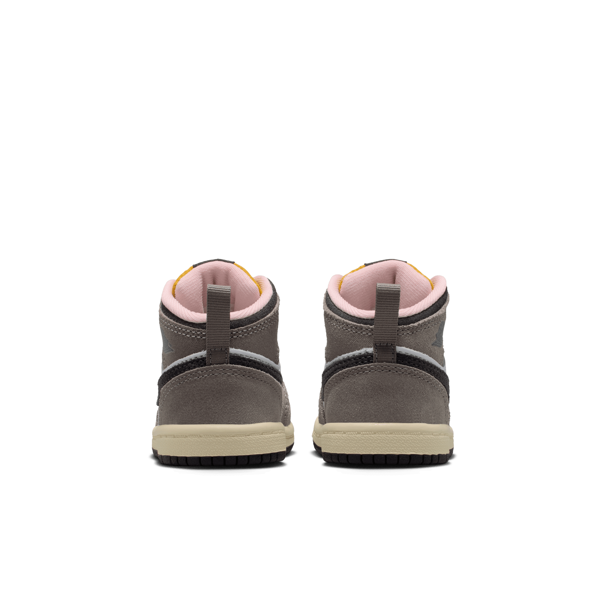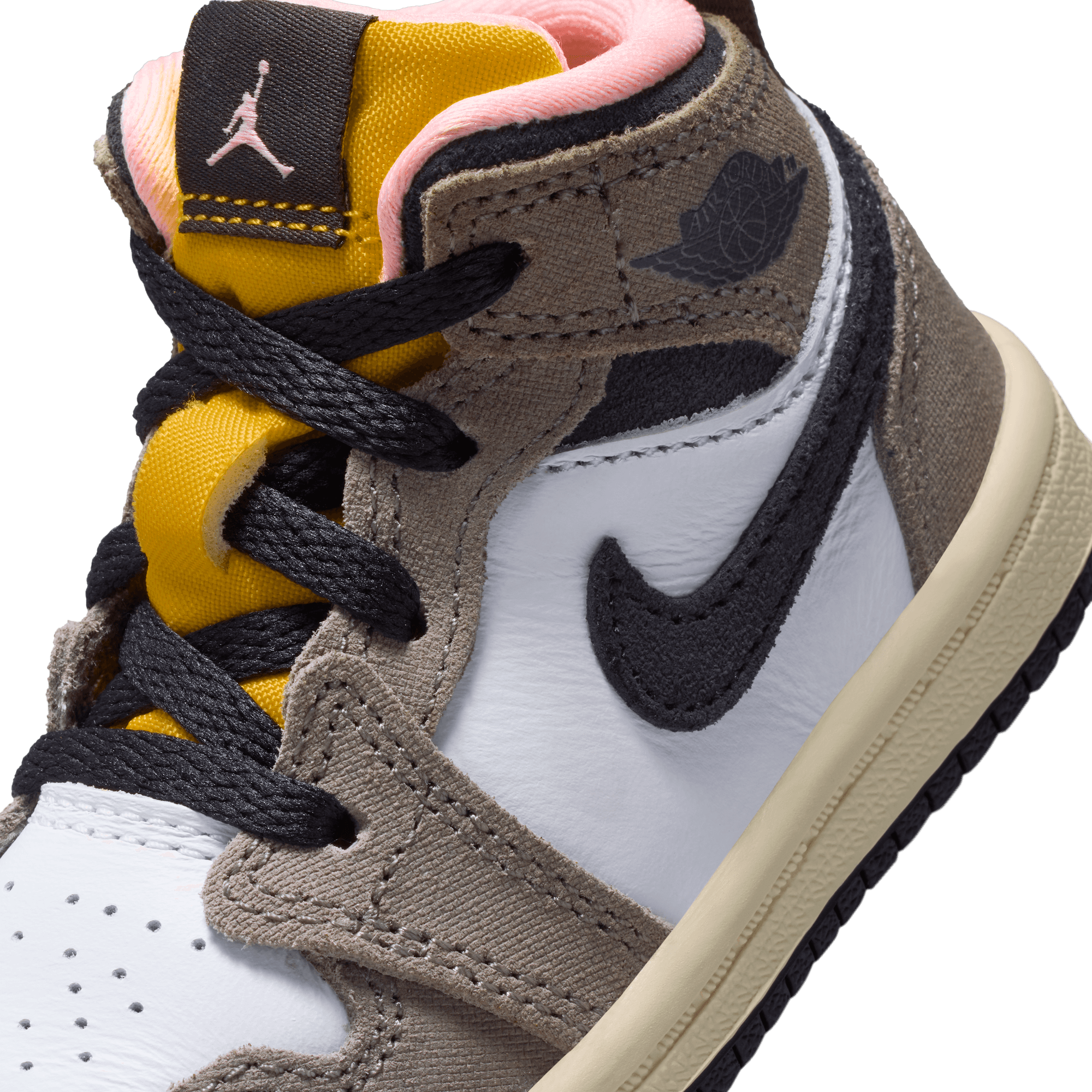 Jordan Brand cooks up a beautifully refined mid top version of MJ's debut signature, the Air Jordan 1 Mid SE "Oil Grey". The beautiful combination pairs premium grey nubuck on the heel, collar, toe and eyestay over a smooth white leather base. Black leather hits the collar and swoosh, along with the tongue tag and black Wings logo stamped on the ankle. A striking yellow on the Jumpman and tongue and pink lining set this edition apart, while a cream midsole and black outsole finish off the look.