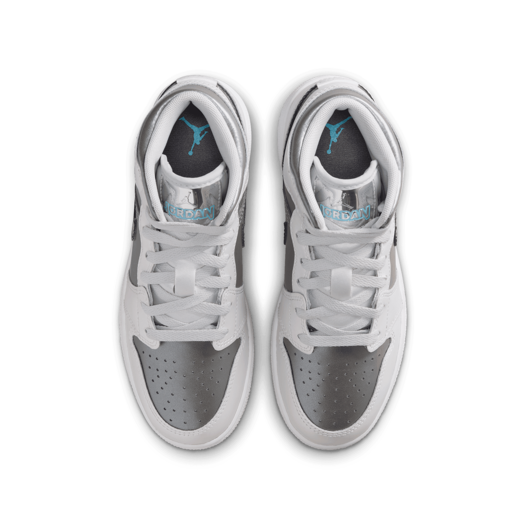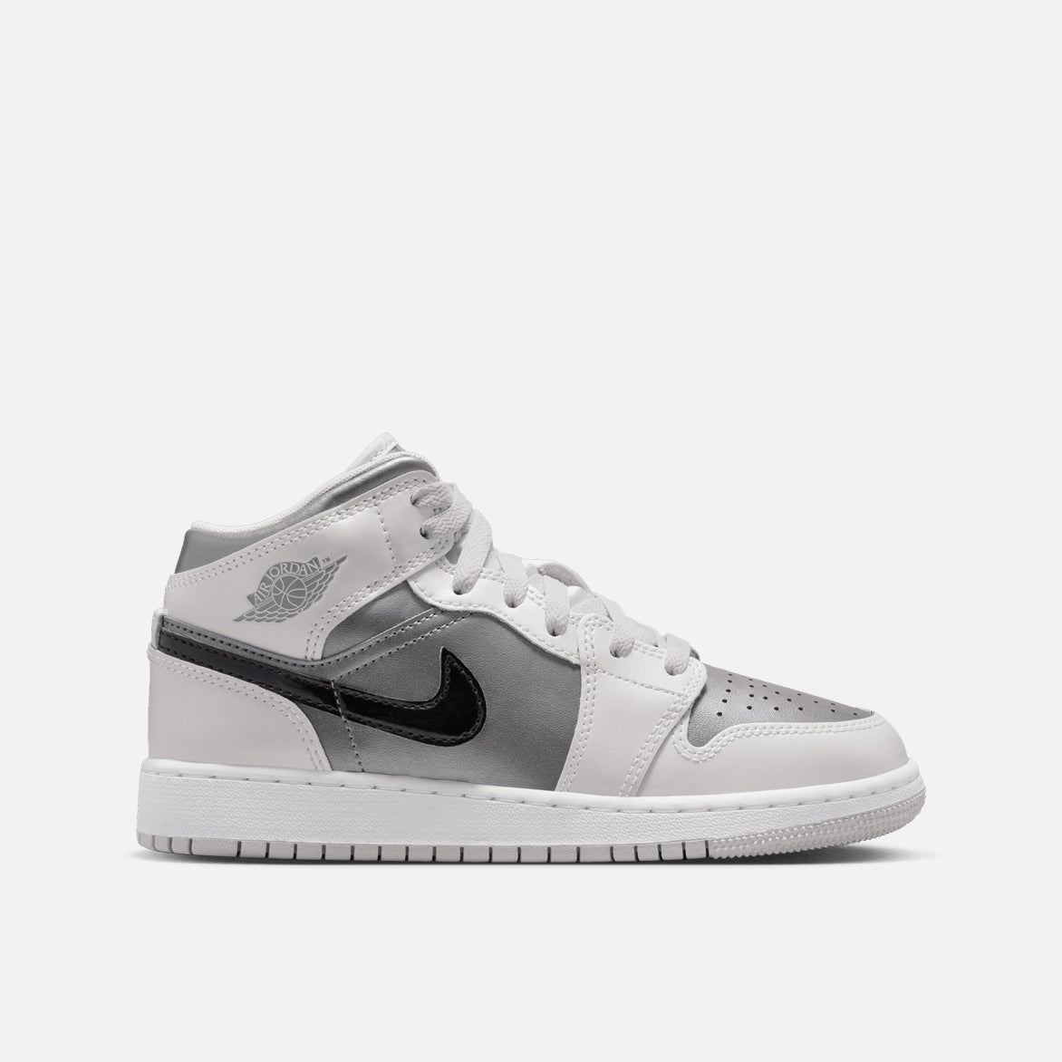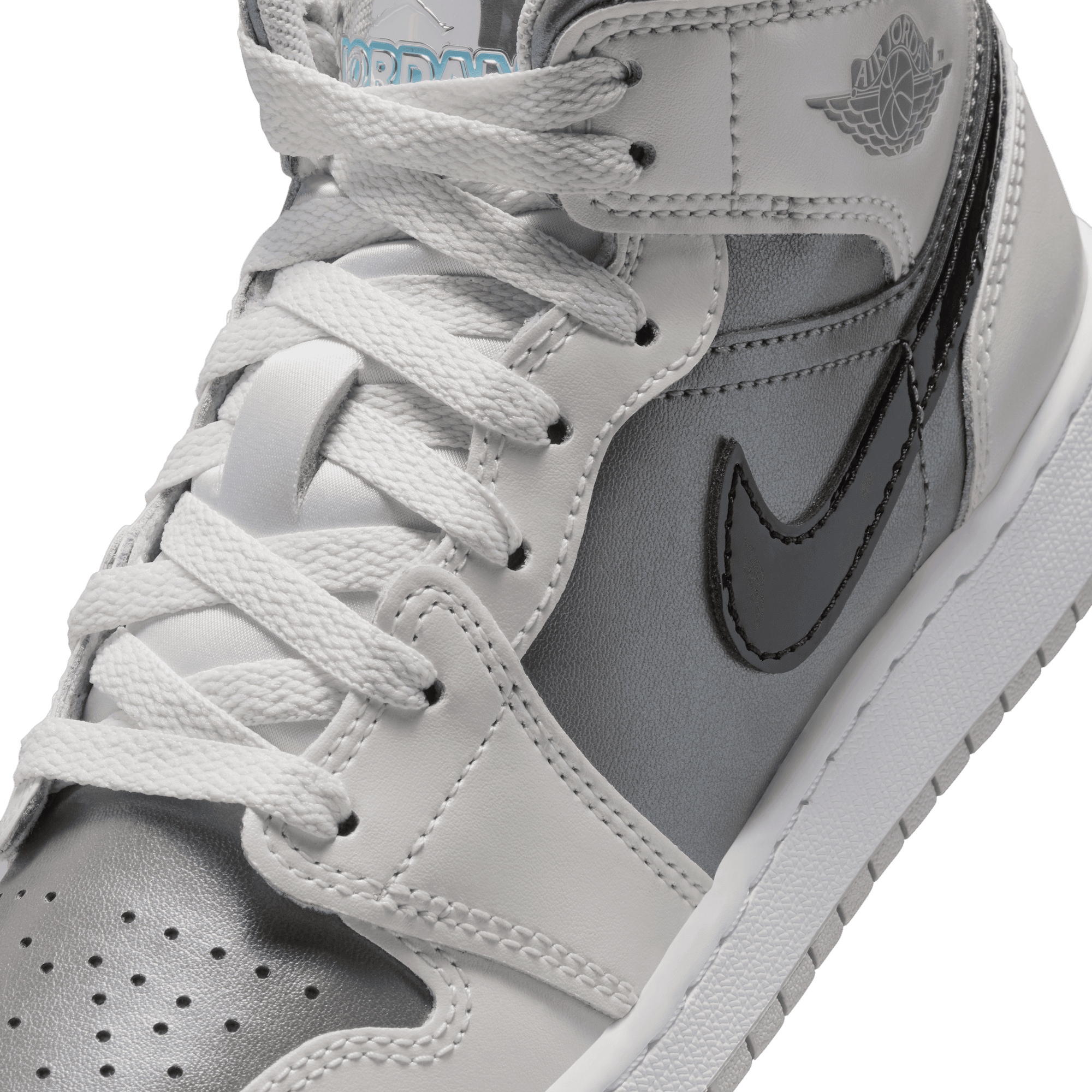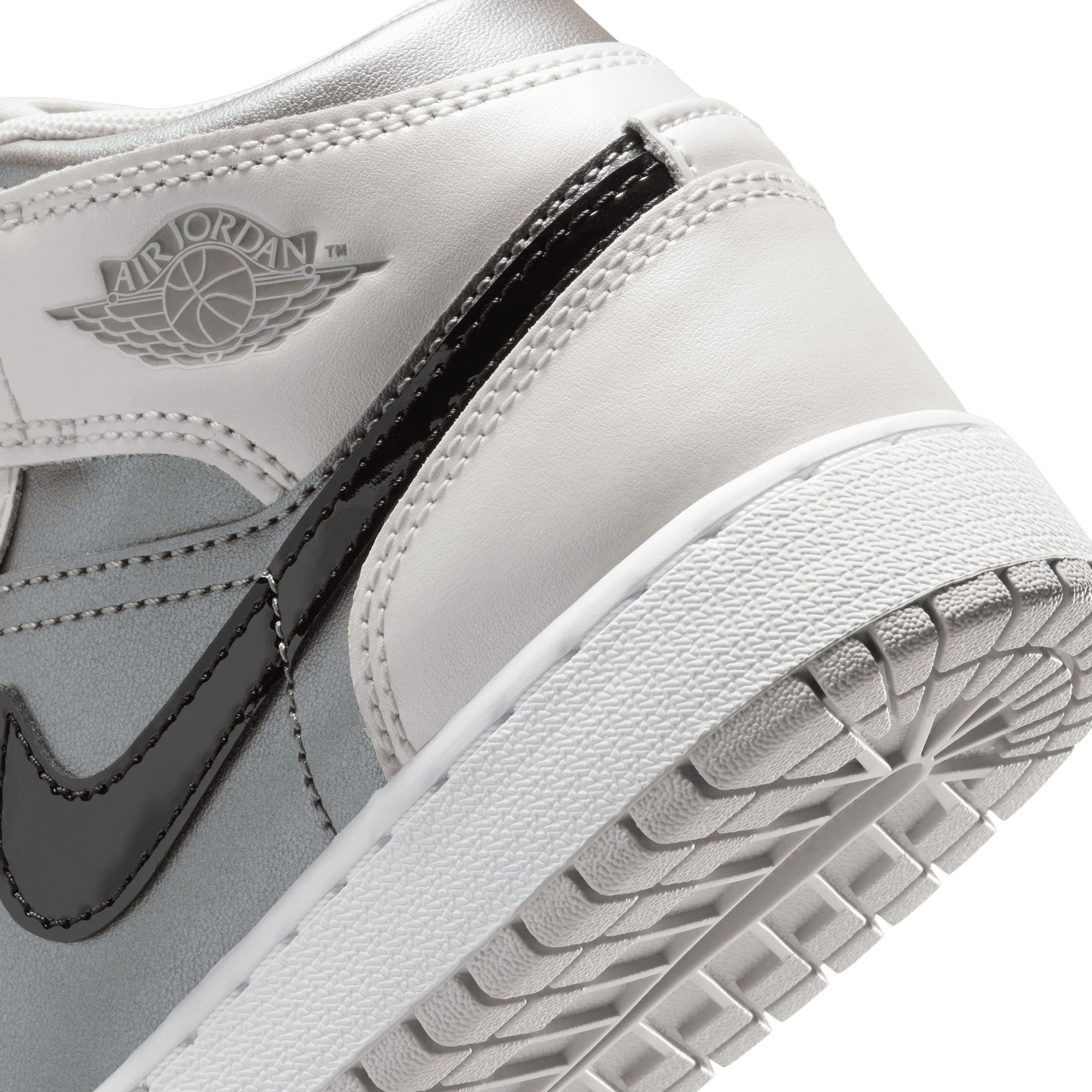 Jordan Brand cooks up a beautifully refined mid top version of MJ's debut signature, the Air Jordan 1 Mid SE "Photon Dust/Blue Chill". Arriving as part of the "Inspired By The Greatest" series of kids exclusive retros, the shoe is built from a smooth white leather upper with metallic dark grey underlays on the sides and toe, and a black patent leather swoosh. A metallic silver "Inspired by the Greatest" tongue tag is the standout detail, while a a grey Wongs logo stamped on the ankle, white midsole and light grey outsole finish off the look.