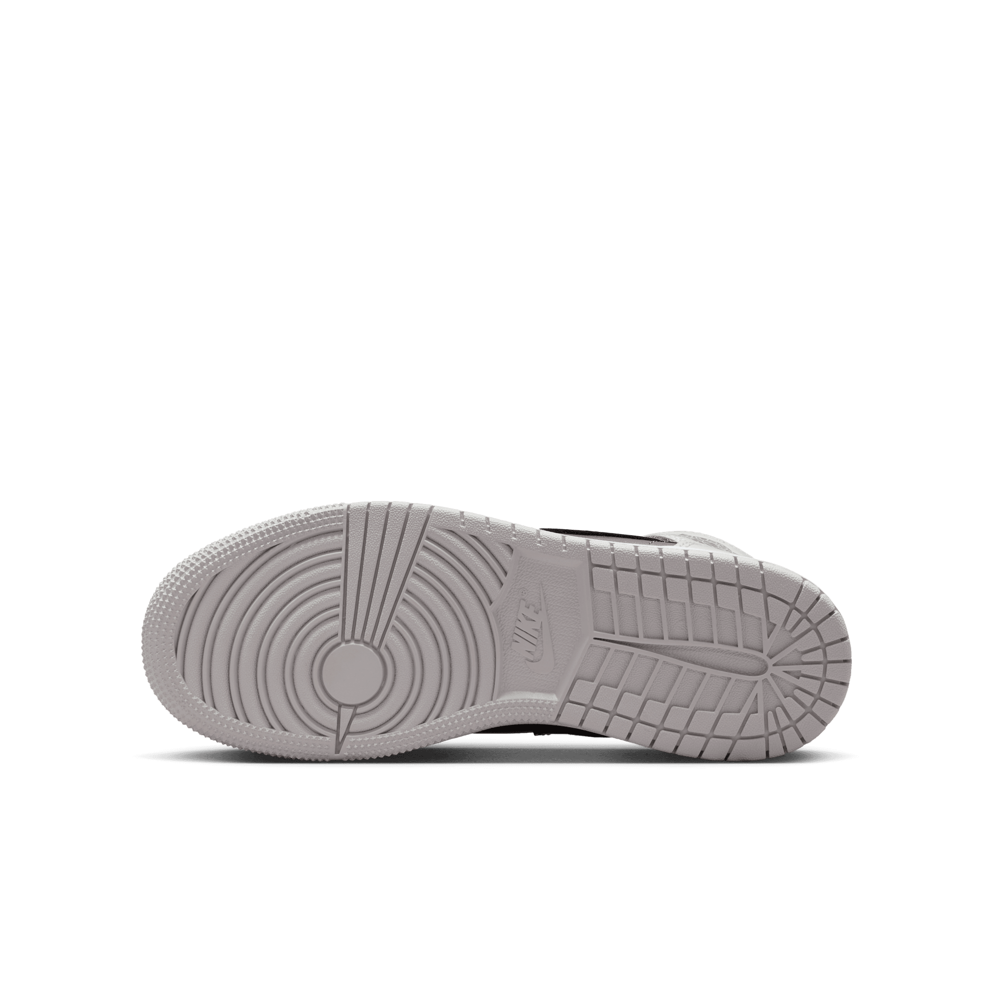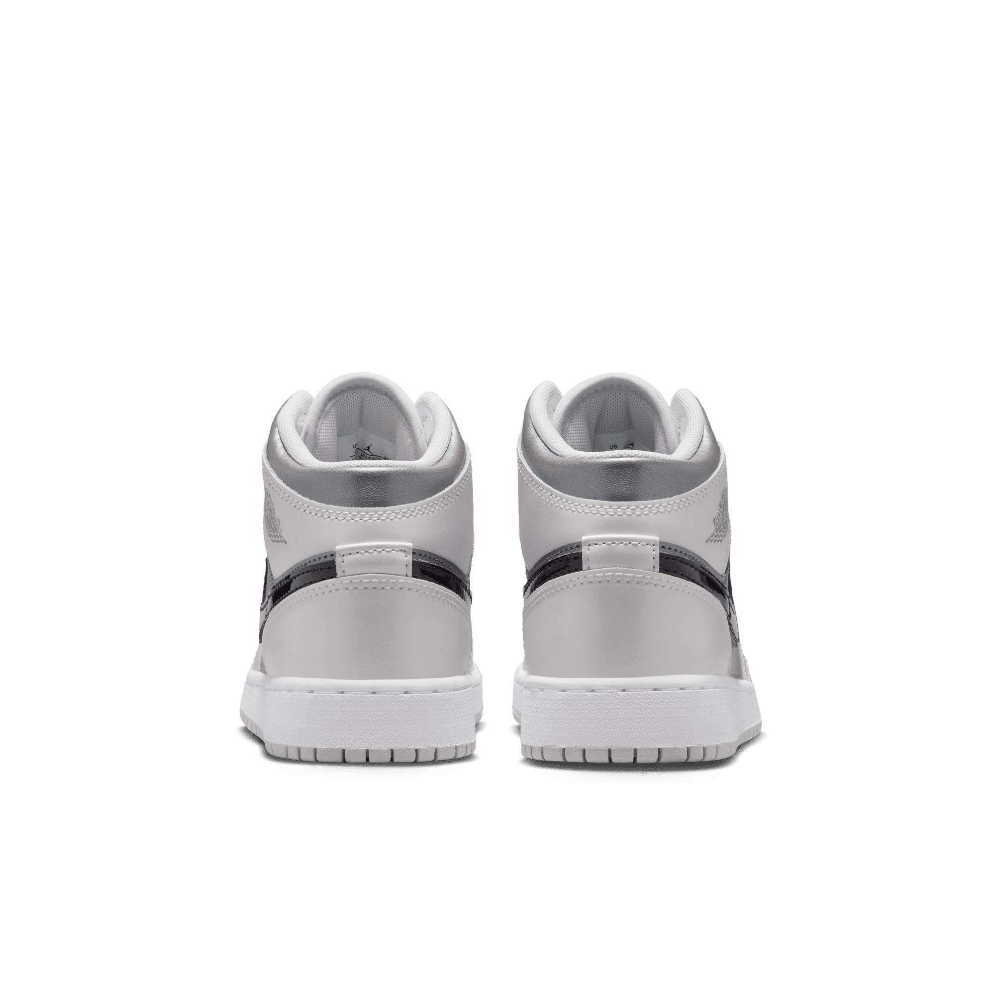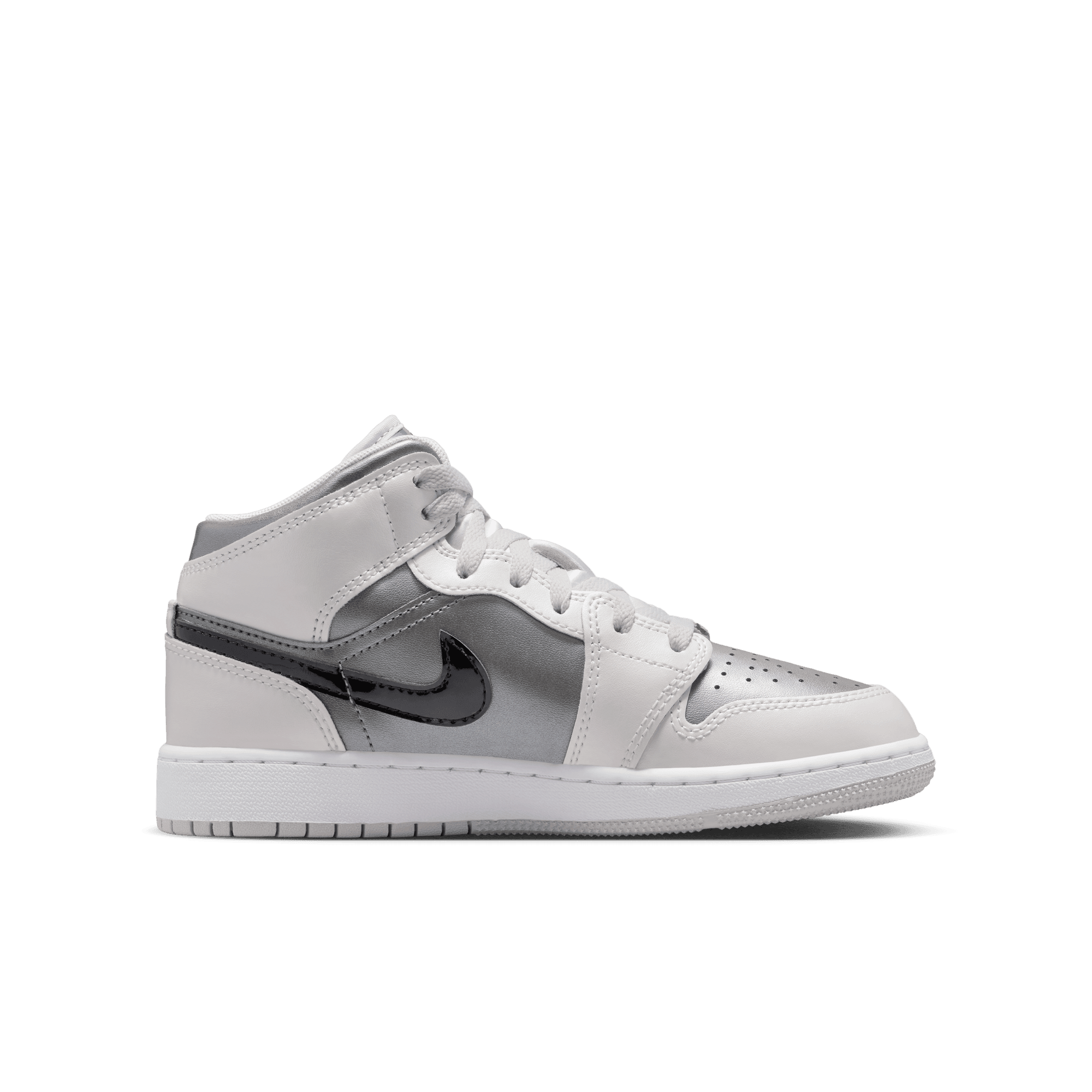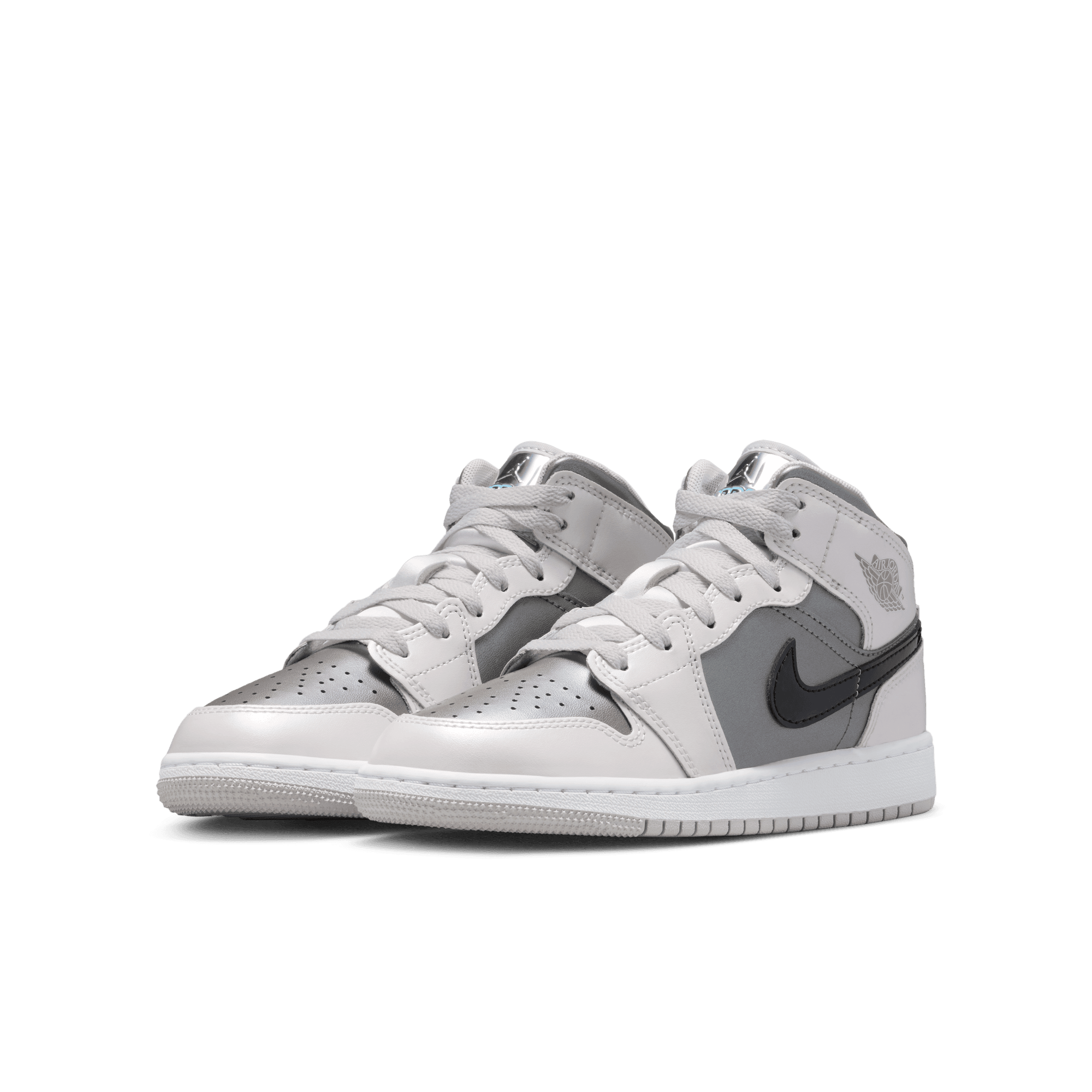 Jordan Brand cooks up a beautifully refined mid top version of MJ's debut signature, the Air Jordan 1 Mid SE "Photon Dust/Blue Chill". Arriving as part of the "Inspired By The Greatest" series of kids exclusive retros, the shoe is built from a smooth white leather upper with metallic dark grey underlays on the sides and toe, and a black patent leather swoosh. A metallic silver "Inspired by the Greatest" tongue tag is the standout detail, while a a grey Wongs logo stamped on the ankle, white midsole and light grey outsole finish off the look.