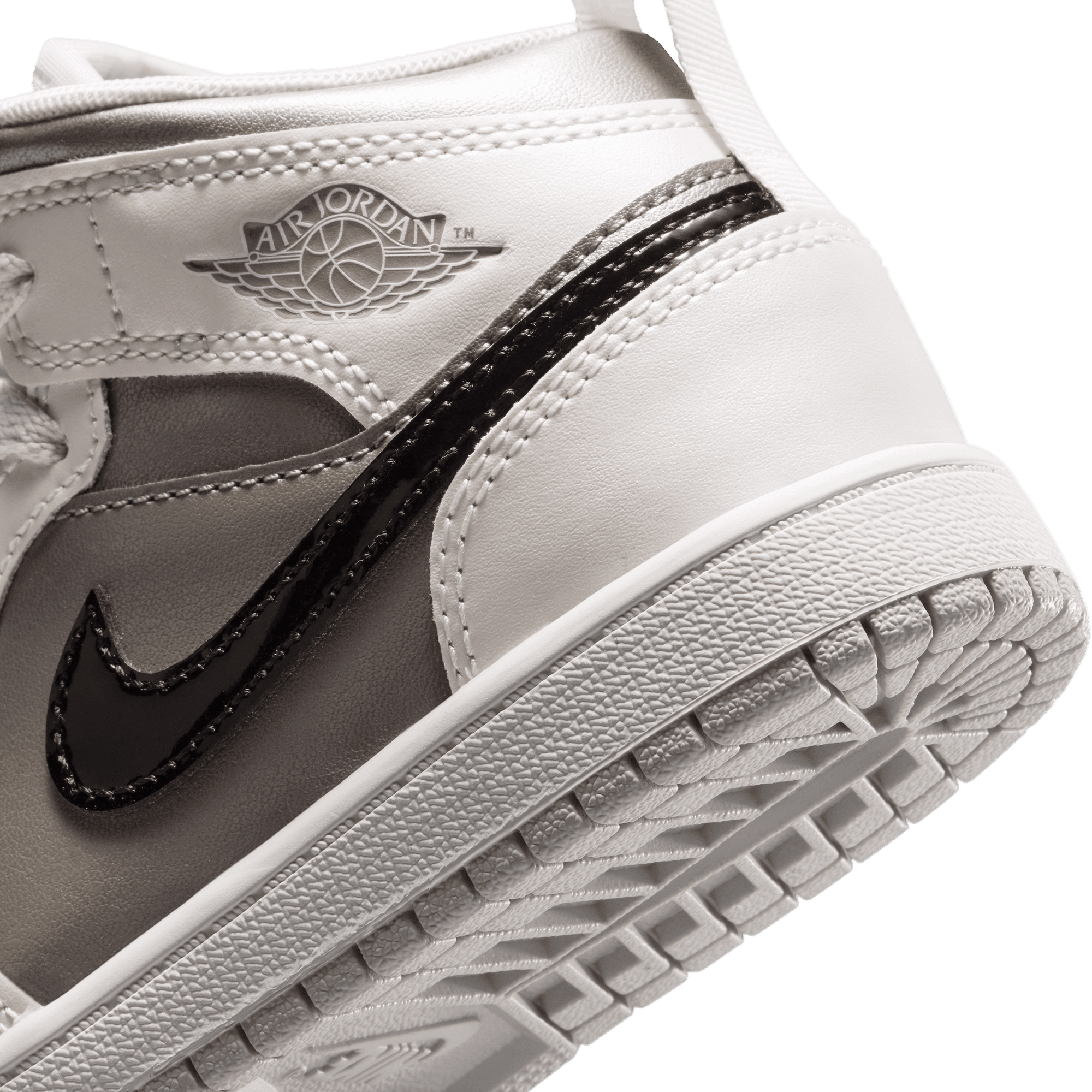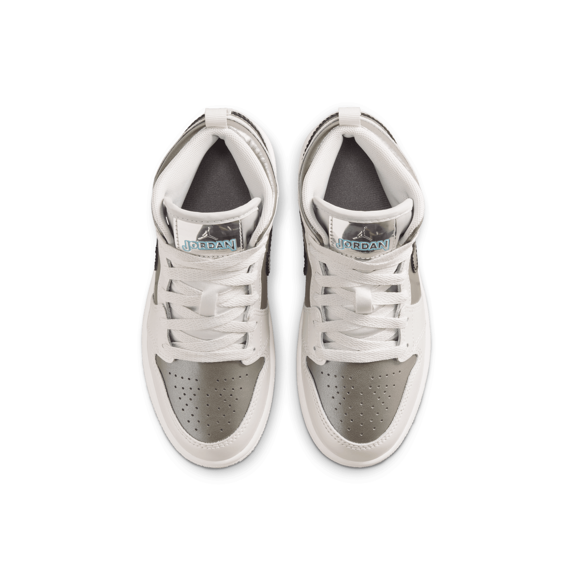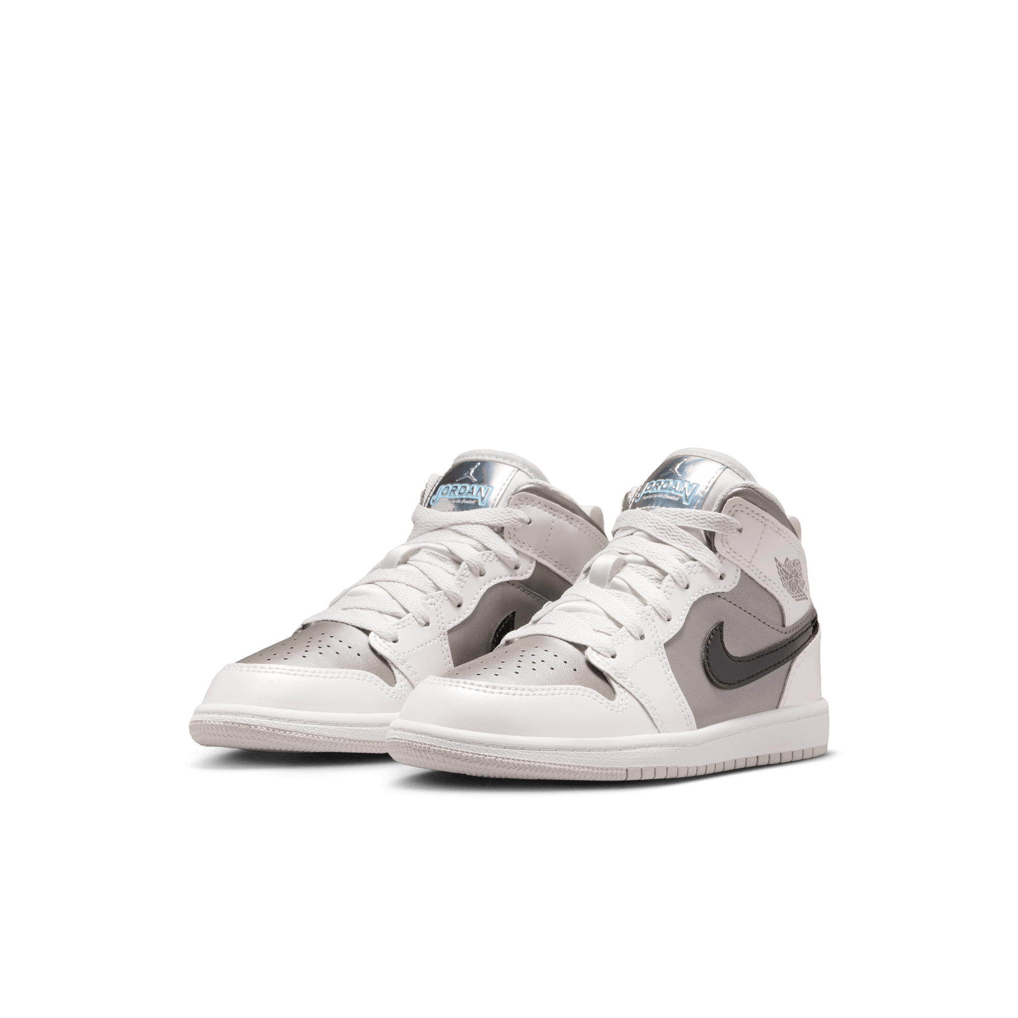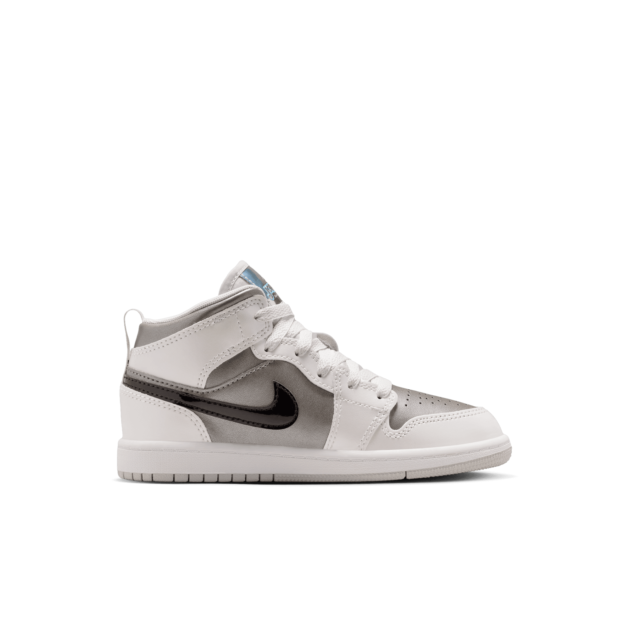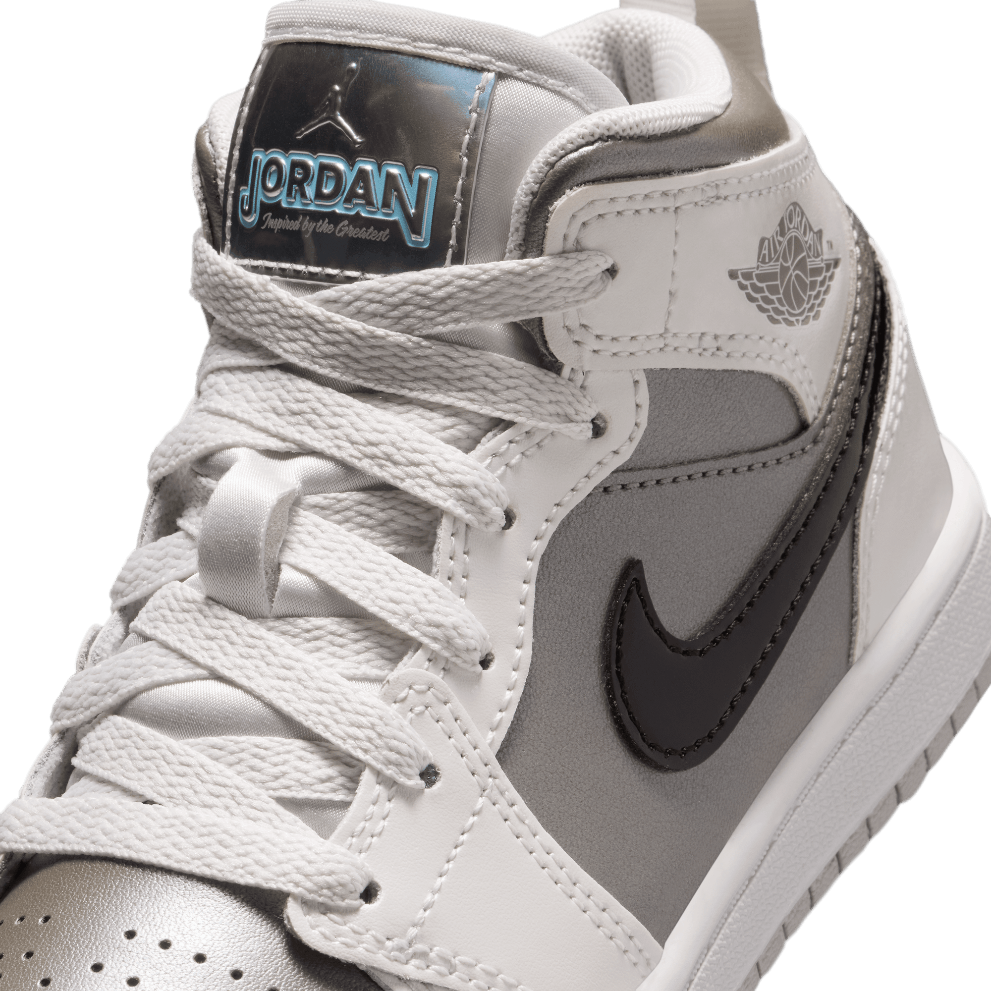 Jordan Brand cooks up a beautifully refined mid top version of MJ's debut signature, the Air Jordan 1 Mid SE "Photon Dust/Blue Chill". Arriving as part of the "Inspired By The Greatest" series of kids exclusive retros, the shoe is built from a smooth white leather upper with metallic dark grey underlays on the sides and toe, and a black patent leather swoosh. A metallic silver "Inspired by the Greatest" tongue tag is the standout detail, while a a grey Wongs logo stamped on the ankle, white midsole and light grey outsole finish off the look.