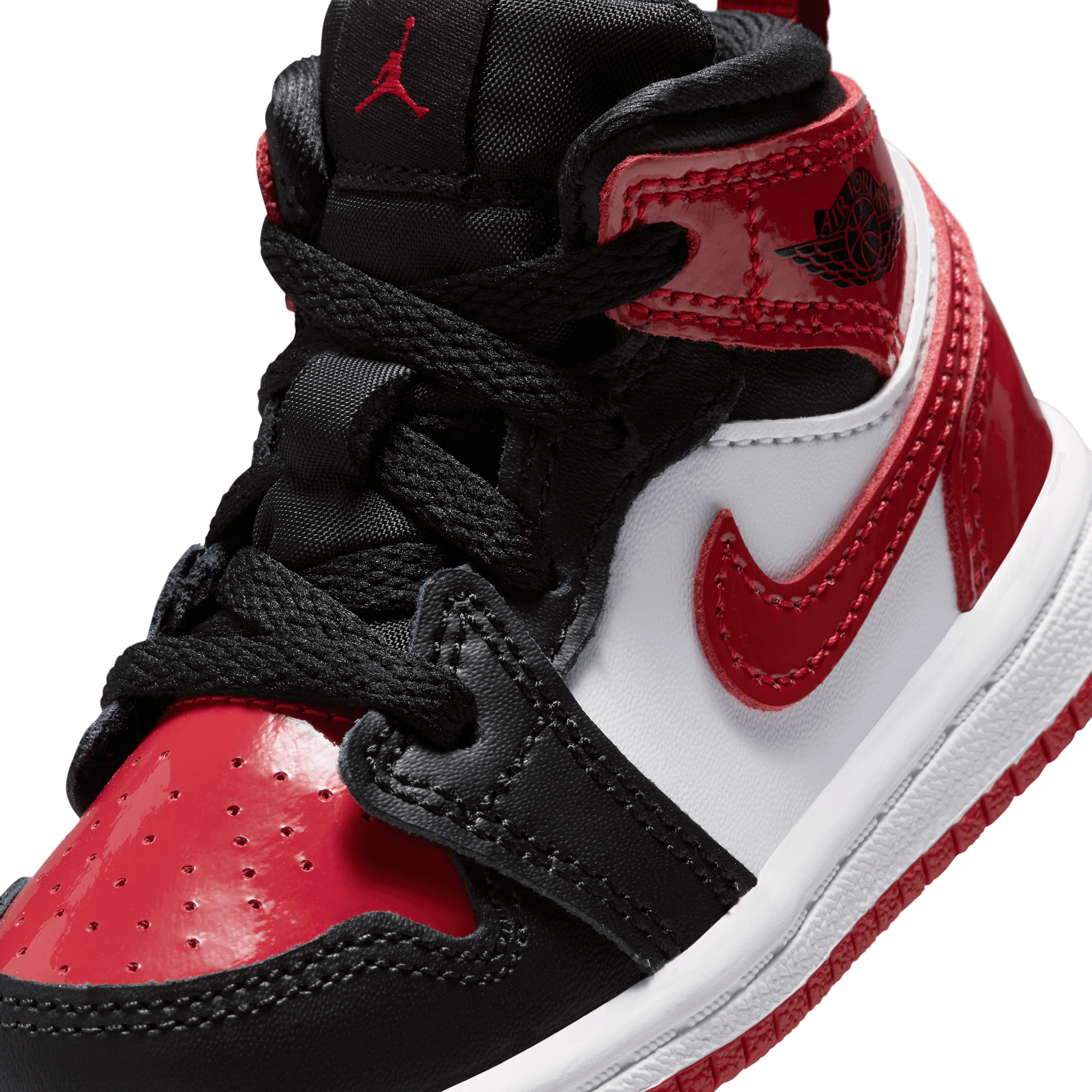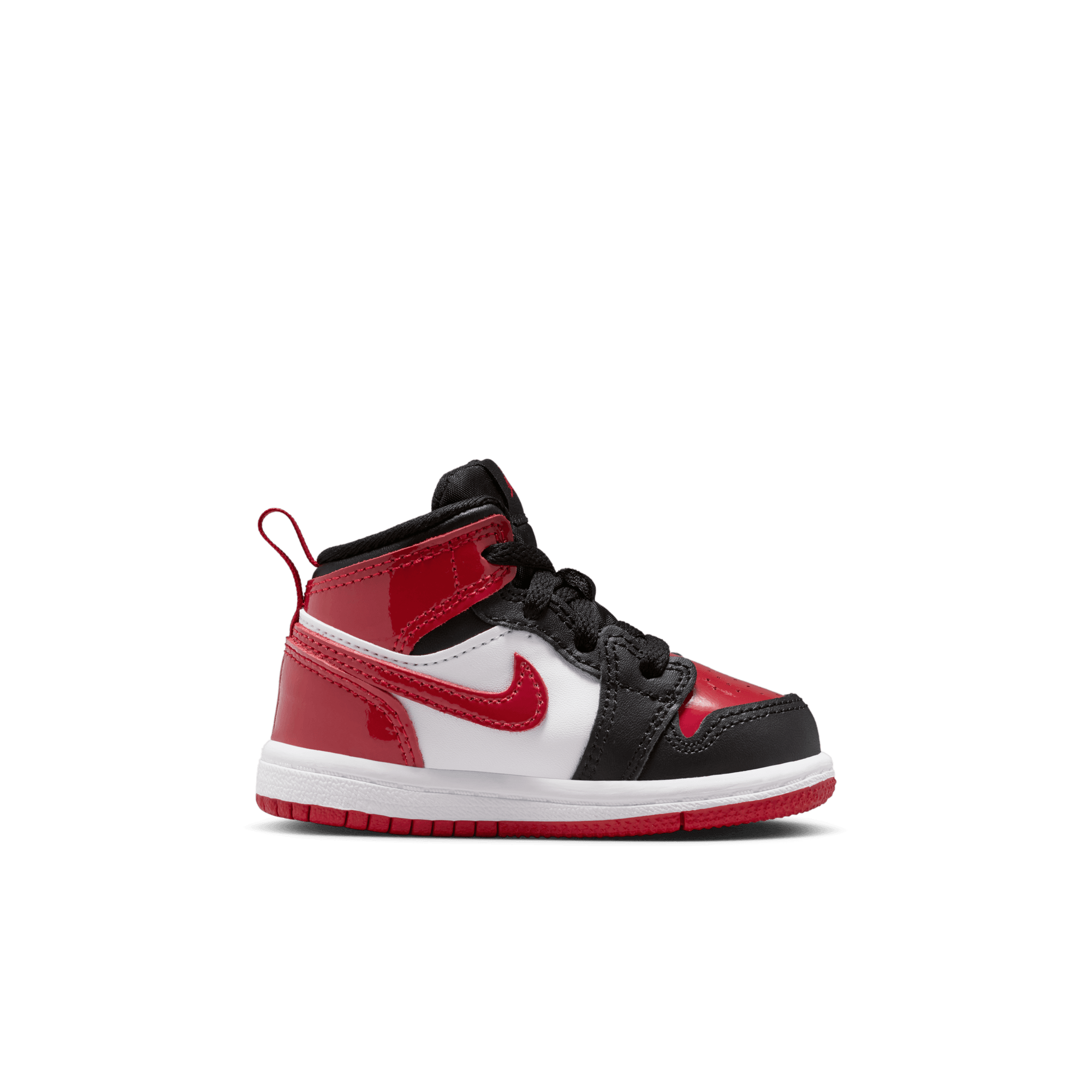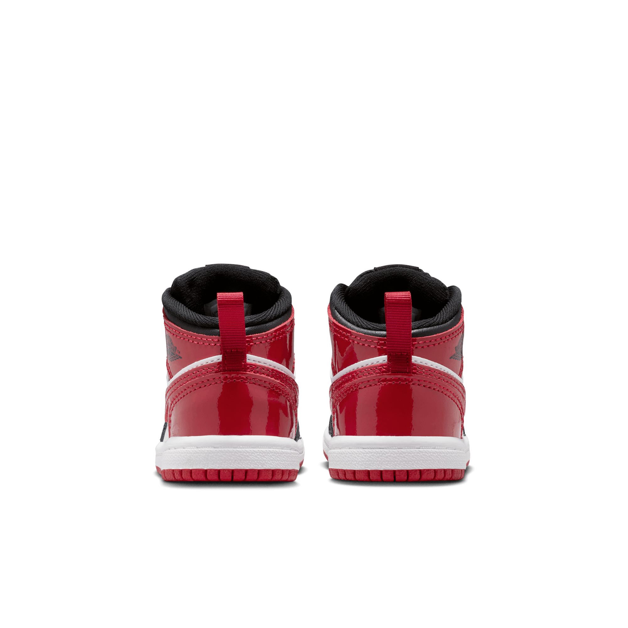 This SE version of the classic silhouette dives back into the ever-present Bulls aesthetic a shiny twist on the Air Jordan 1 Mid SE "Patent Bred Toe". The classic style adds luxurious red patent leather to its white and black smooth leather upper, mimicking the blocking of the iconic "Bred" on the toe. It's accented with a black tongue tag, laces and lining, talong with black Wings logo on the ankle. A white midsole and red rubber outsole finish off the look of this AJ1 Mid.
