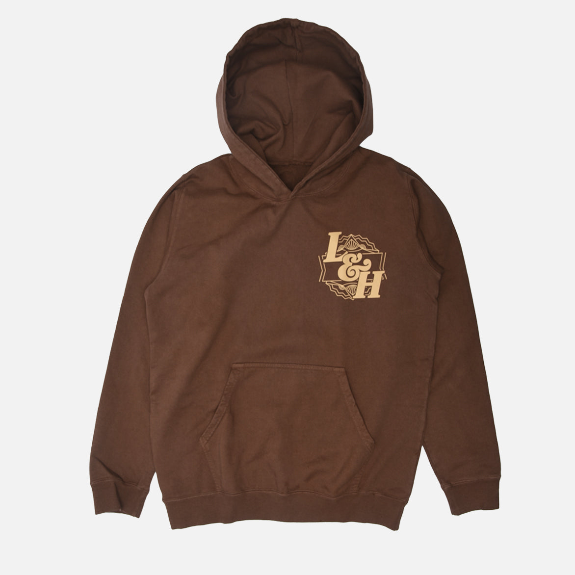 The next installment of our elevated Fundamentals project with our homies from the left coast, Standard Issue, is here to celebrate one of the most OG classic combos in fashion and food: the STANDARD ISSUE FOR LAPSTONE "BEEF & BROCCOLI". The Standard Issue for Lapstone Hoodie "Beef" is made from brown, 24oz., 100% French terry cotton that is pre-shrunk and garment dyed for that classic Standard Issue fit. It features our new '70s-inspired LH logo printed in cream on the left chest, cordless hood, kangaroo pocket and ribbed cuffs and hem. Cut, sewn, dyed and printed in California.