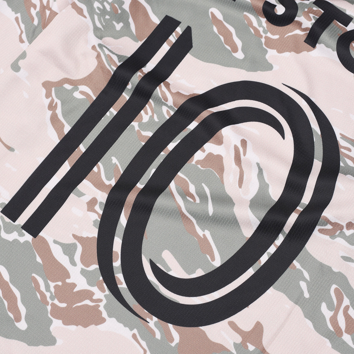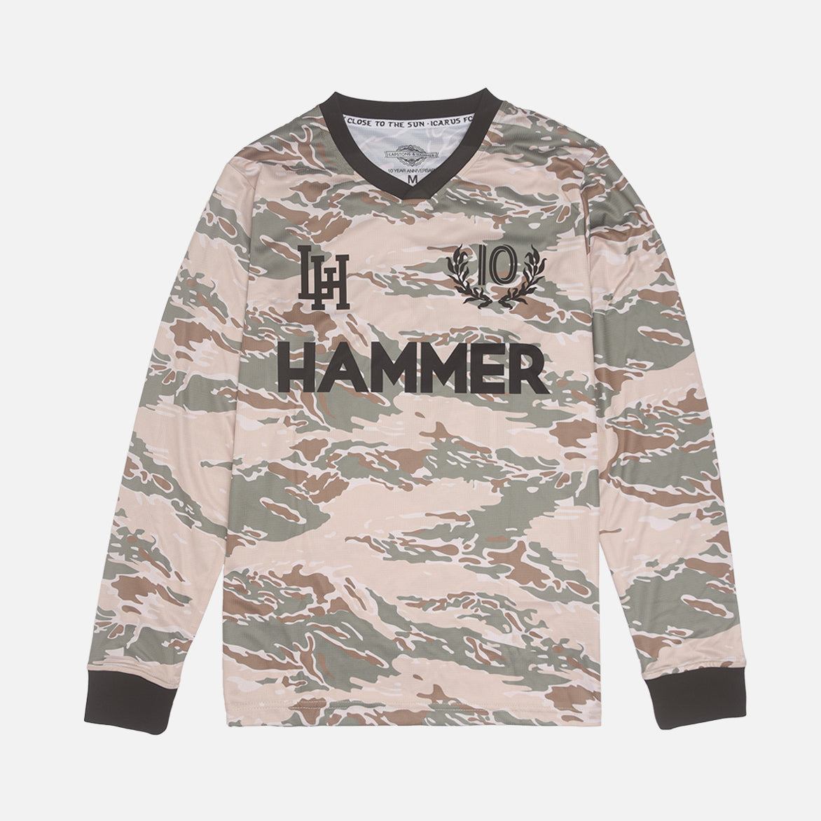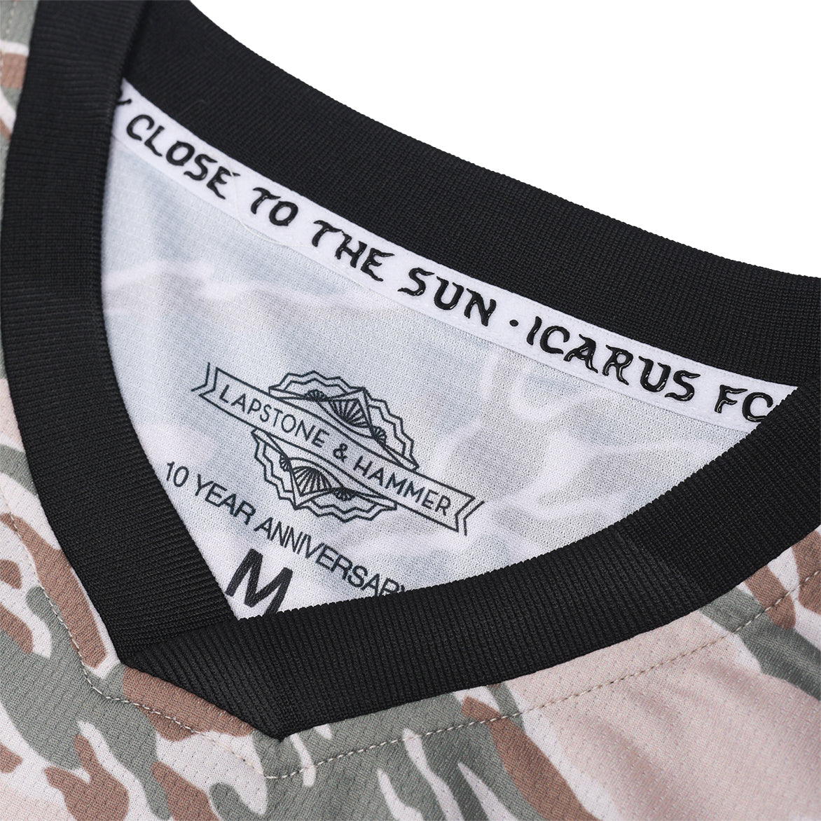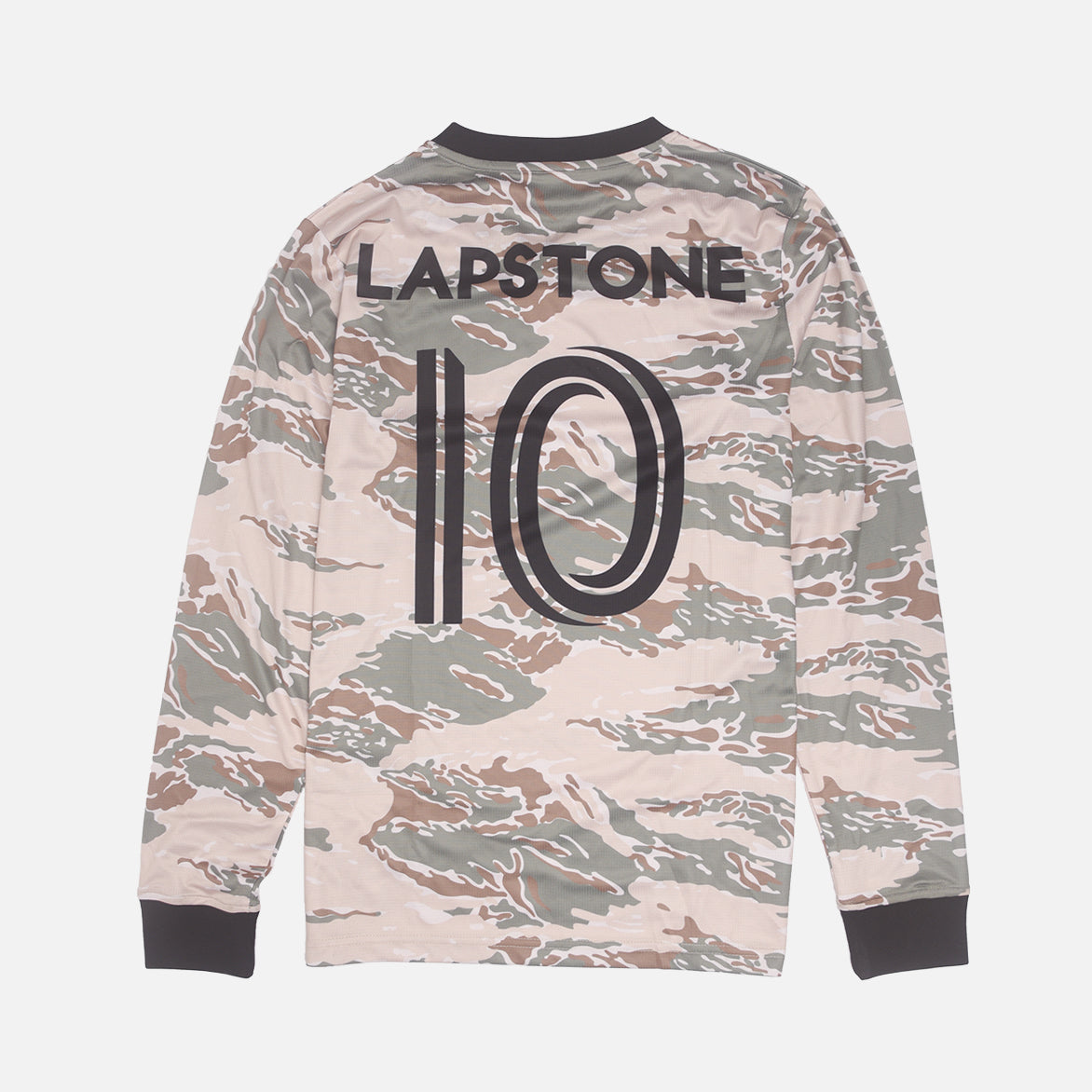 To kick off our Ten Year anniversary celebration, we’re thrilled to present the LAPSTONE "10 YEAR" Apparel collection featuring this "10 YEAR" camo long sleeve soccer jersey. For our “10 YEAR” apparel capsule, we partnered with Icarus Football, a Philadelphia-based designer and manufacturer of custom soccer uniforms, to create two special edition kits. The Camo Long Sleeve kit features a sublimated custom woodland camo print flipped to a desert camo color combination. The front of the jersey features black silicone patch appliqué's on both the classic LH Interlock and 10 Year Laurel, while the hosts silicone appliqués of Lapstone above a large 10. The collar is a standard V Neck. Relaxed fit- 100% Polyester