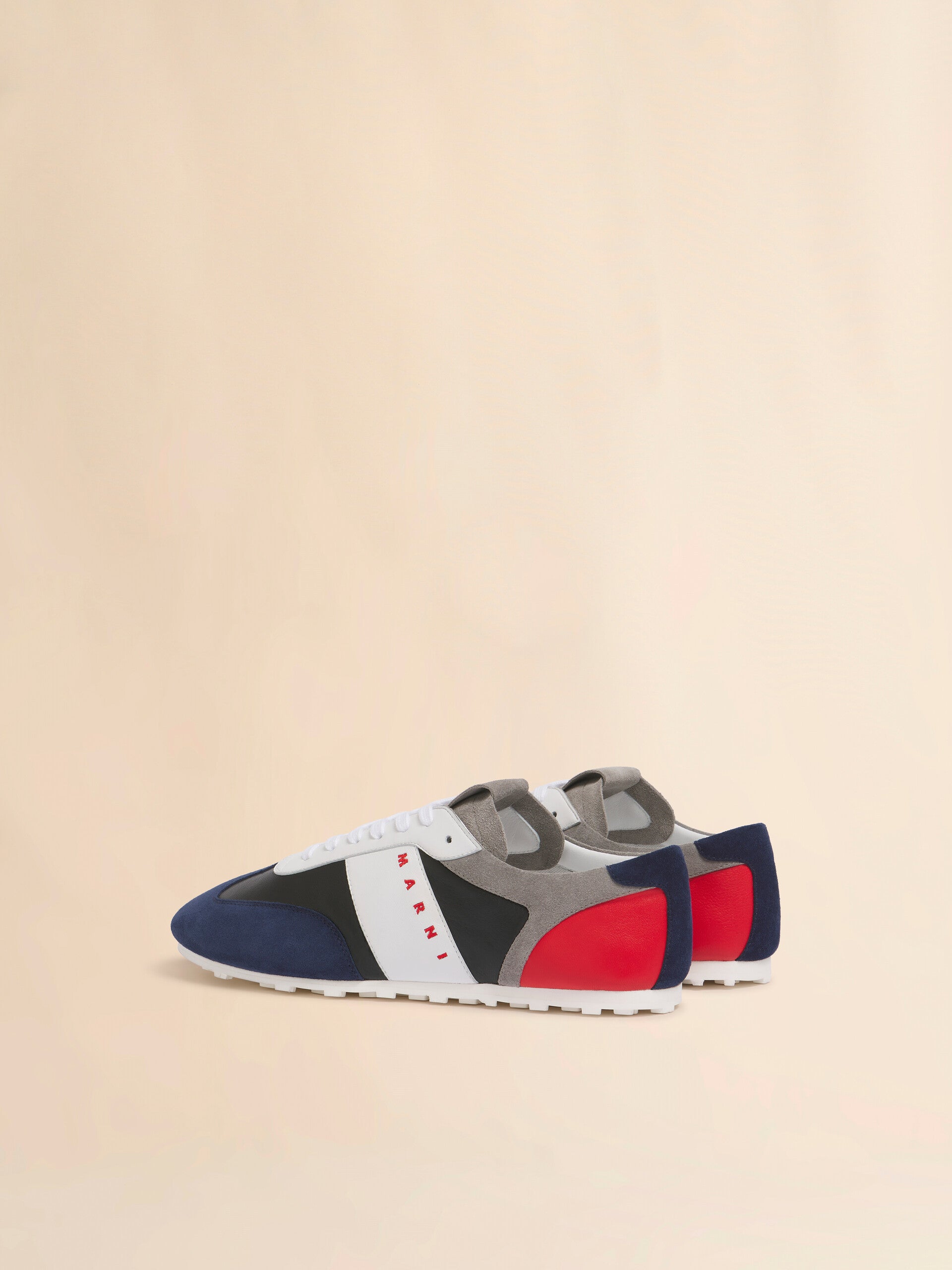Low-top sneaker made from contrasting panels of nappa leather and suede. Inspired by retro football styles and designed to offer slipper-like comfort. Flexible rubber outsole and deconstructed, unlined upper. Red Marni logo on the side and logo grommets. Made in Italy.