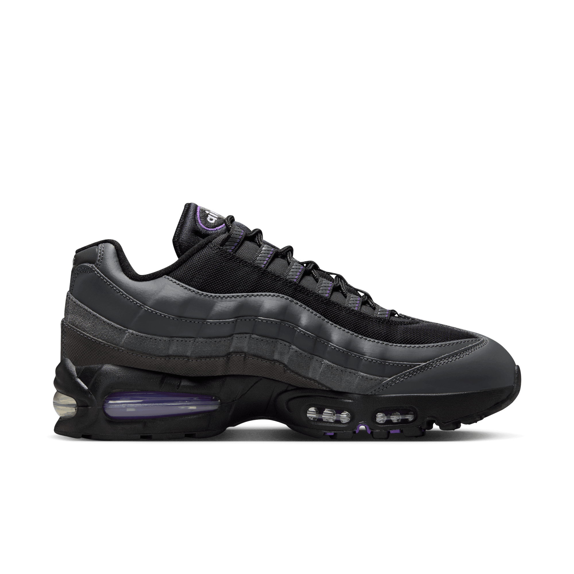 The Air Max 95 continues its 30th anniversary celebration with this dark and sleek version of their OG "Big Bubble" design: the Air Max 95 OG "Black/Iron Grey". The multi-layered upper uses black as a base color, with grey mesh, suede and leather hitting the wavy stripes below the black mesh saddle. Grey accents the lace loops, embroidered branding on the tongue and heel, and racing-style graphic on the insole. Purple 'Big Bubble' Max Air units located in the forefoot and heel of the chunky black midsole, and a purple and black rubber outsole complete the design.