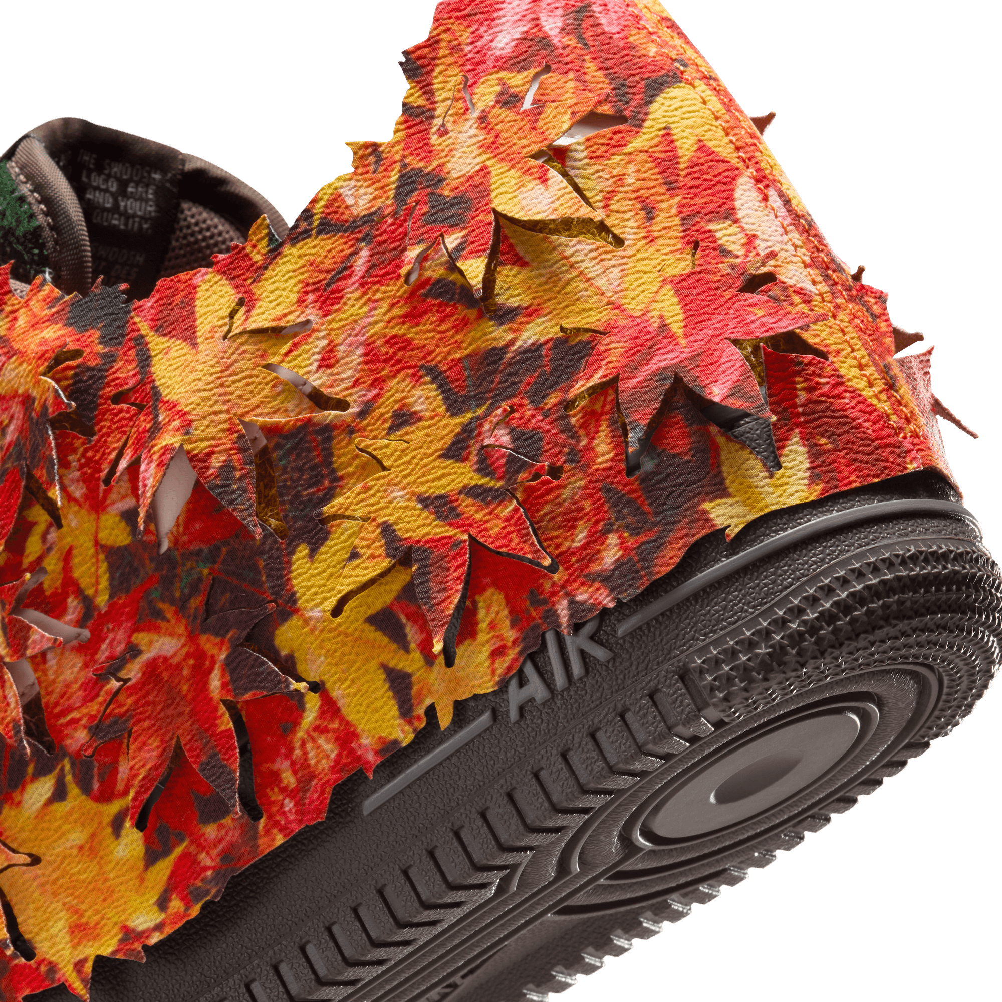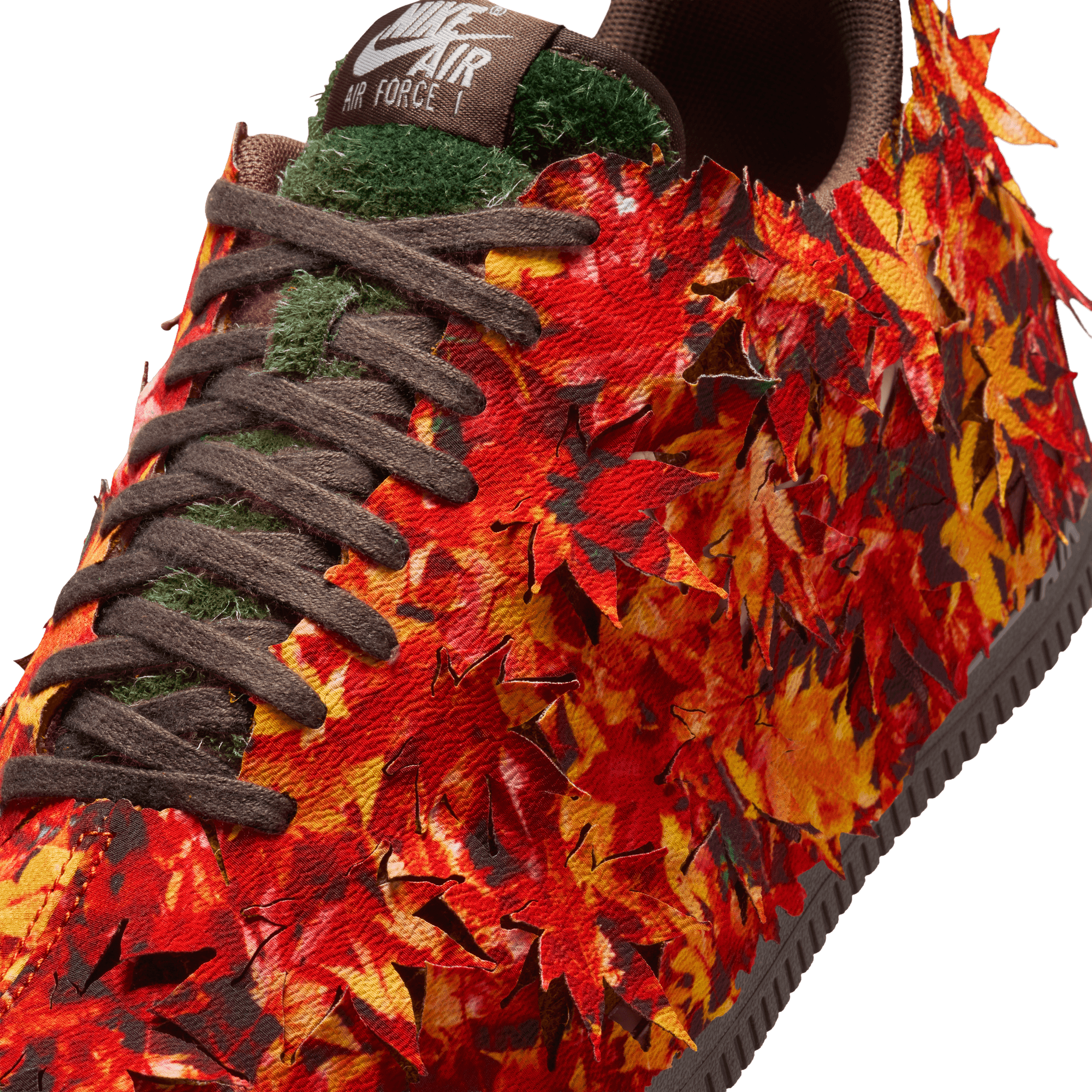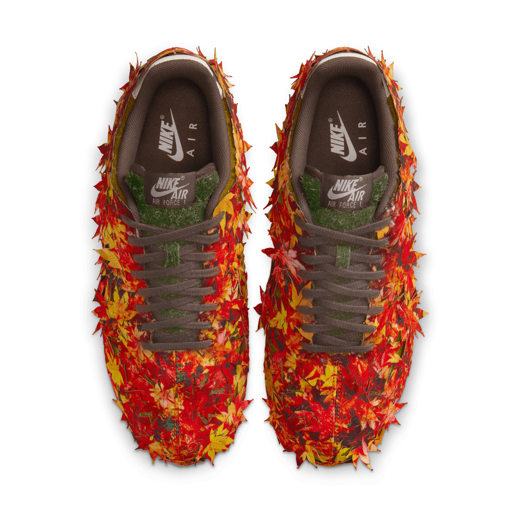 Get the rake! Nike has gone over the top celebrating the change of seasons on the Air Force 1 '07 LX "Autumn Leaves". The Air Force 1 has been known to host some truly crazy design concepts, but this one just might top them all. The iconic silhouette is covered in a multi-hued leaf-print motif bursting with reds and yellows throughout. This cover is designed to tearaway in places, revealing a brownish green moss-like hairy suede upper beneath, artfully representing the decay of fallen leaves into the forest floor. A dark green grassy tongue, white leather swoosh and heel tab, and a dark grey Nike Air sole unit finish off the daring seasonal design.