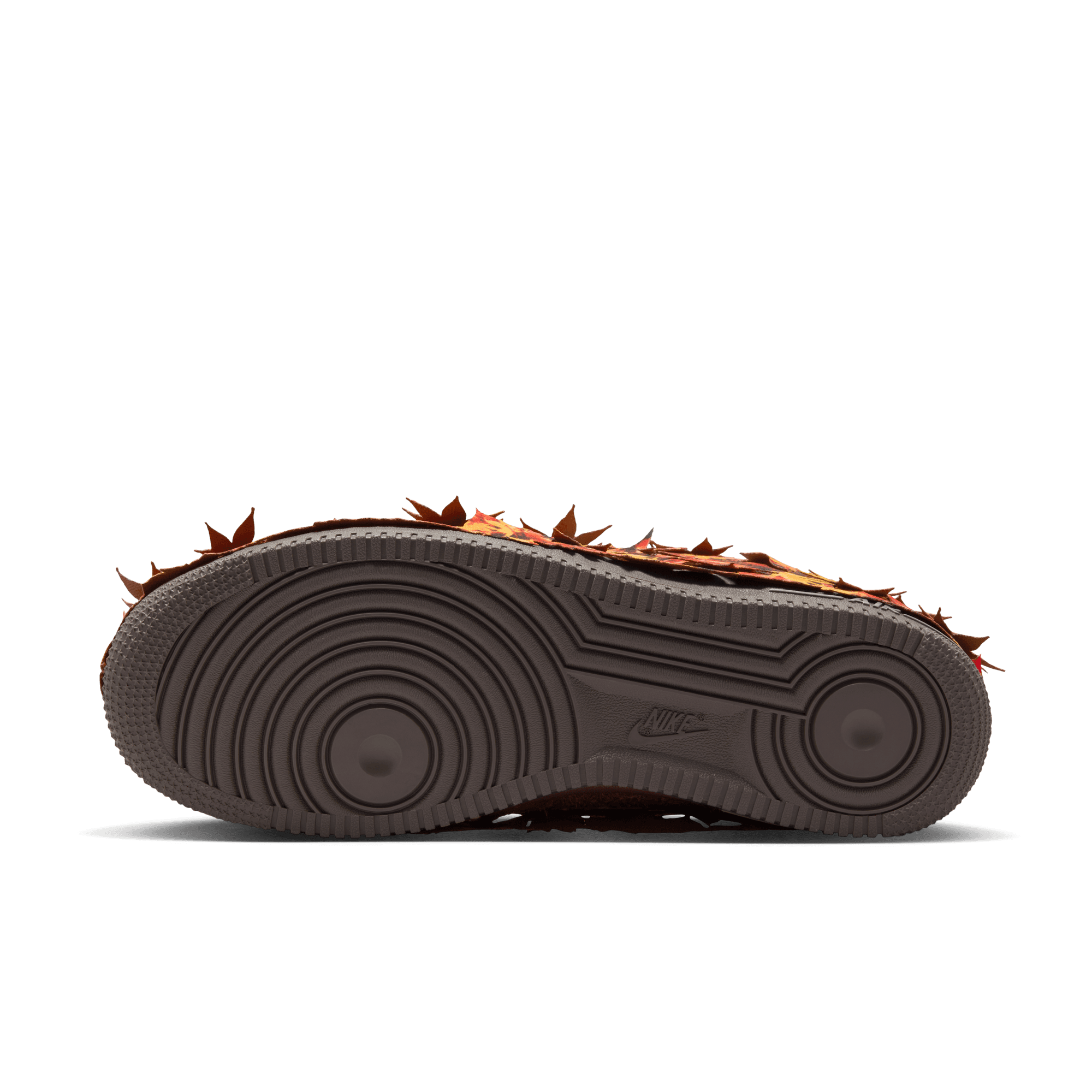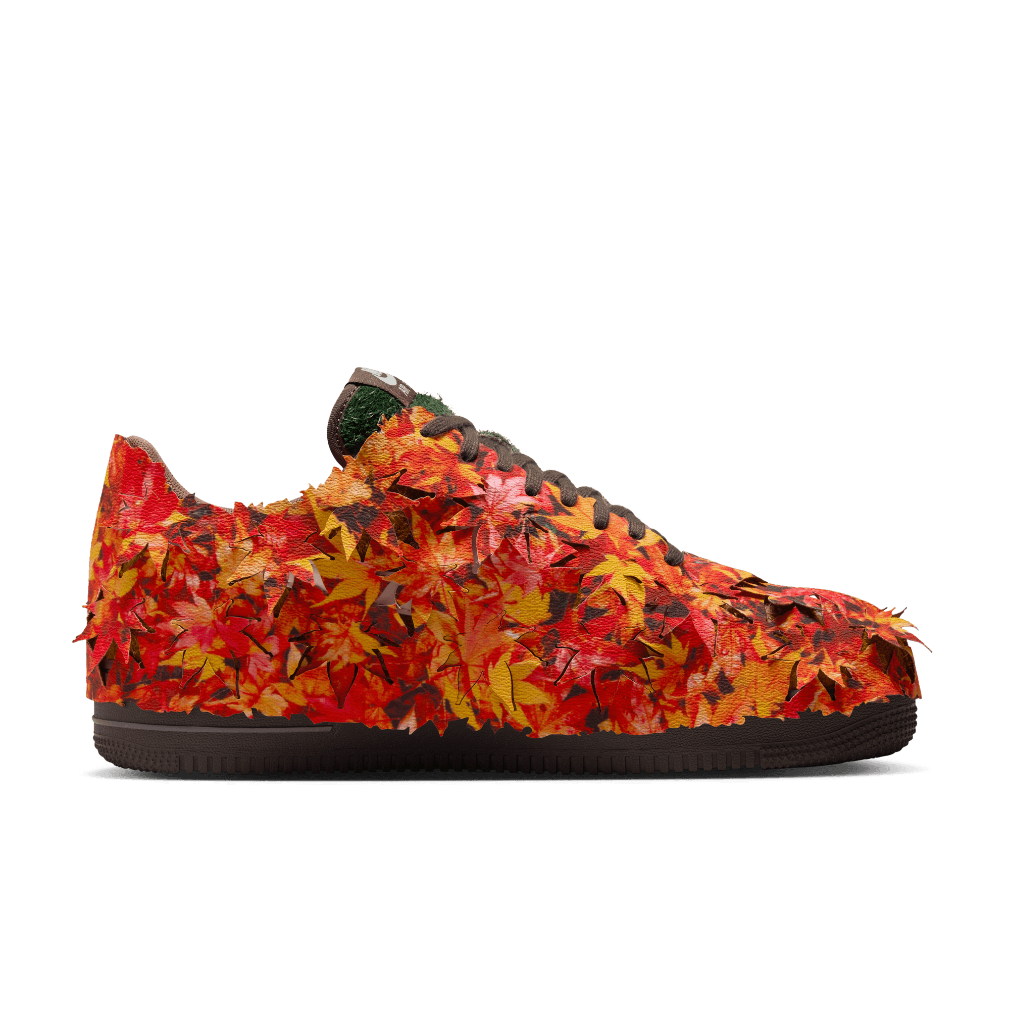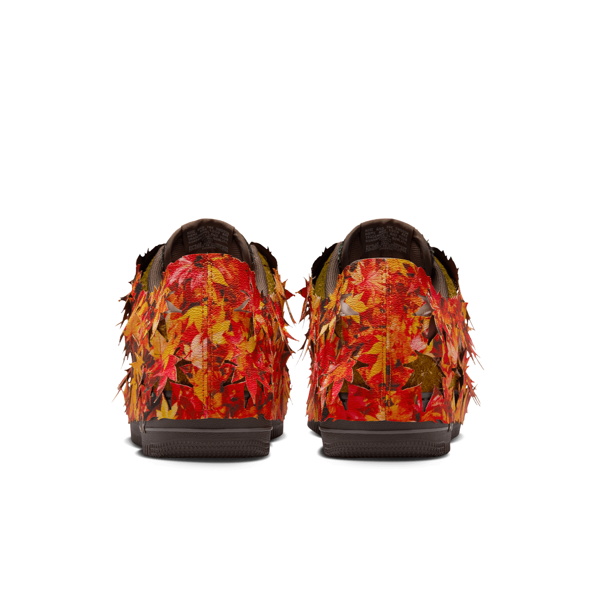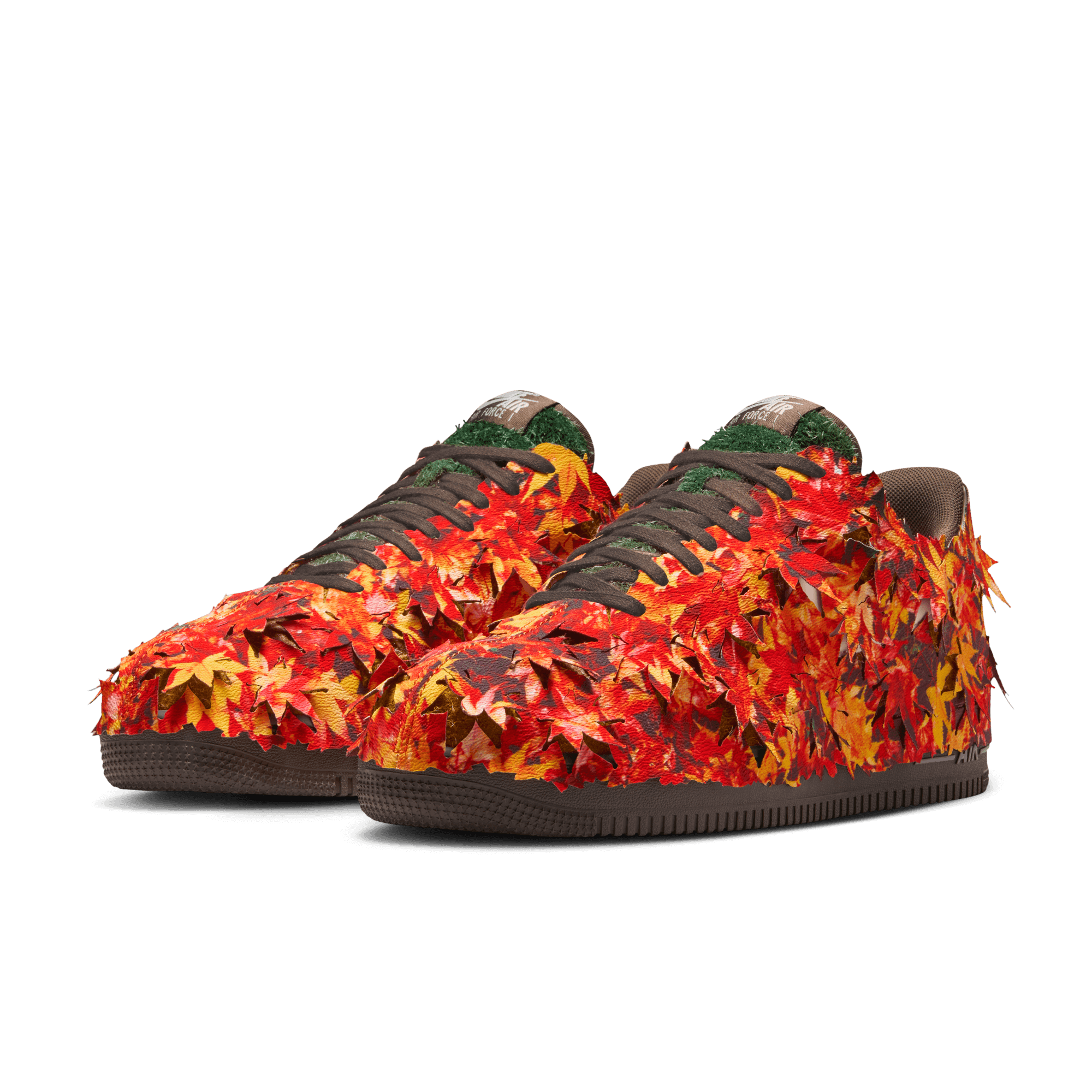 Get the rake! Nike has gone over the top celebrating the change of seasons on the Air Force 1 '07 LX "Autumn Leaves". The Air Force 1 has been known to host some truly crazy design concepts, but this one just might top them all. The iconic silhouette is covered in a multi-hued leaf-print motif bursting with reds and yellows throughout. This cover is designed to tearaway in places, revealing a brownish green moss-like hairy suede upper beneath, artfully representing the decay of fallen leaves into the forest floor. A dark green grassy tongue, white leather swoosh and heel tab, and a dark grey Nike Air sole unit finish off the daring seasonal design.