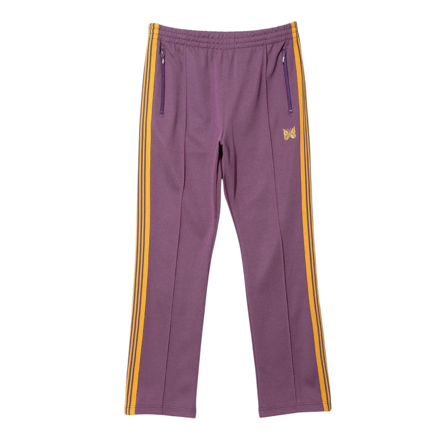 Japanese brand Needles has perfected the iconic look of retro street style with their Narrow Track Pant Poly Smooth. The 100% polyester pants inhabit the classic "3-Stripes"-style aesthetic in new colorways for SS25, with purple polyester jersey material that features gold striped taping at the sides, two vertical zip hand pockets and single rear zip pocket. The narrow fit pants are finished with an elasticated drawstring waistband and signature gold rayon butterfly embroidery. Made in Japan