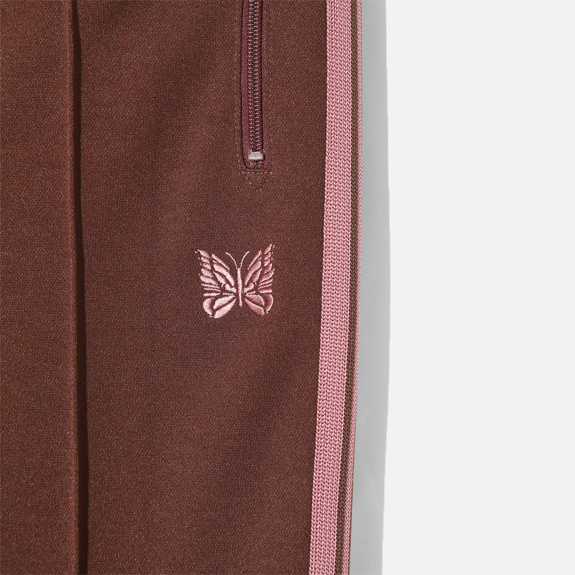Japanese brand Needles has perfected the iconic look of retro street style with their Narrow Track Pant Poly Smooth. The 100% polyester pants inhabit the classic "3-Stripes"-style aesthetic in new colorways for FW25, with brown polyester jersey material that features pink striped webbing at the sides, two vertical zip hand pockets and single rear zip pocket. The narrow fit pants are finished with an elasticated drawstring waistband and signature papillon logo embroidery at the hip. Made in Japan