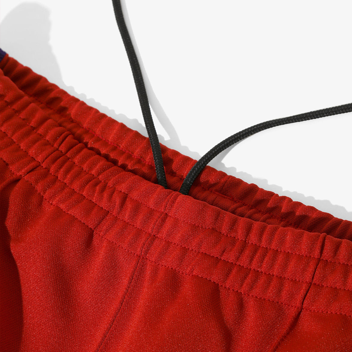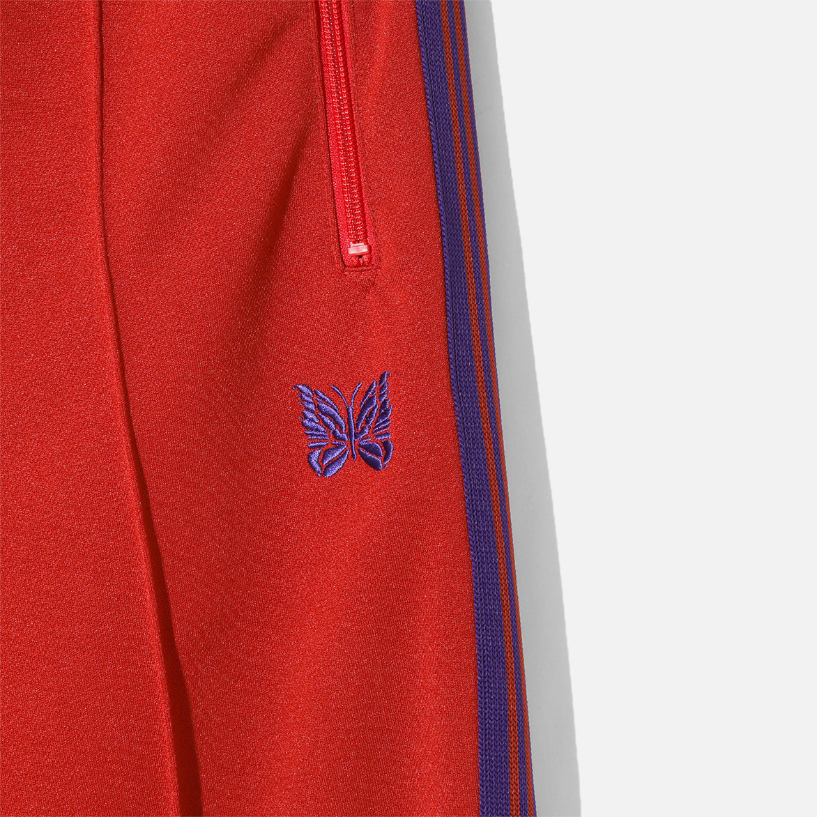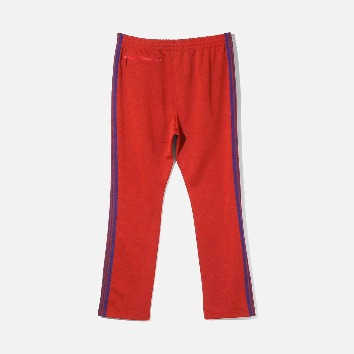 Japanese brand Needles has perfected the iconic look of retro street style with their Narrow Track Pant Poly Smooth. The 100% polyester pants inhabit the classic "3-Stripes"-style aesthetic in new colorways for FW25, with red polyester jersey material that features purple striped webbing at the sides, two vertical zip hand pockets and single rear zip pocket. The narrow fit pants are finished with an elasticated drawstring waistband and signature papillon logo embroidery at the hip. Made in Japan