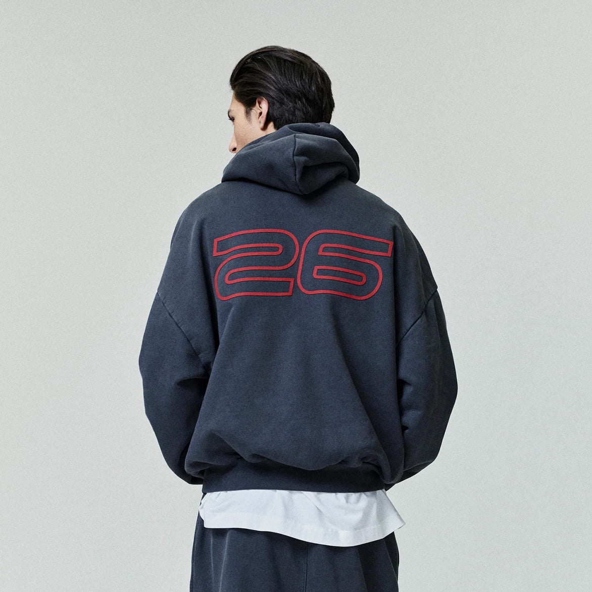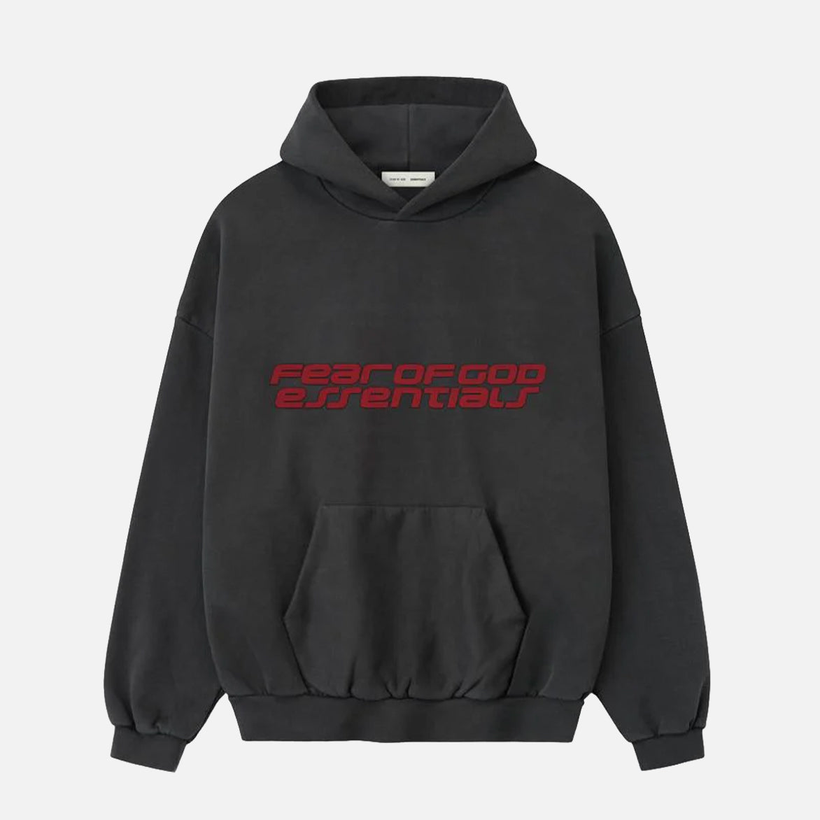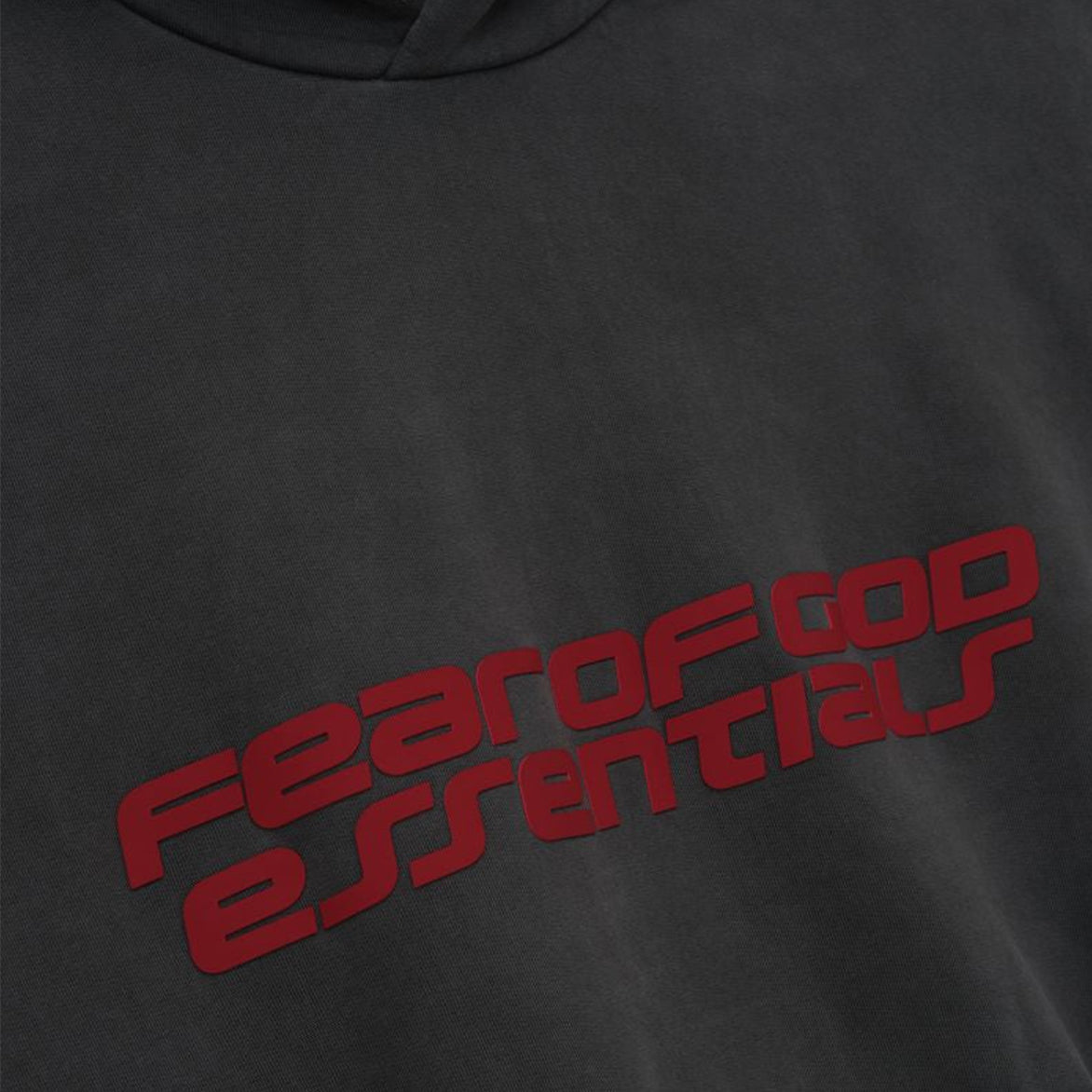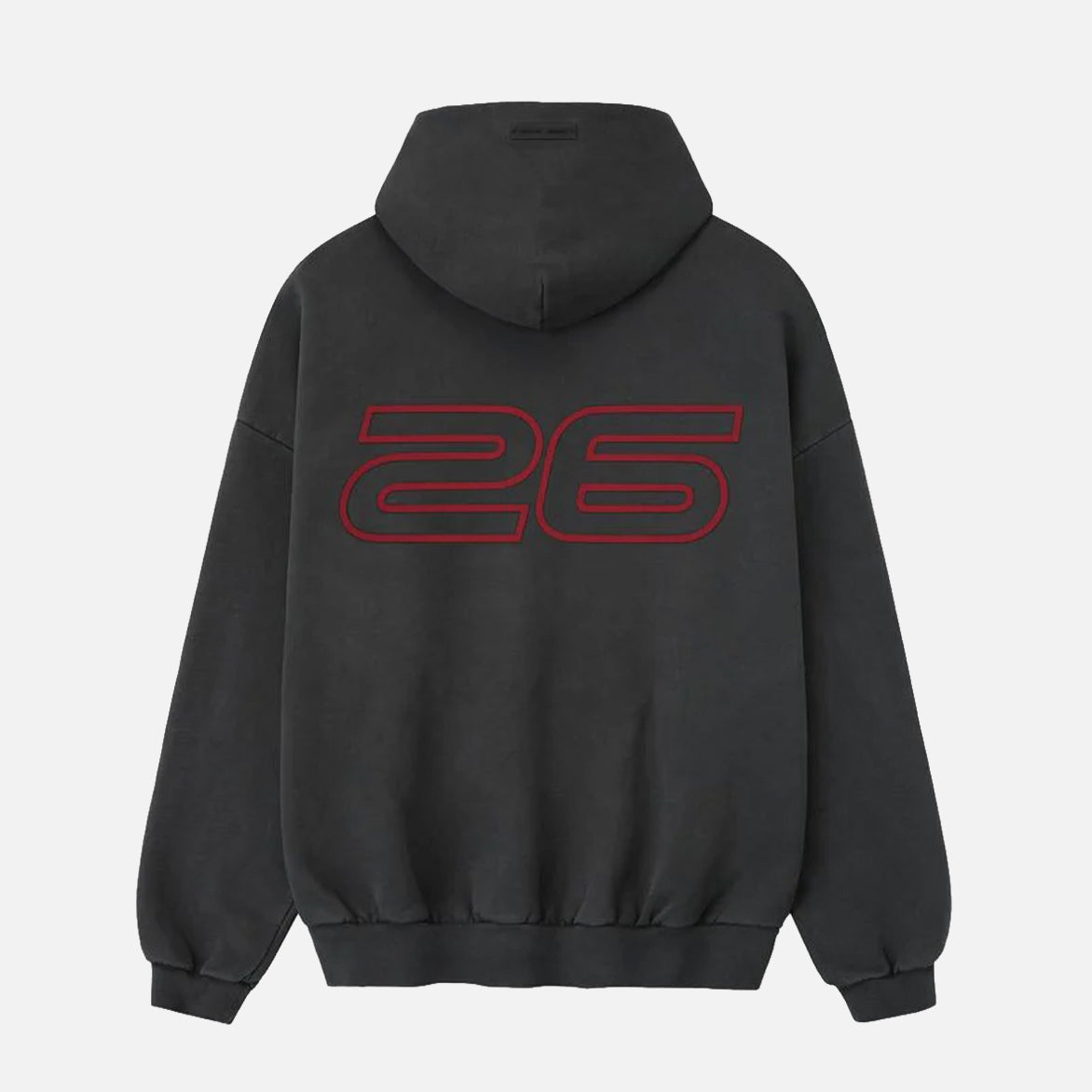The Heavy Fleece Hoodie is crafted from 520gsm heavy fleece and treated with a pigment dye to create rich depth of color. Designed in an oversized 90s-inspired silhouette, it features exaggerated proportions with dropped shoulders for a relaxed drape. The hoodie is defined by HD-printed graphics—“Fear of God Essentials” logo on the front and “26” on the back. Finishing details include a kangaroo pocket, rib-knit cuffs, waist-hem and a Fear of God Essentials rubberized label stitched on the hood.