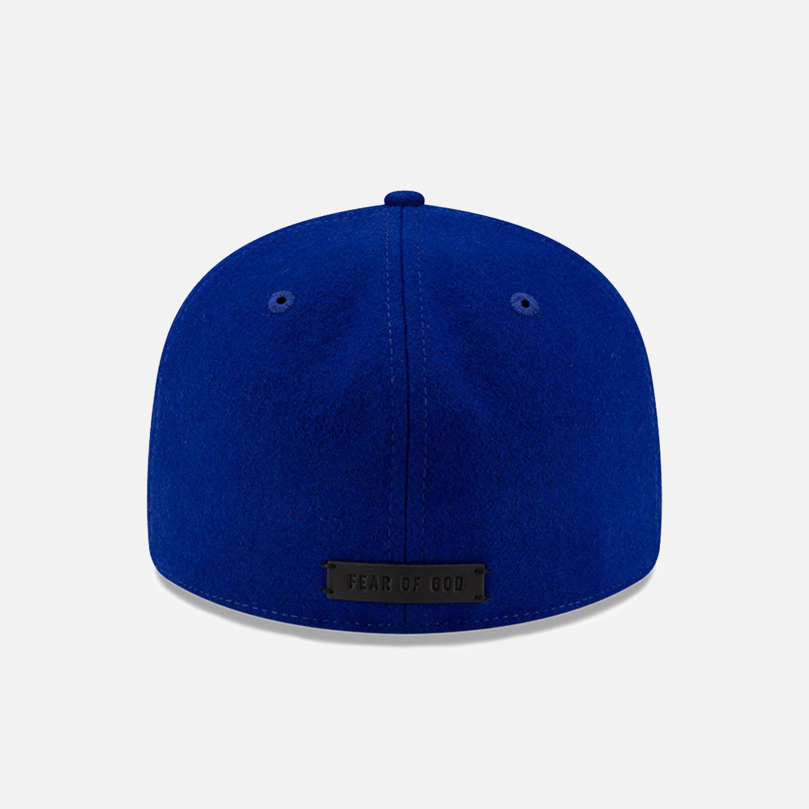 The Fear of God Essentials x MLB LA Dodgers Wool Retro Crown 59FIFTY Fitted Cap features an embroidered Dodgers logo on the front panels, a New Era script logo at the side, and a Fear of God label at the back. Its heavily textured wool construction and classic green undervisor pay tribute to vintage pro baseball caps.