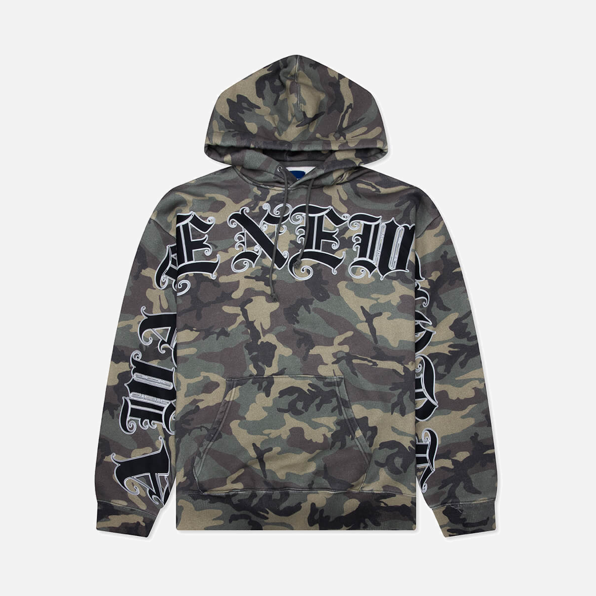 Washed cotton pullover hoodie with printed graphics on the arms and chest, and front pockets. Made in USA.