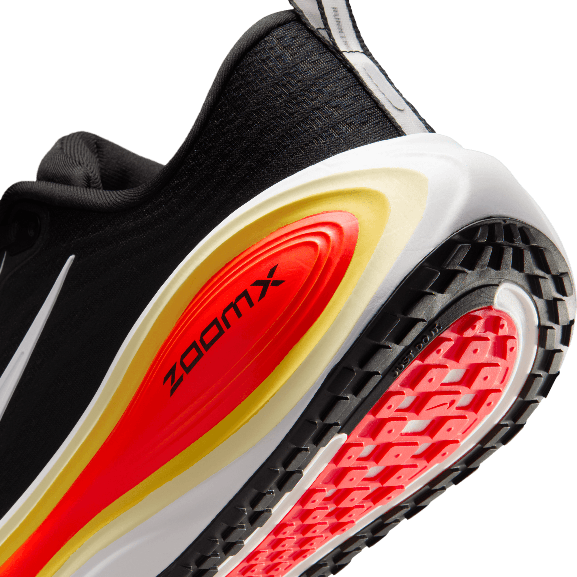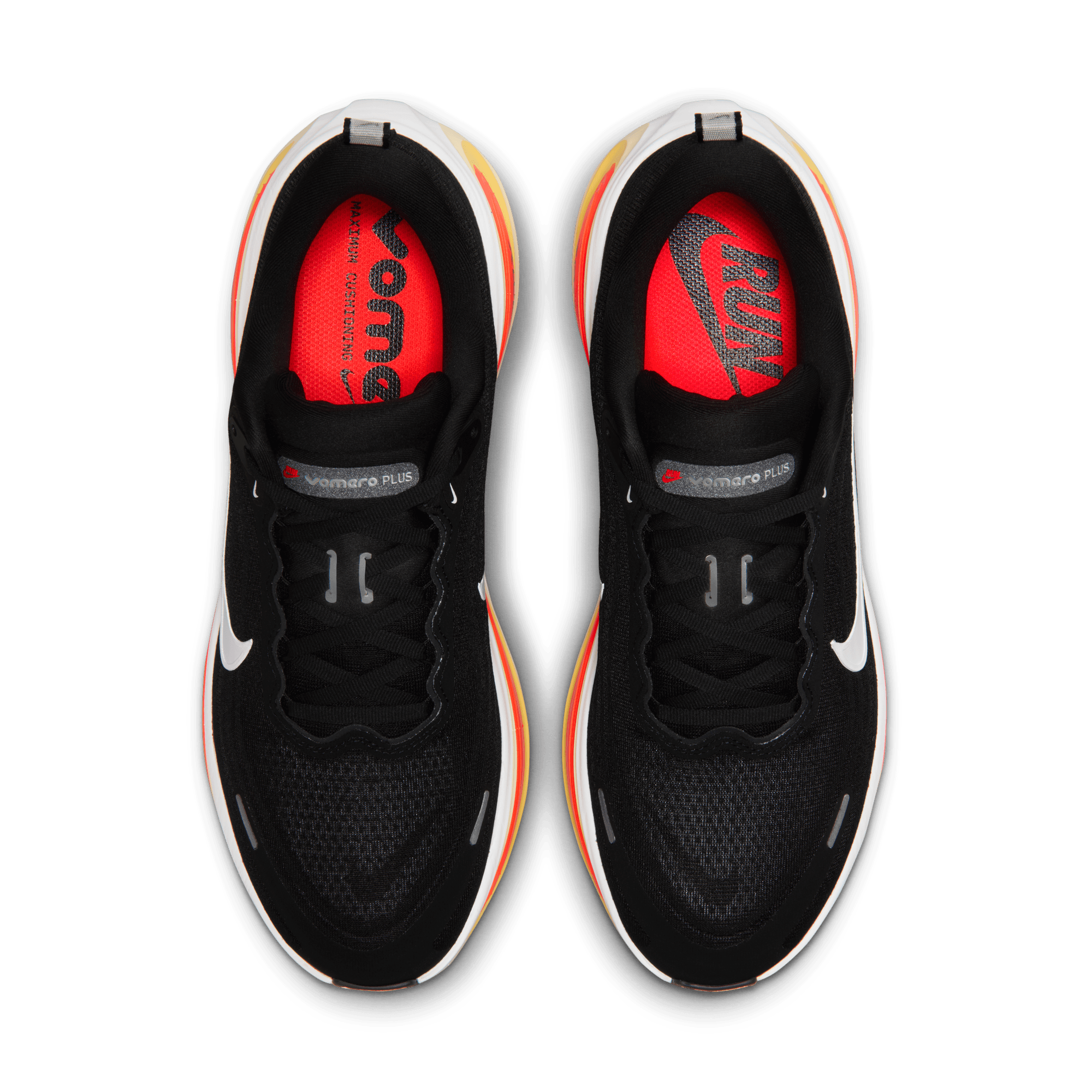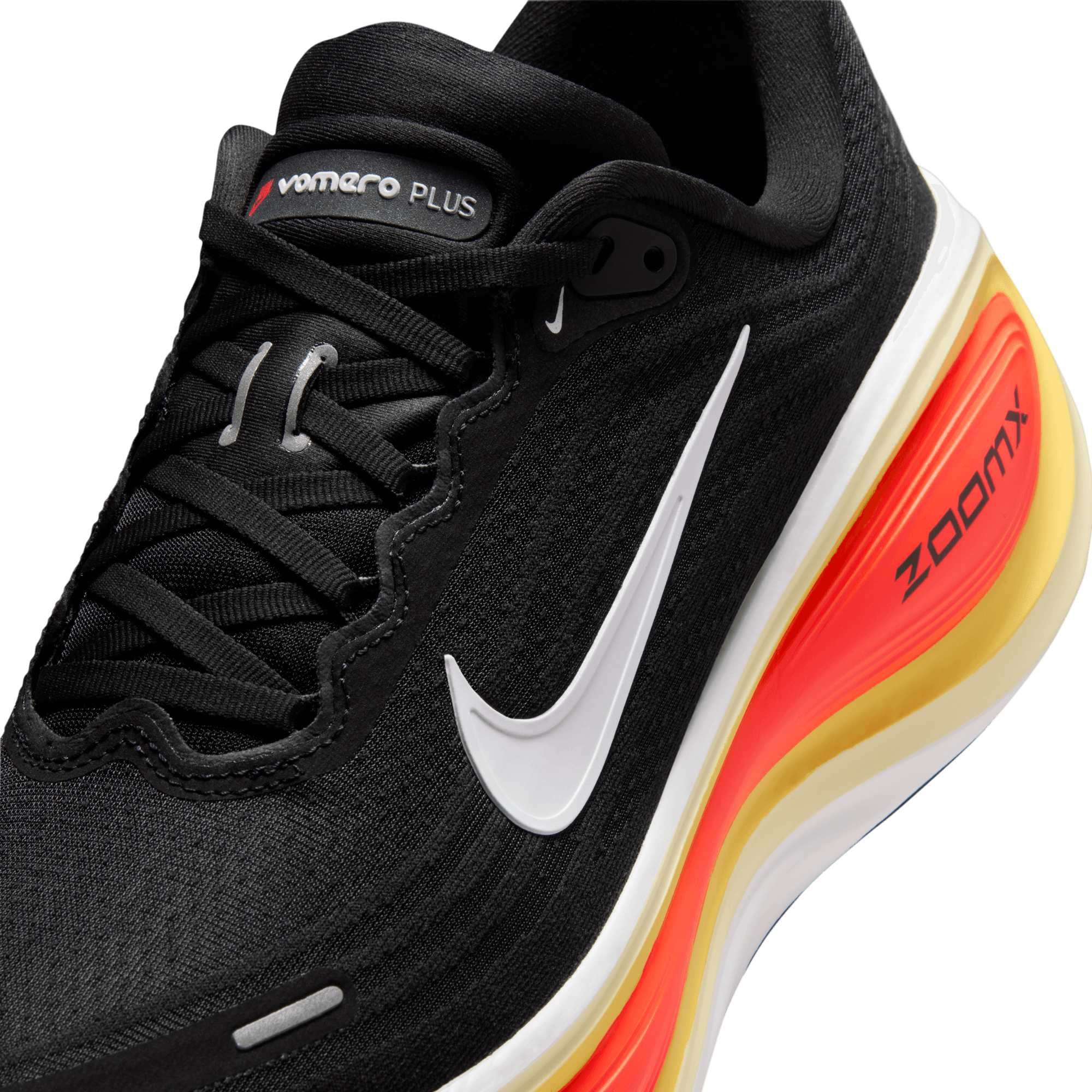 Take maximum cushioning to the next level with the next evolution of Nike's premier running line on the Vomero Plus. It provides an ultra-comfortable ride for everyday runs thanks to a mountainous stack of bright orange full-length ZoomX foam, the most responsive foam in the industry. Plus, the black engineered mesh upper is made from soft, breathable yarn for a comfortable fit. Tonal laces, lining and pulltabs; white branding on the toe, sides, insole, tongue and pull tabs; and a high abrasion rubber white and orange outsole completes the design.