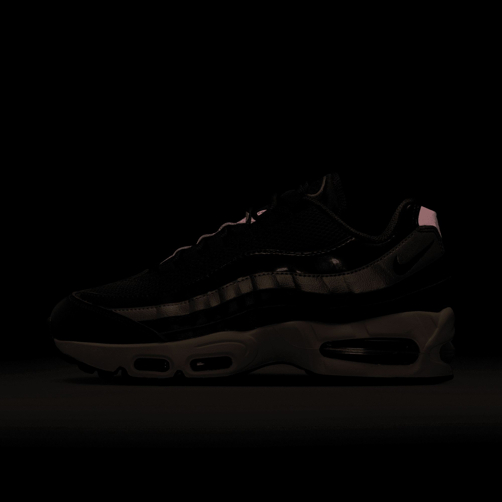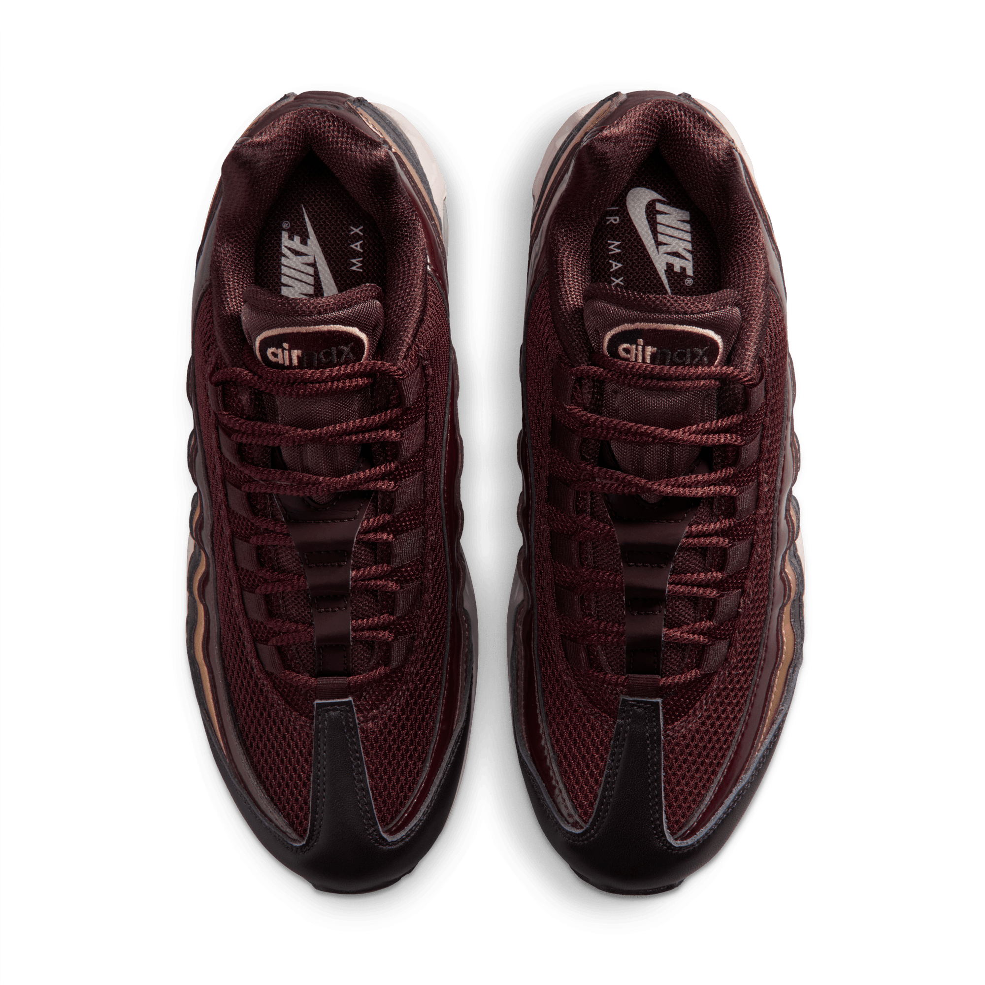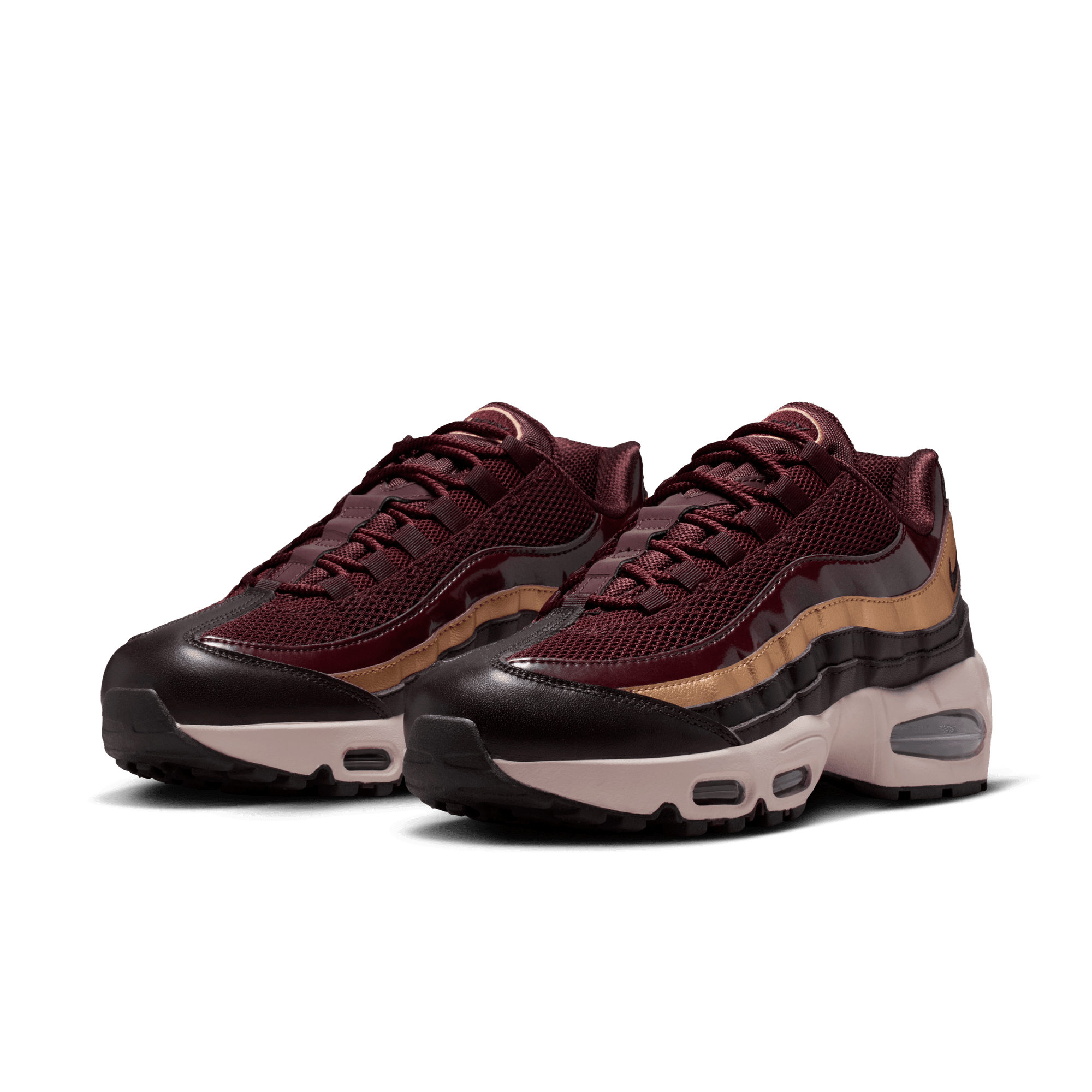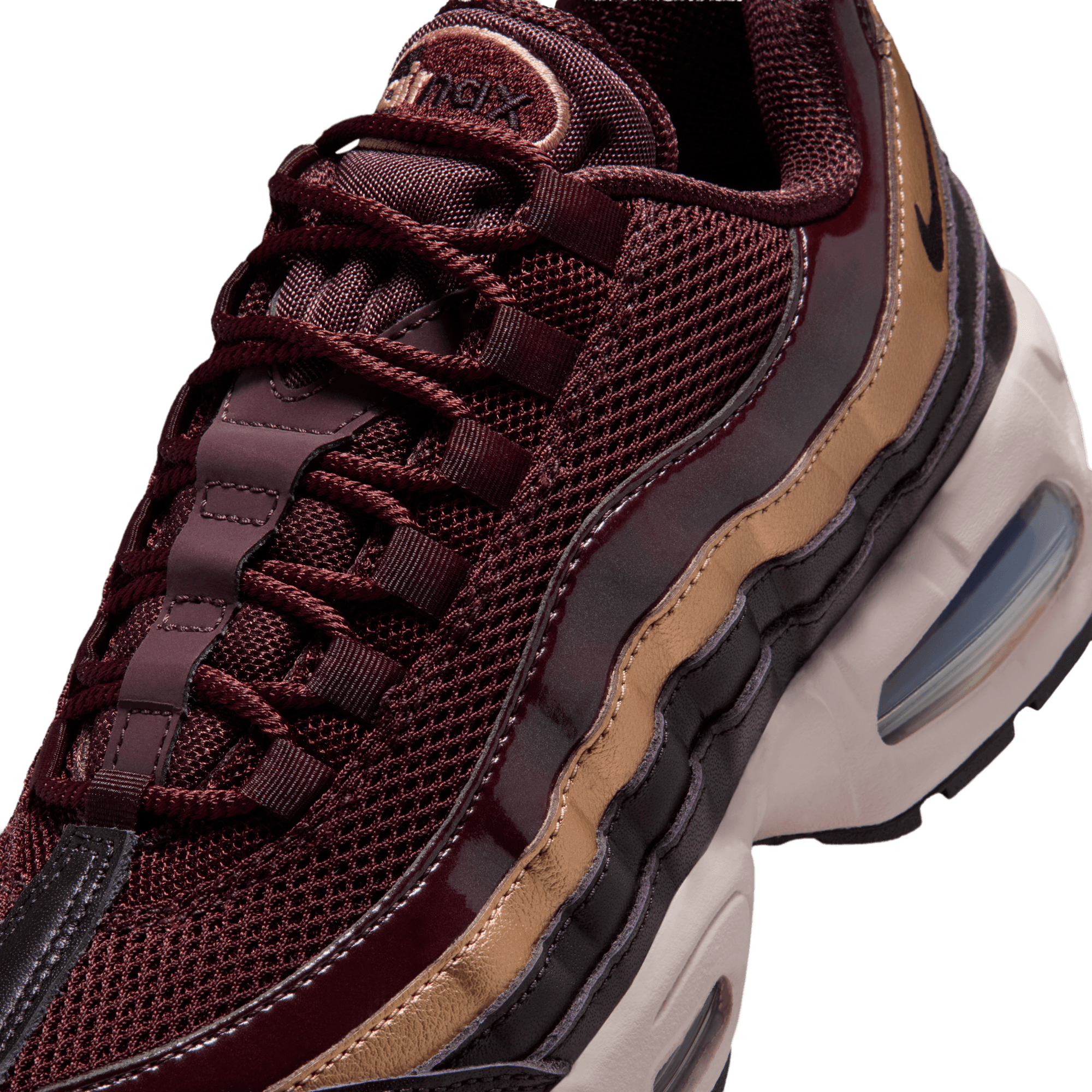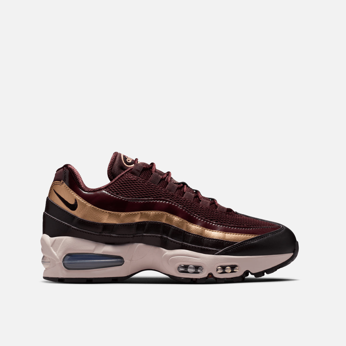The Air Max 95 continues its 30th anniversary celebration this dark and luxurious women's exclusive version of the OG "Big Bubble" design: the WMNS Air Max 95 SE "Burgundy Crush". The multi-layered upper mixes materials on the it's signature wavy panels with patent leather burgundy, metallic gold textured leather and dark full grain burgundy leather. Burgundy also hits the mesh saddle with a black leather toe cap, burgundy accents on the branding , eyelets, laces, and lining detailing the upper. The aforementioned bigger Max Air units located in the forefoot and heel of the chunky white midsole contain a blue hue, while the shoe's original PSI markings are listed on the bottom of the Max Air unit on the black rubber outsole.